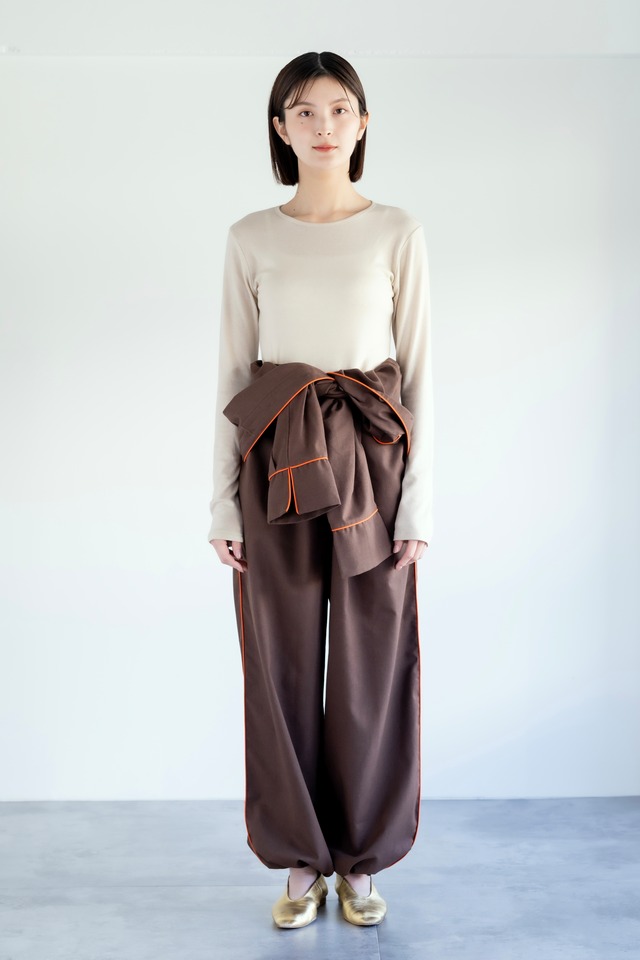 Size : Free Color : 焚火 -takibi- コックリとしたダークブラウンに、ビビットなオレンジ。一見挑戦色と思いきや、どこかほっと落ち着くカラー。 今年の春夏は、ストーリーズでのアンケートやお客様のお声をもとに、過去の人気カラーを復刻することにいたしました♪ 2022年発売のものは、秋冬用のあたたかなコットンフランネル生地を使用していましたが、2025年は春夏にぴったりな、コットンリネン生地になって再登場です。 お家でのリラックスタイムはもちろん、 春夏のレジャーシーンの楽しさが、さらに増すようなエネルギッシュなカラーです。 --------------------------------------------------- 〈About "my jumpsuit"〉 お馴染みのパイピングパジャマが、ジャンプスーツに変身。 マルチwayで着るシーンを選ばない、楽ちんなジャンプスーツ。 そのまま着るもよし。ウエストを絞るもよし。裾を絞るもよし。袖をまくるもよし。胸元を開くもよし。腰で縛りパンツスタイルで着るもよし。 生活シーンや個性に合わせて様々な着方を楽しめます。 家でもお洒落かつ快適に過ごせて、そのまま外出もできます。 旅のおともにもぴったりな一枚です。 〈Point〉 ・ウエストに絞りがあり、丈調節可能。スタイルアップ効果もございます。 ・裾(すそ)が絞りがあり、丈調節可能。すそ汚れ防止にも便利です。 ・低身長さんも高身長さんも安心。150cm前後〜170cm前後の方まで、幅広い身長の方にご対応可能なサイズです。 ・背面はフラットで、寝心地が良いです。 ・全 6 つのポケットで便利です。 ・袖(袖口)の大きな切り込みがポイントです。 ・ウエストのタックでスタイルアップ効果と体型カバーが可能です。 ・シワになりにくく、肌触りがさらりと心地良いコットンリネン生地を使用。通気性が良く、暑い日も快適にお過ごしいただけます。 〈サイズ詳細〉 総丈 〜145cm(絞りで調節可) 肩幅 52cm 身幅 47cm そで幅 23cm そで丈 54cm ウエスト 〜90cm(絞りで調節可) ヒップ 104cm 股上 36cm 股下 71cm もも周り 68cm ひざ幅 31cm すそ周り 〜60cm(絞りで調節可) 〈素材〉 リネン 55% コットン 45% Made in China ※発送について 代金のお支払いが確認でき次第、2〜5日以内に発送いたします。 〜お客様へのお願い〜 ・スムーズにお届けするために、送り先の住所を正確にご入力いただきますようお願い致します。 ・複数回に分けてご注文いただく場合は、送料はご注文ごとのご負担になるため、まとめてのご注文をお勧めいたします。