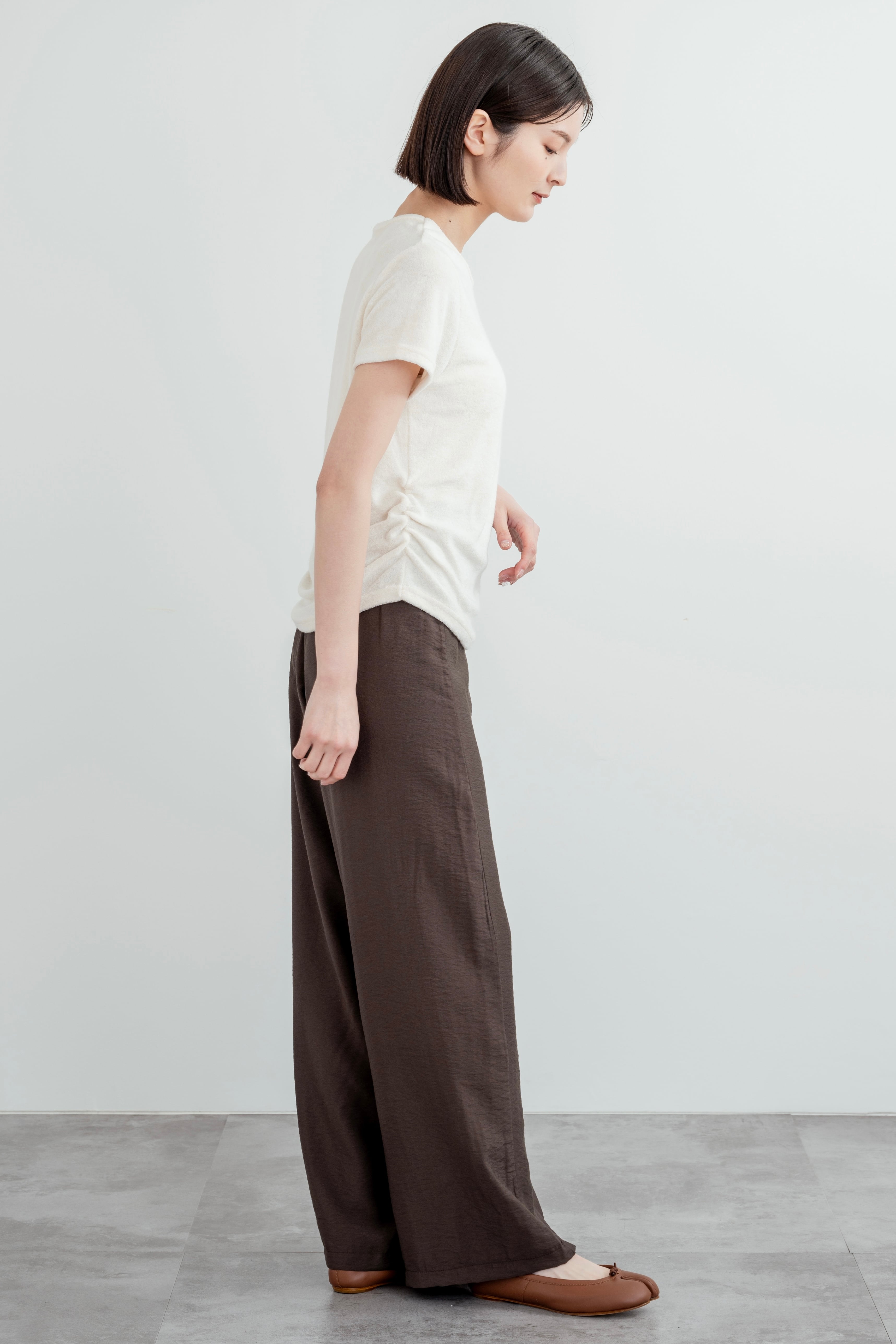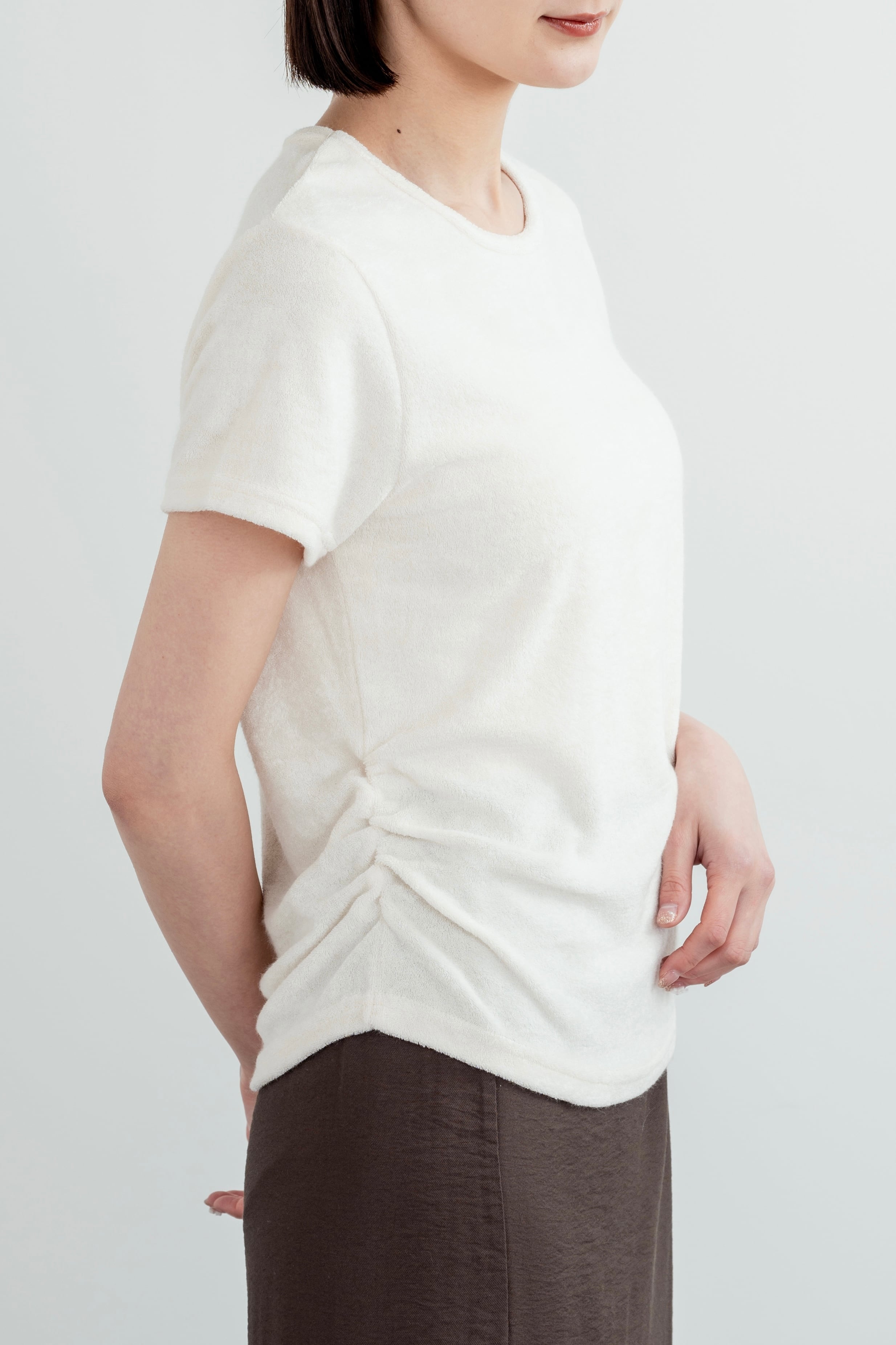 タオルベロア生地のTシャツ。サイドのギャザーがポイントです。肌触りが柔らかく、着心地も◎