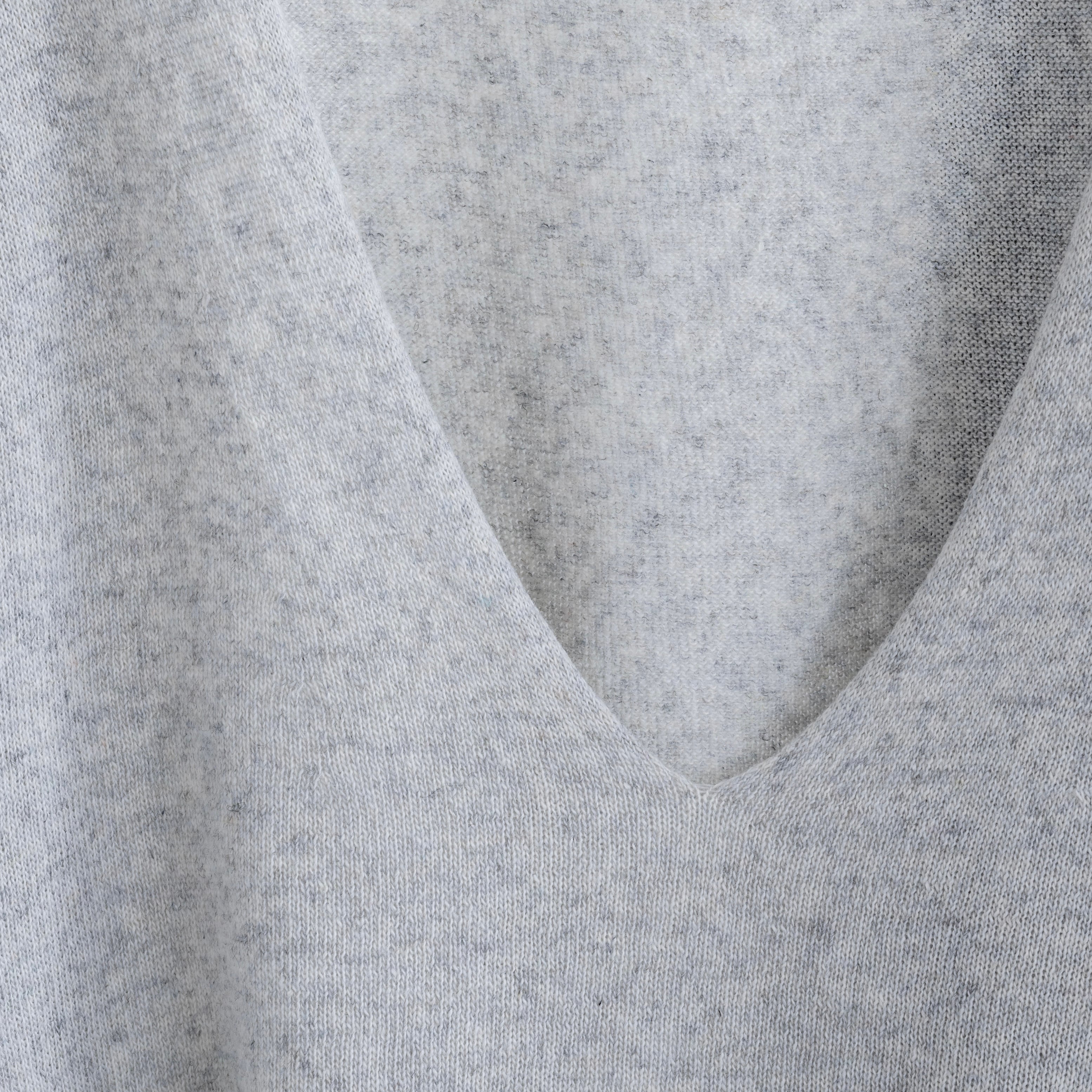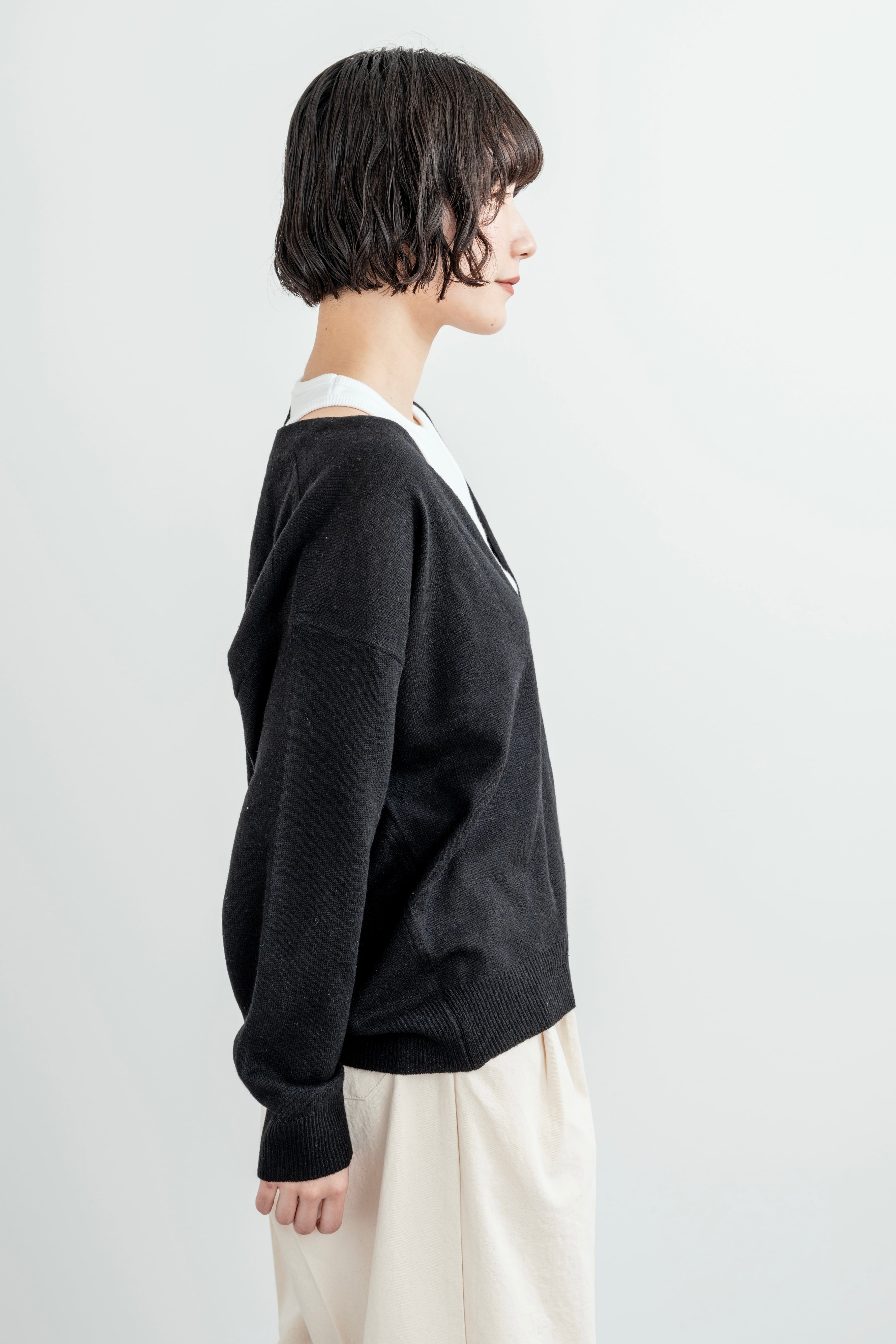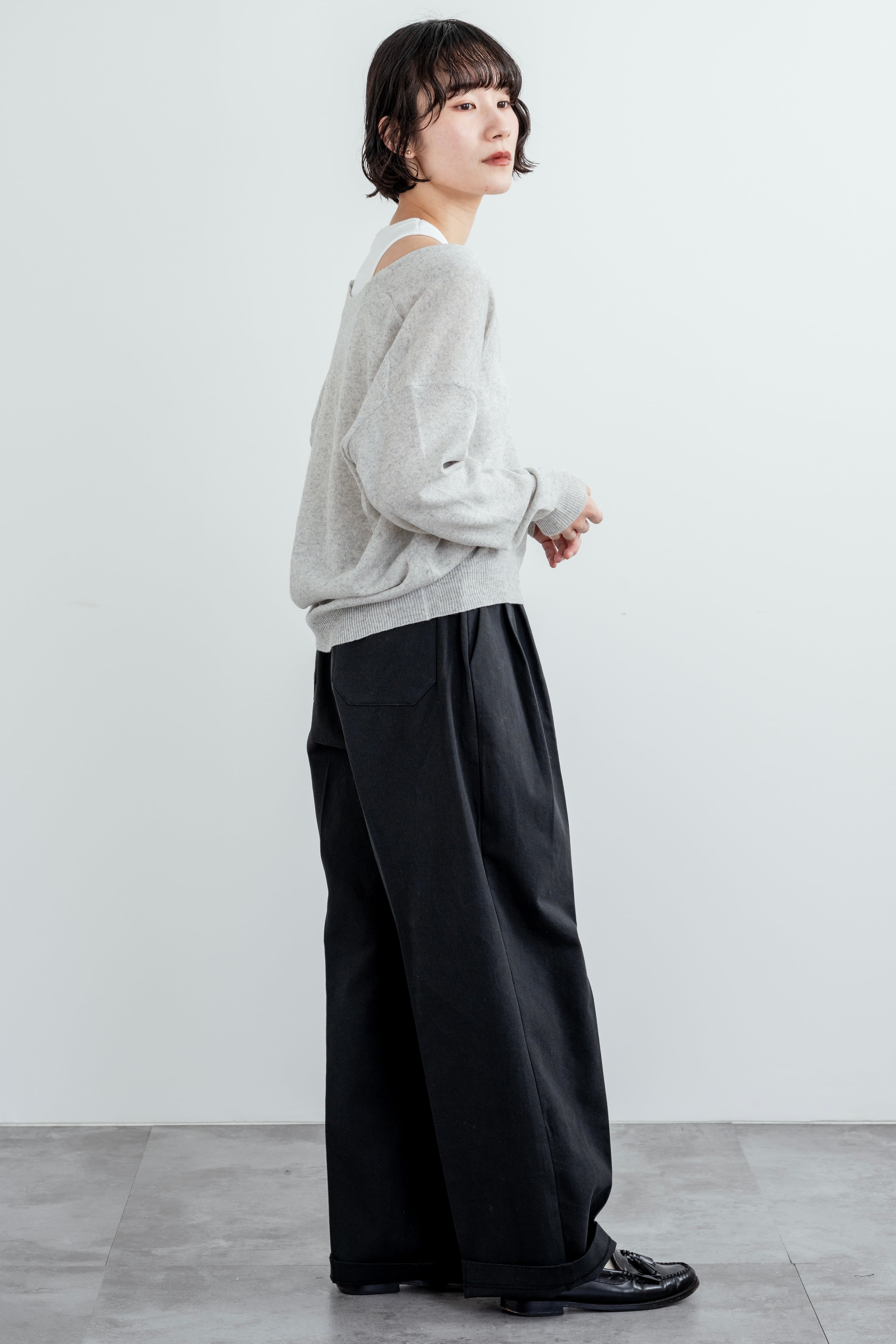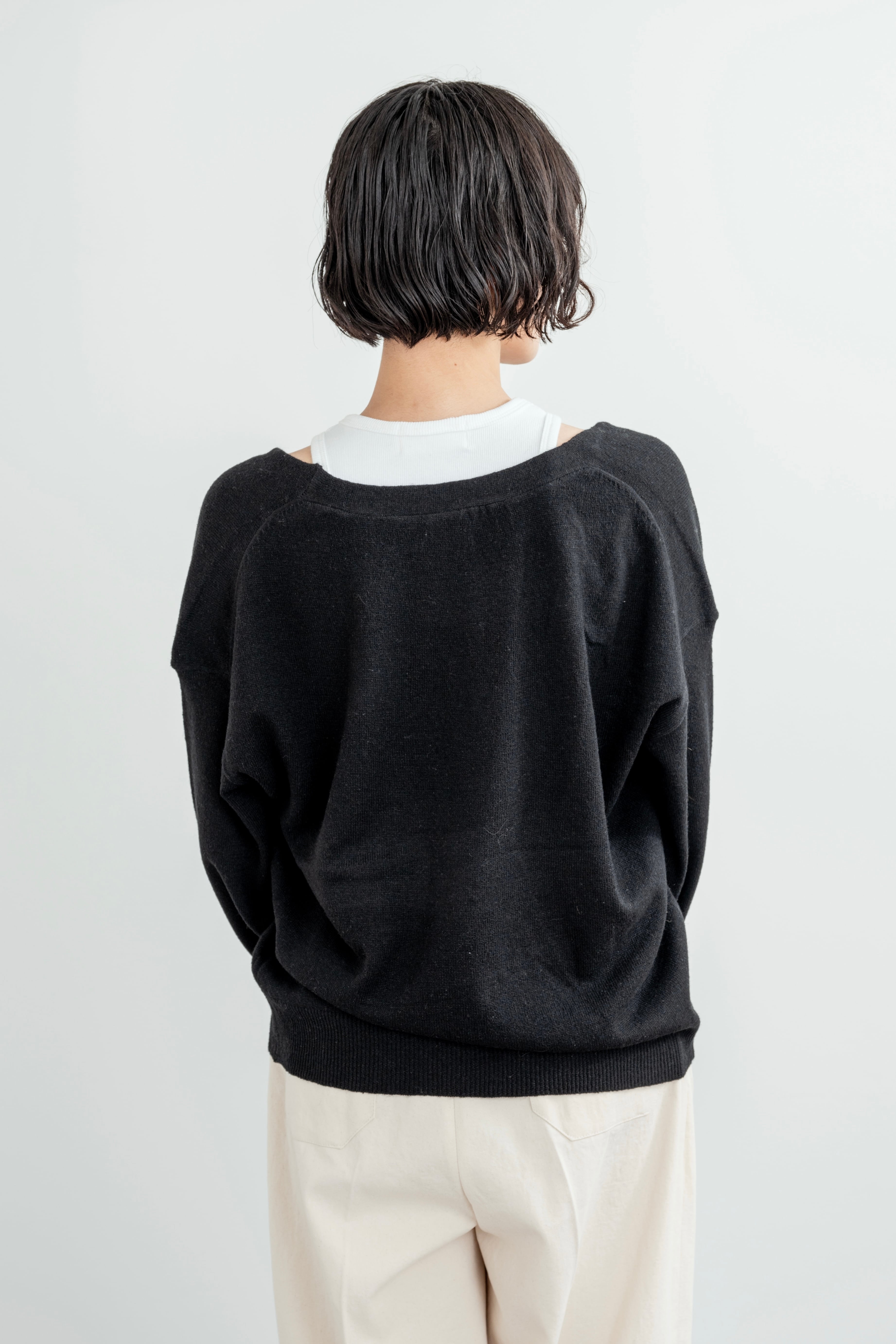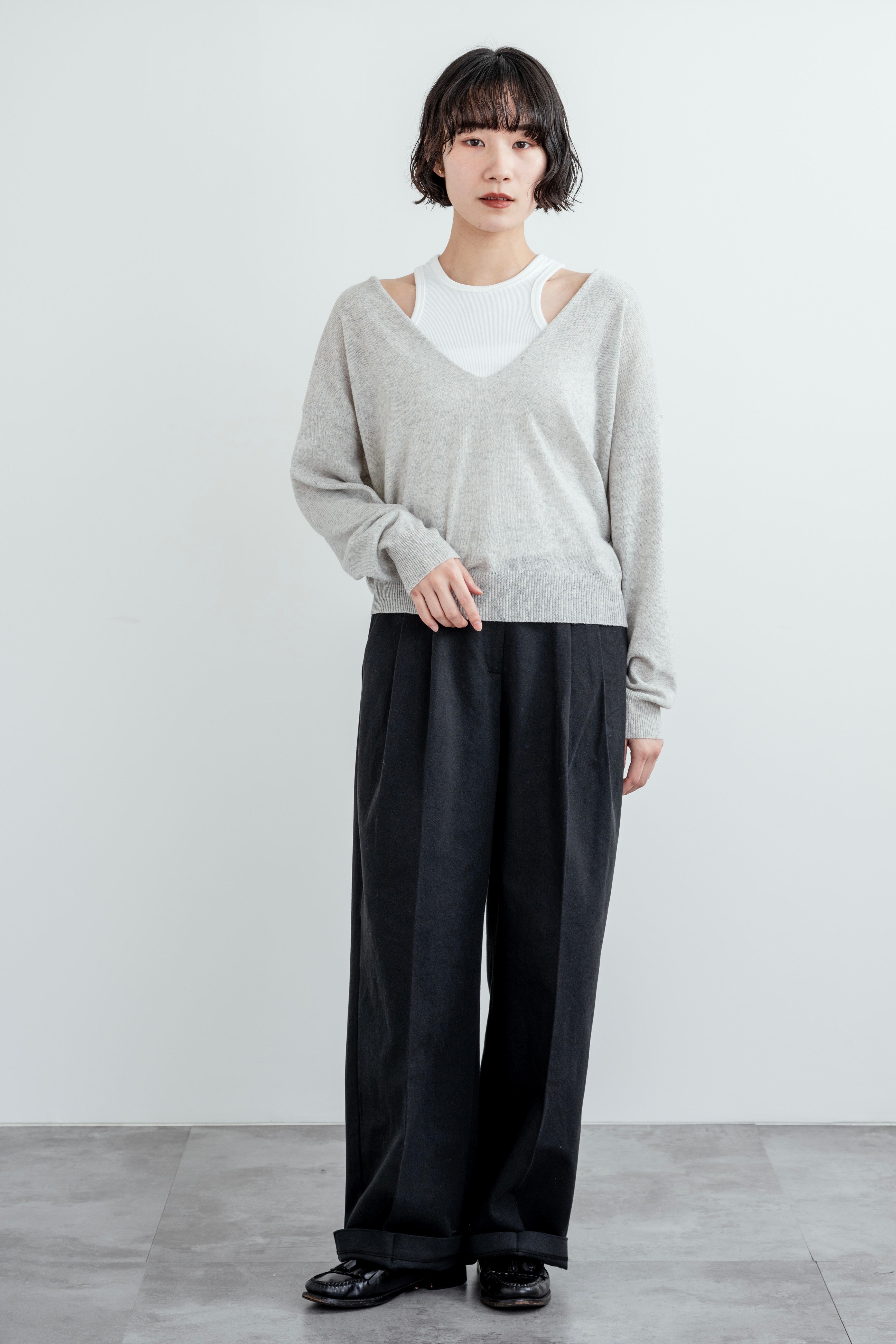 深めのUネックのニットトップ。