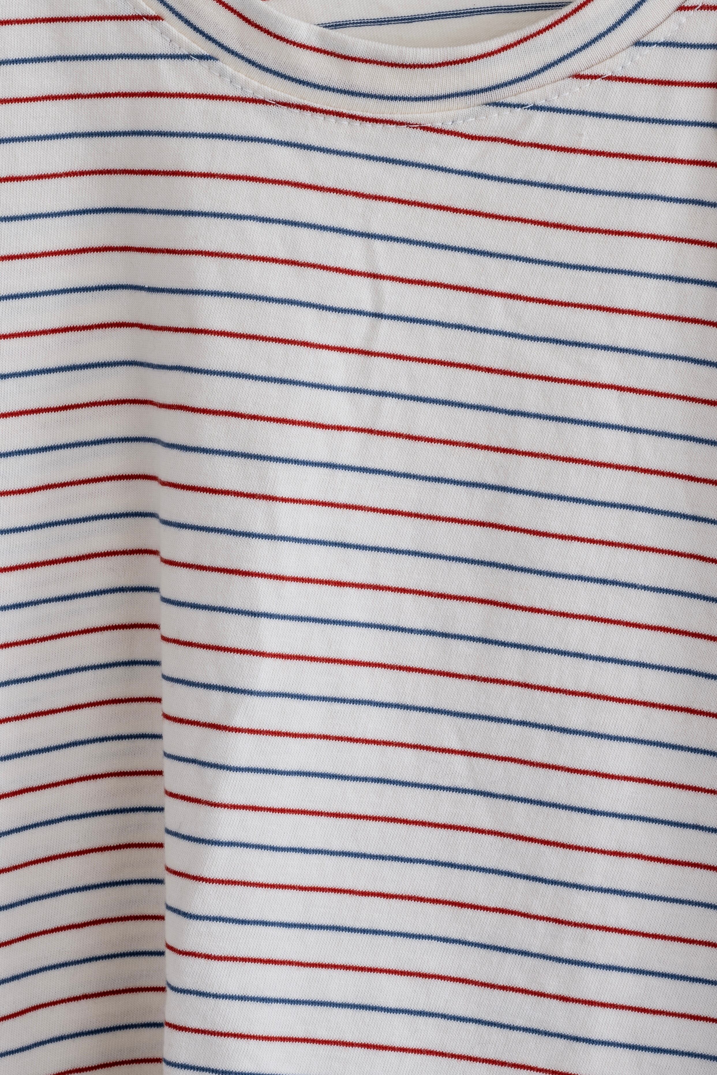 細めのボーダー柄で、ゆったりとしたサイズ感のTシャツ。薄手のコットン生地で、肌触りも◎