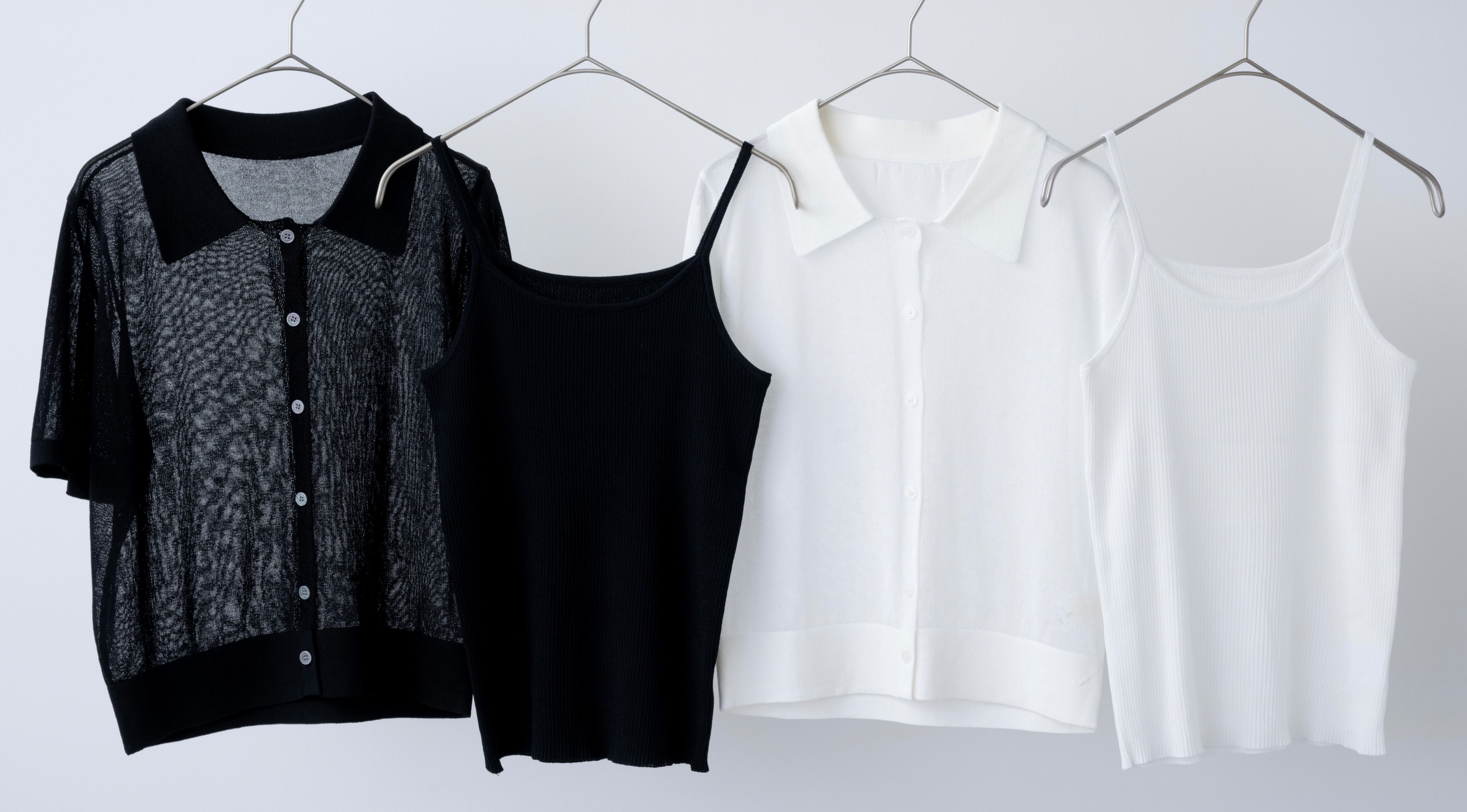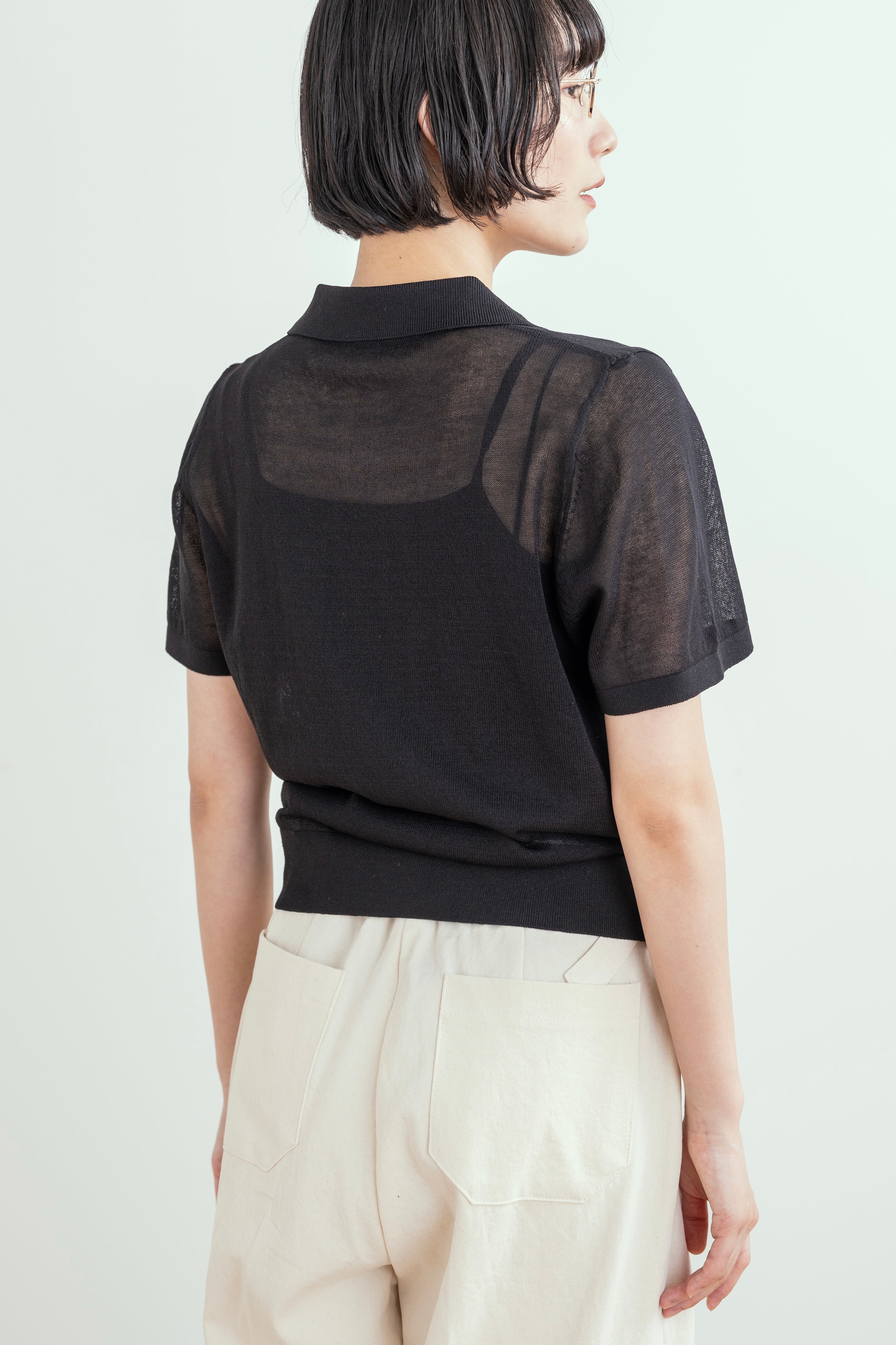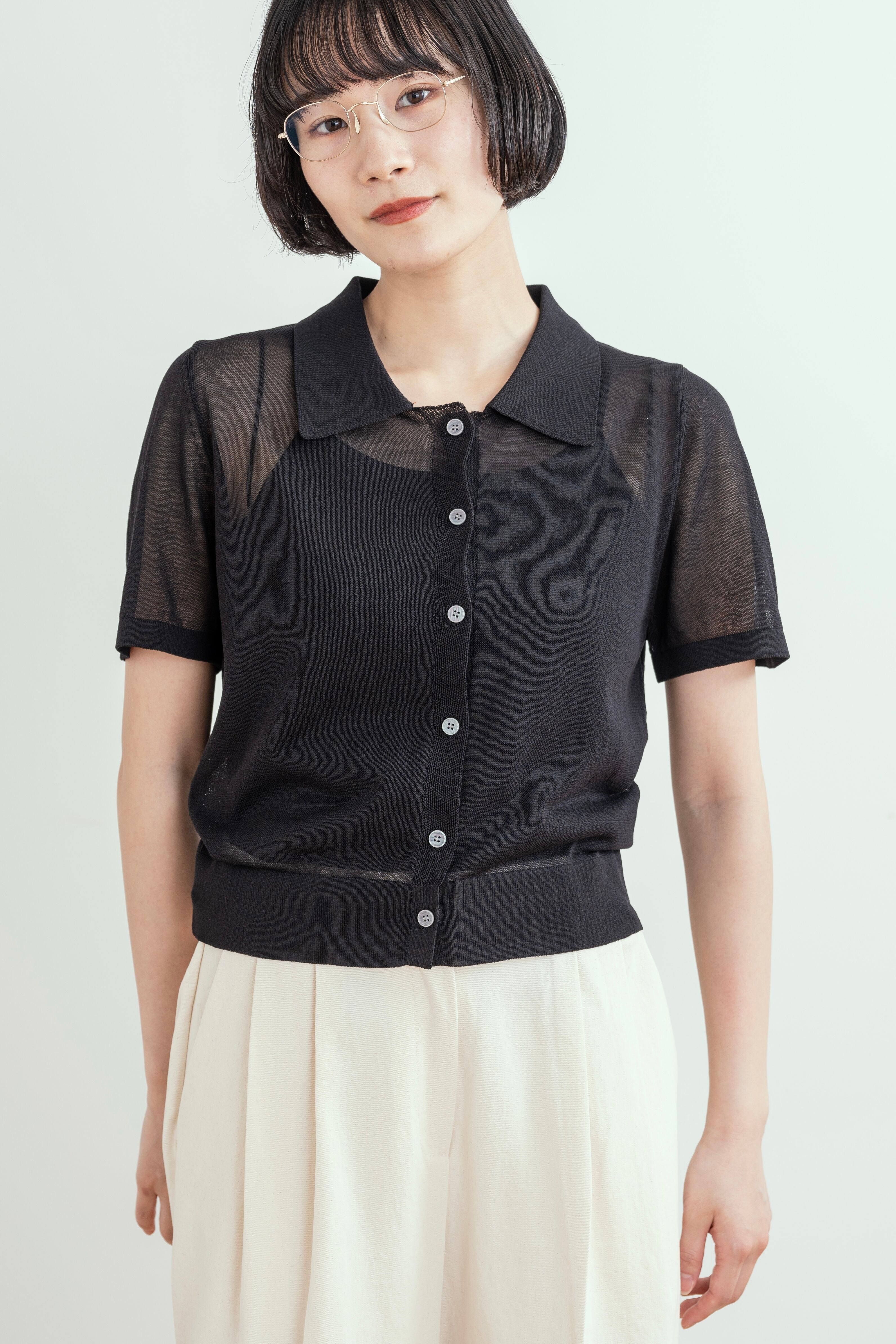 カーディガン本体は肌が上品に透けるシアーな生地感で、夏にぴったりな爽やかな印象です。