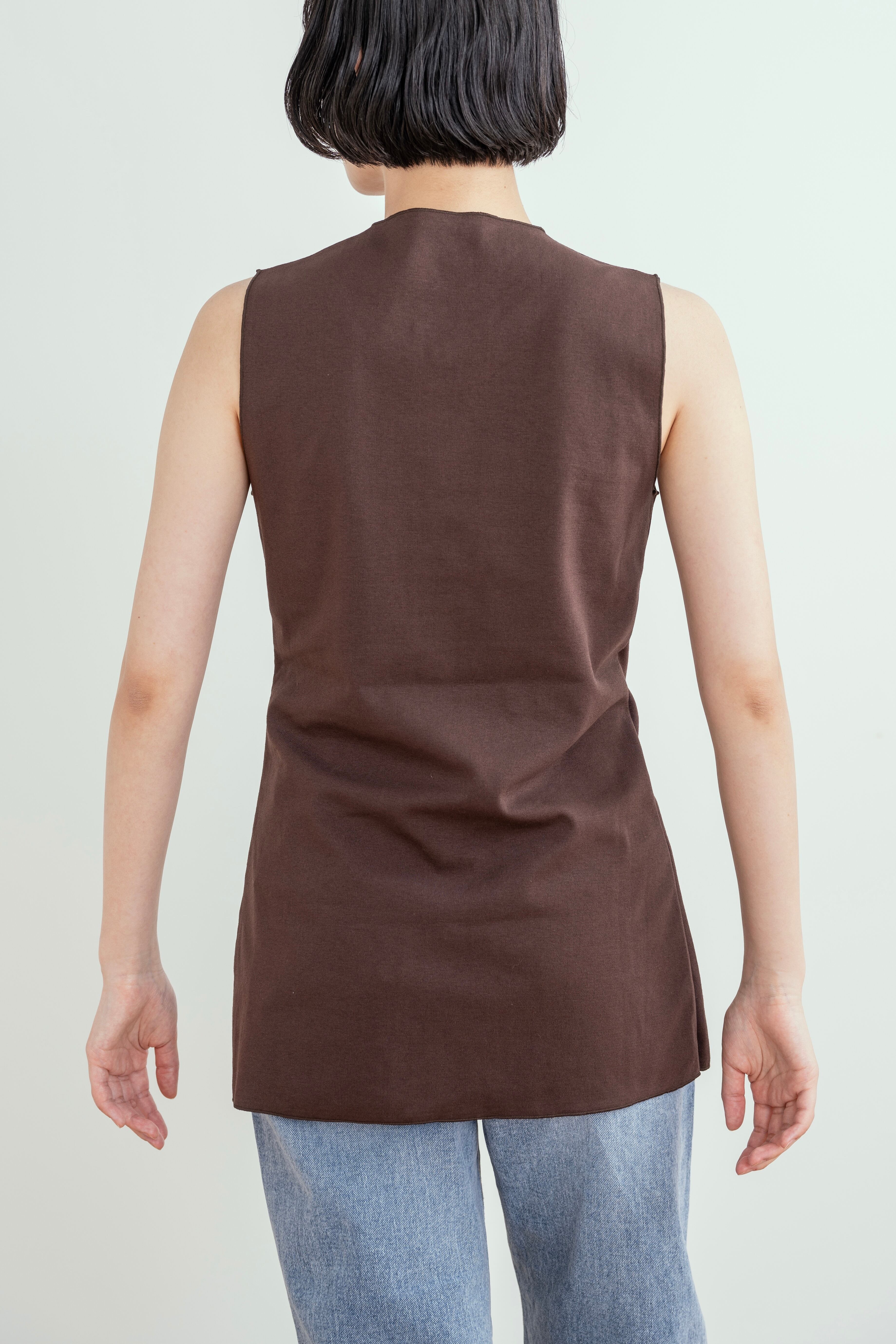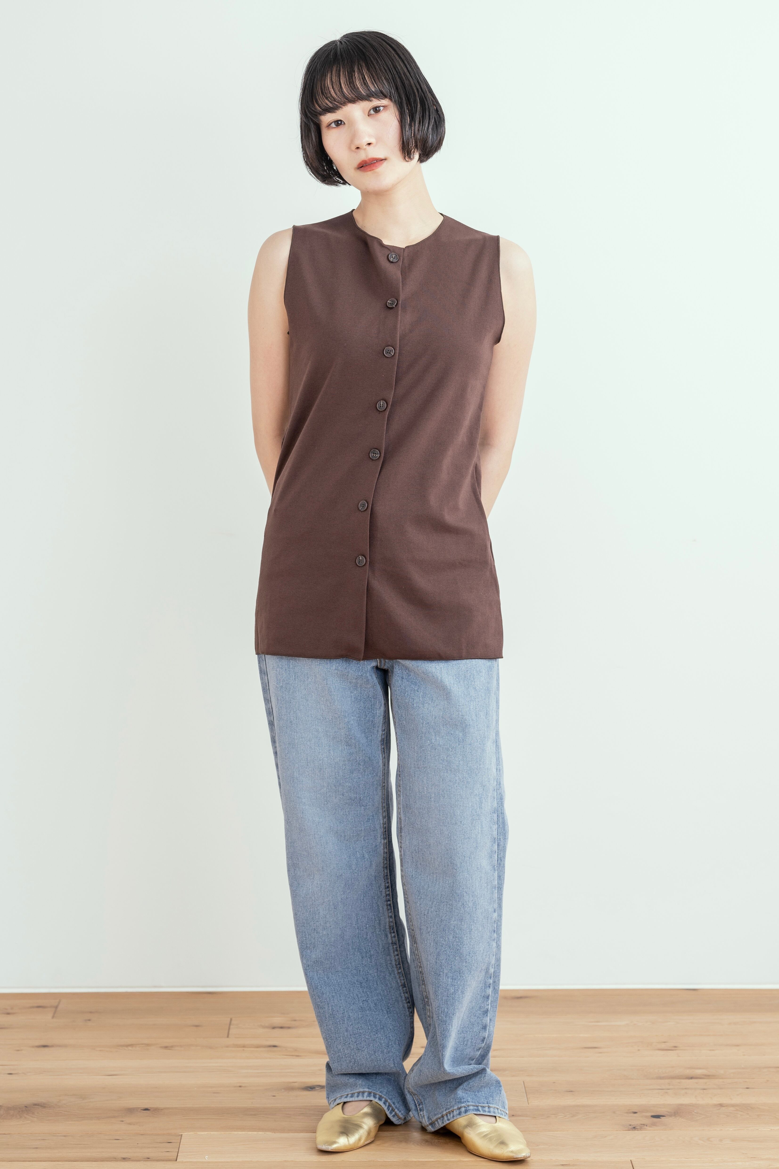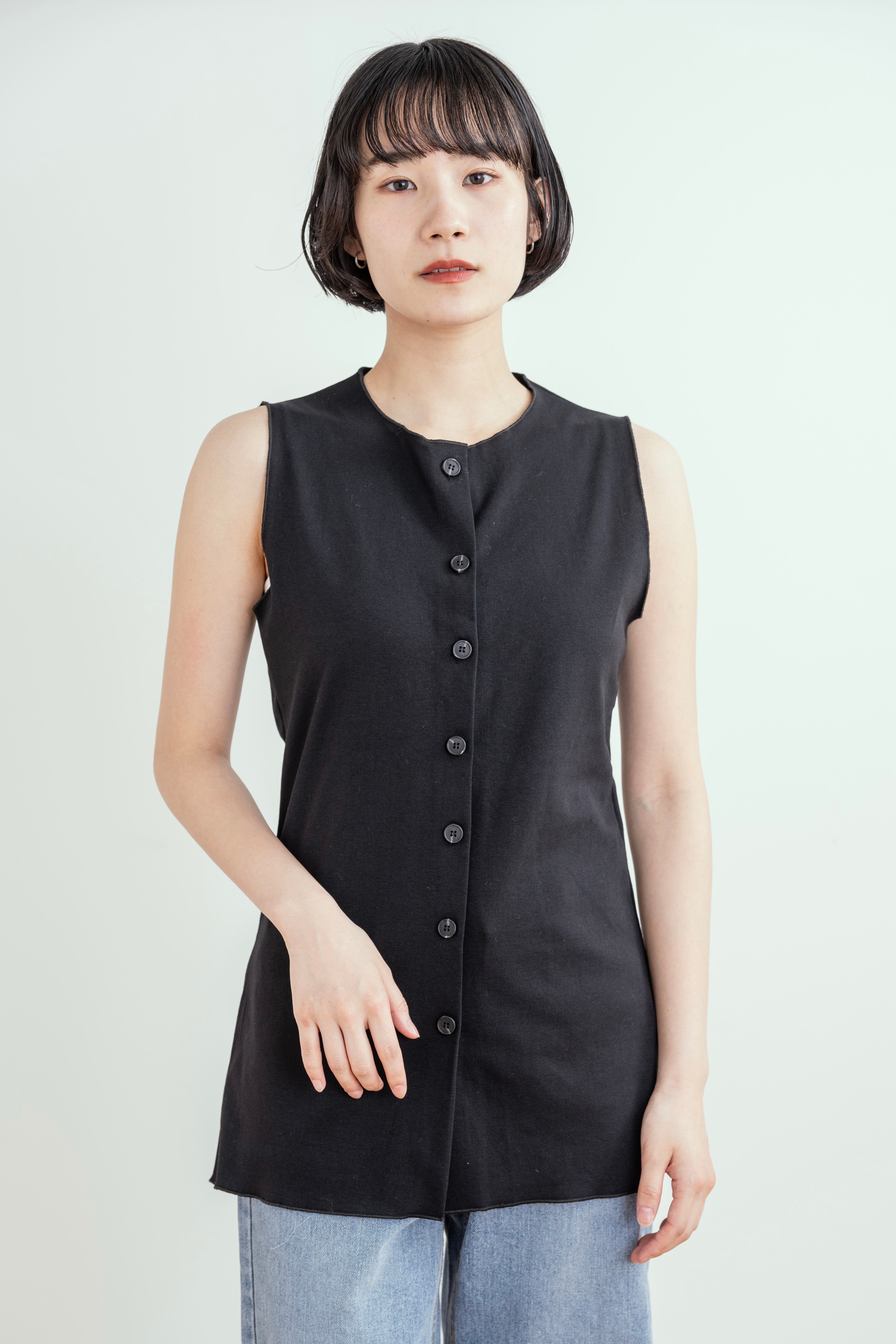 なめらかな肌触りのカット生地を使用したブラウス。ボタンを開ければジレのようにも着られて、