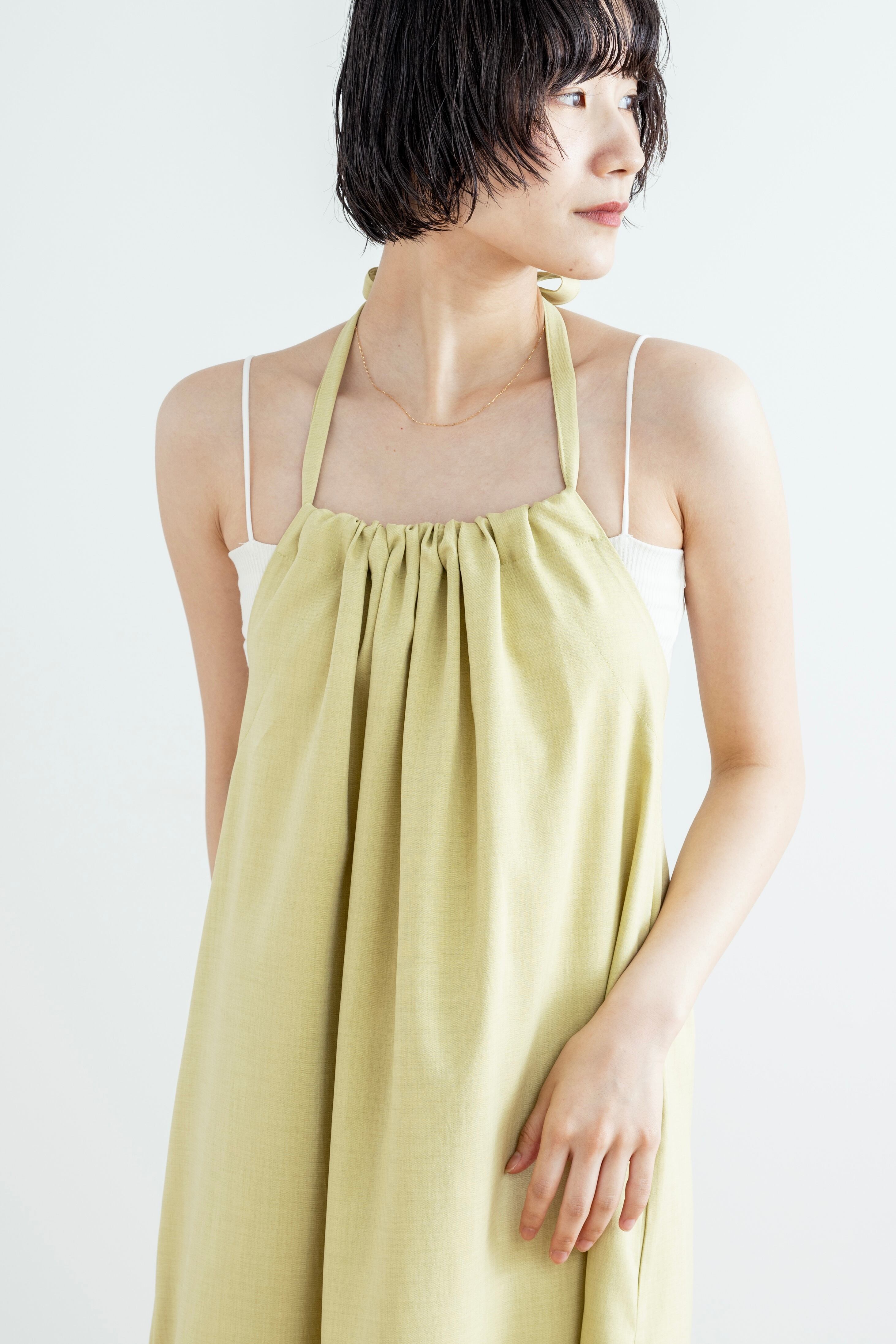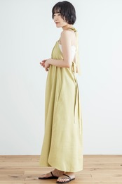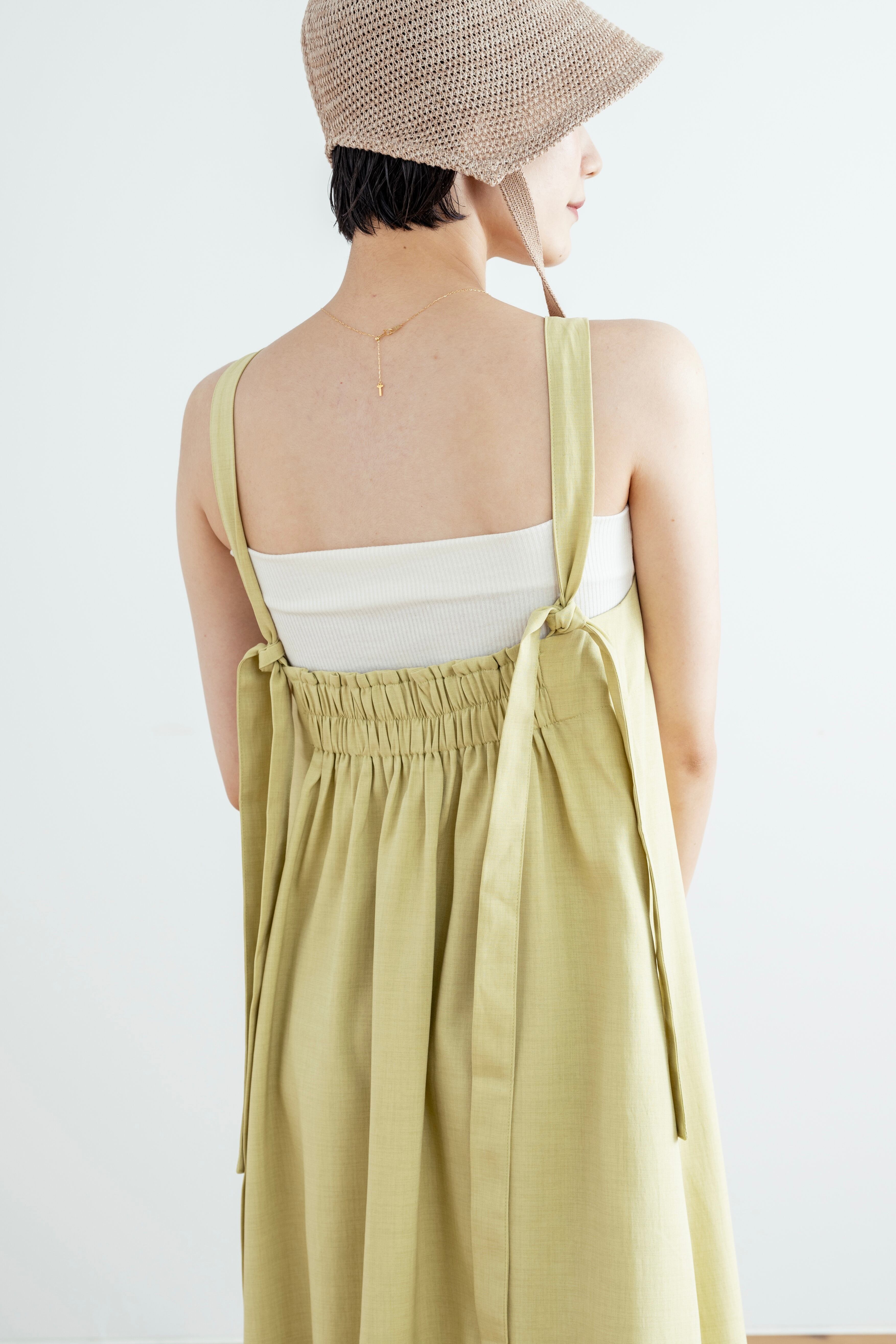 前後着用で、肩紐の結び方でアレンジや、丈調節が可能。