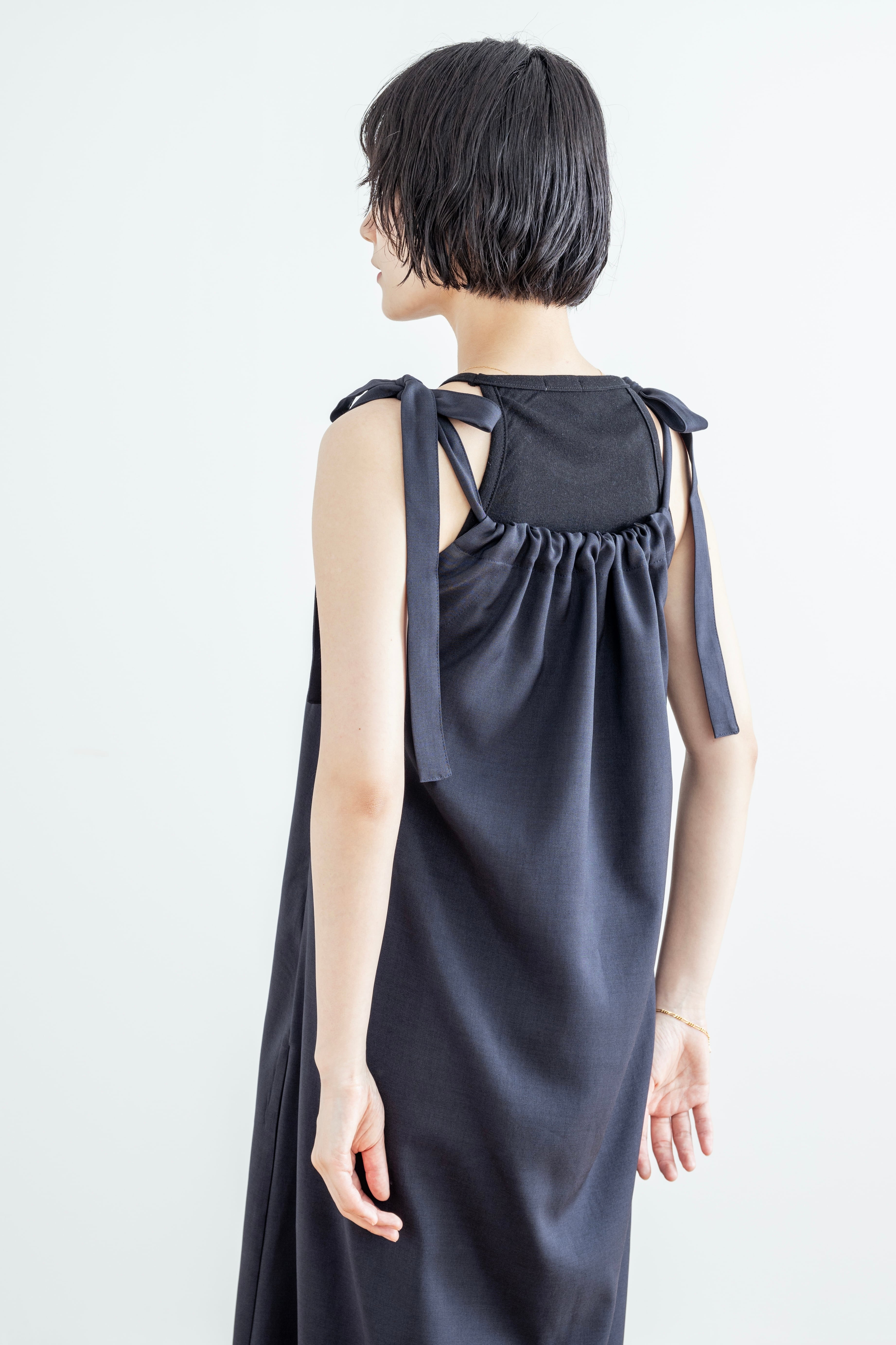 前後着用で、肩紐の結び方でアレンジや、丈調節が可能。