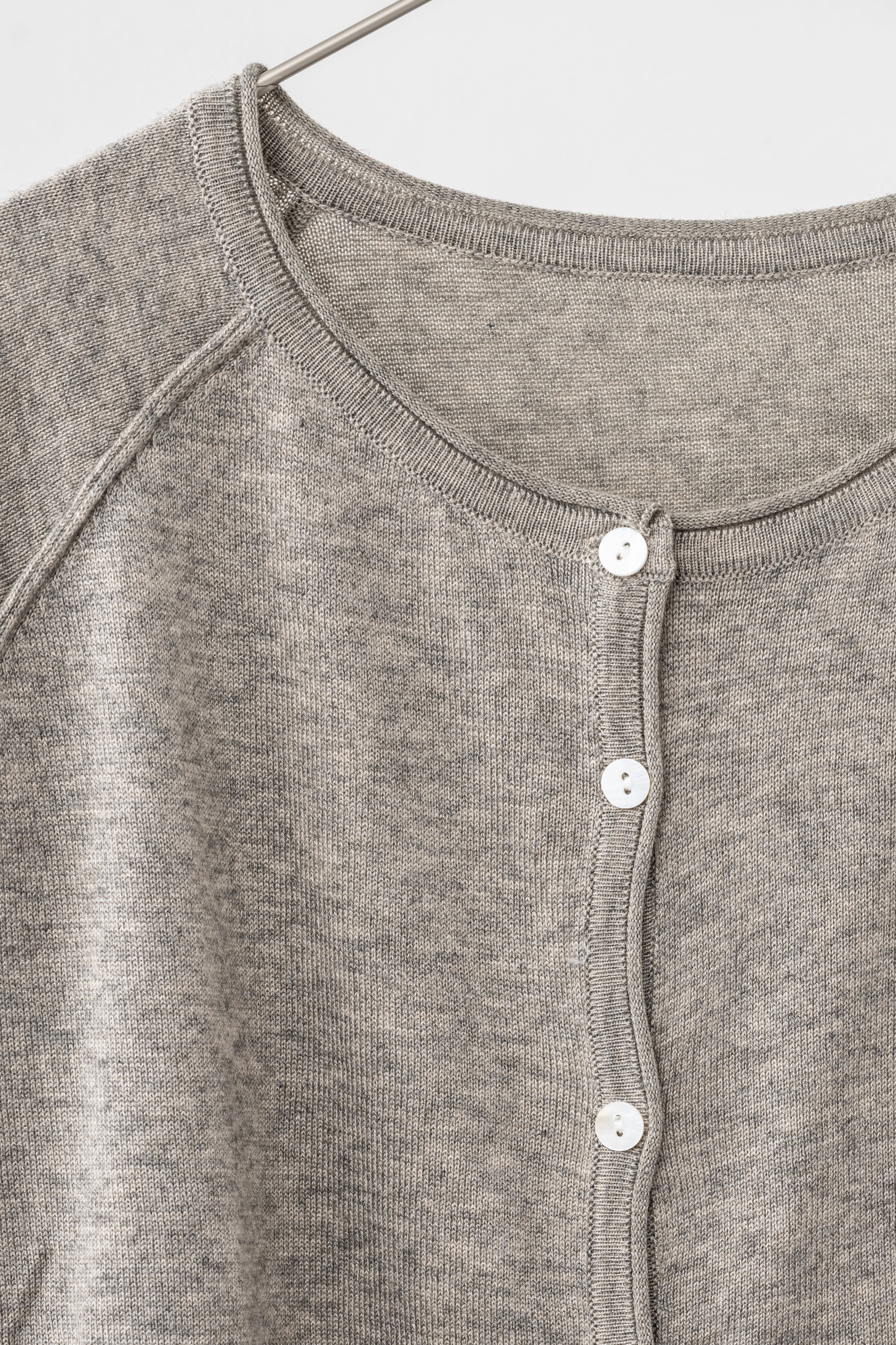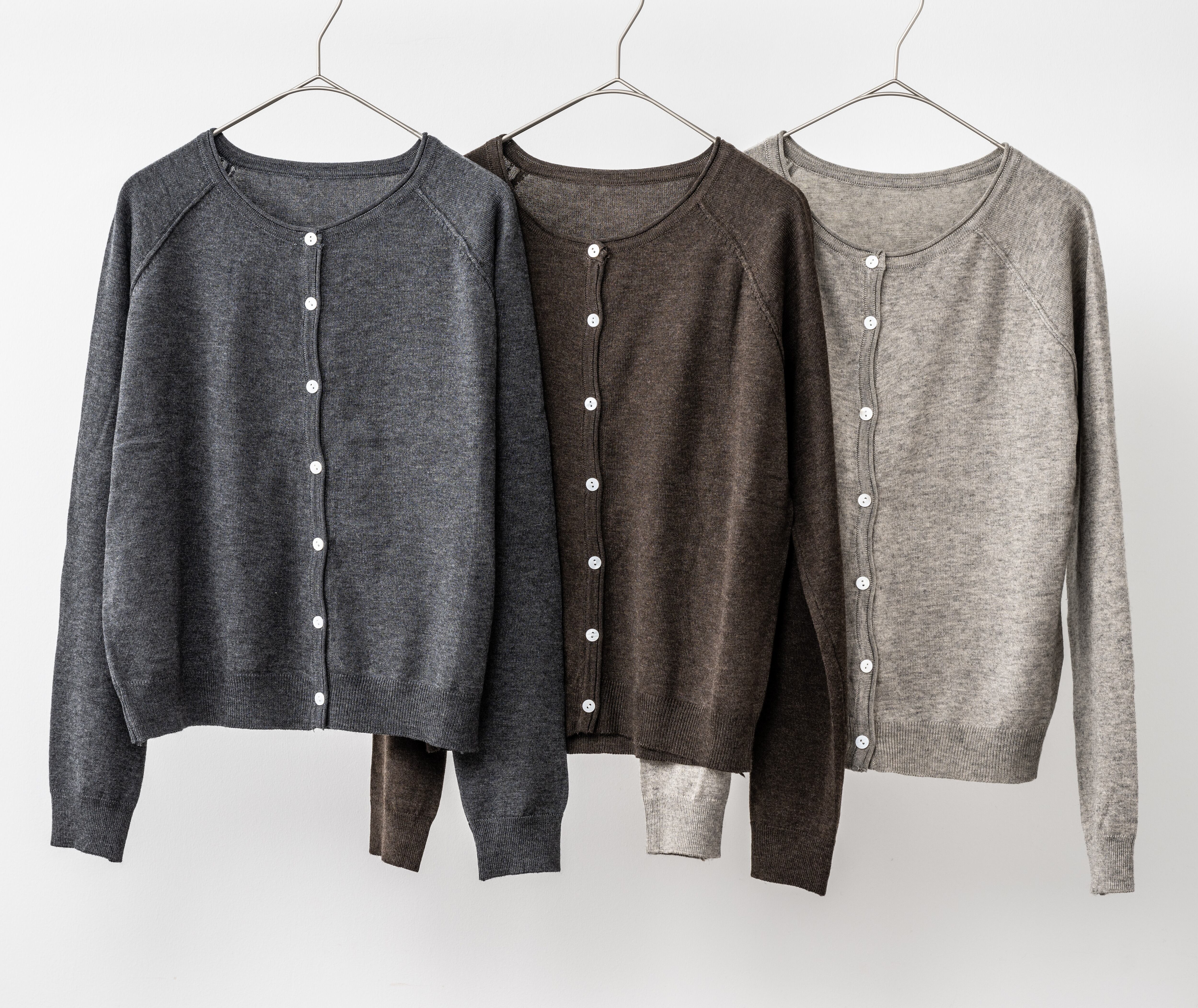 ラグラン袖で、ロールネック。シンプルだけど、一癖あるカーディガンです。