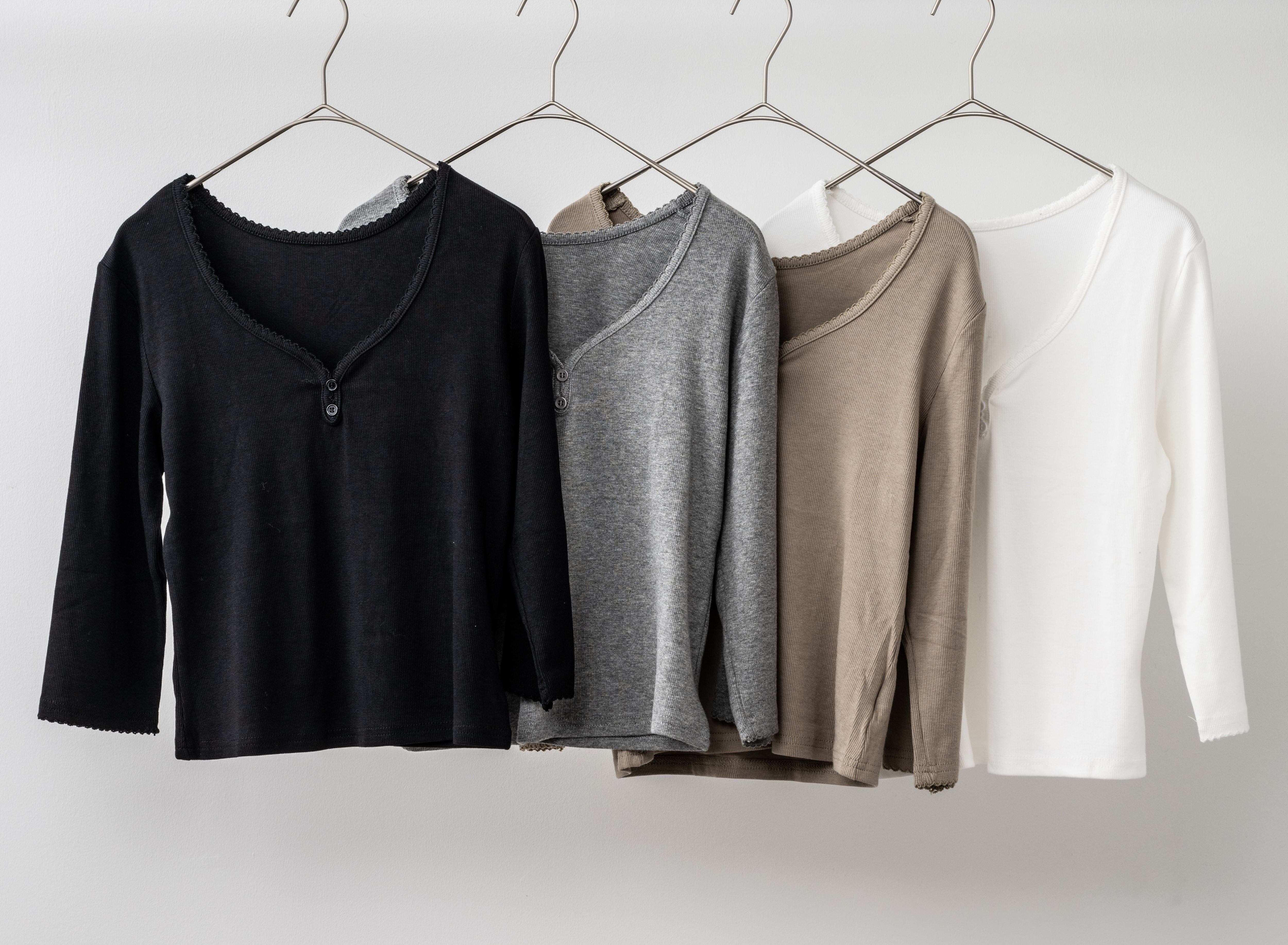 7部袖丈のTシャツ。胸元のVネックが、デコルテをすっきりと綺麗に見せます。バレエコアな雰囲気のアイテム。ボリュームのあるパンツや、スカート、デニムなどカジュアルなボトムとも相性◎季節の変わり目にもお勧めの一枚です。