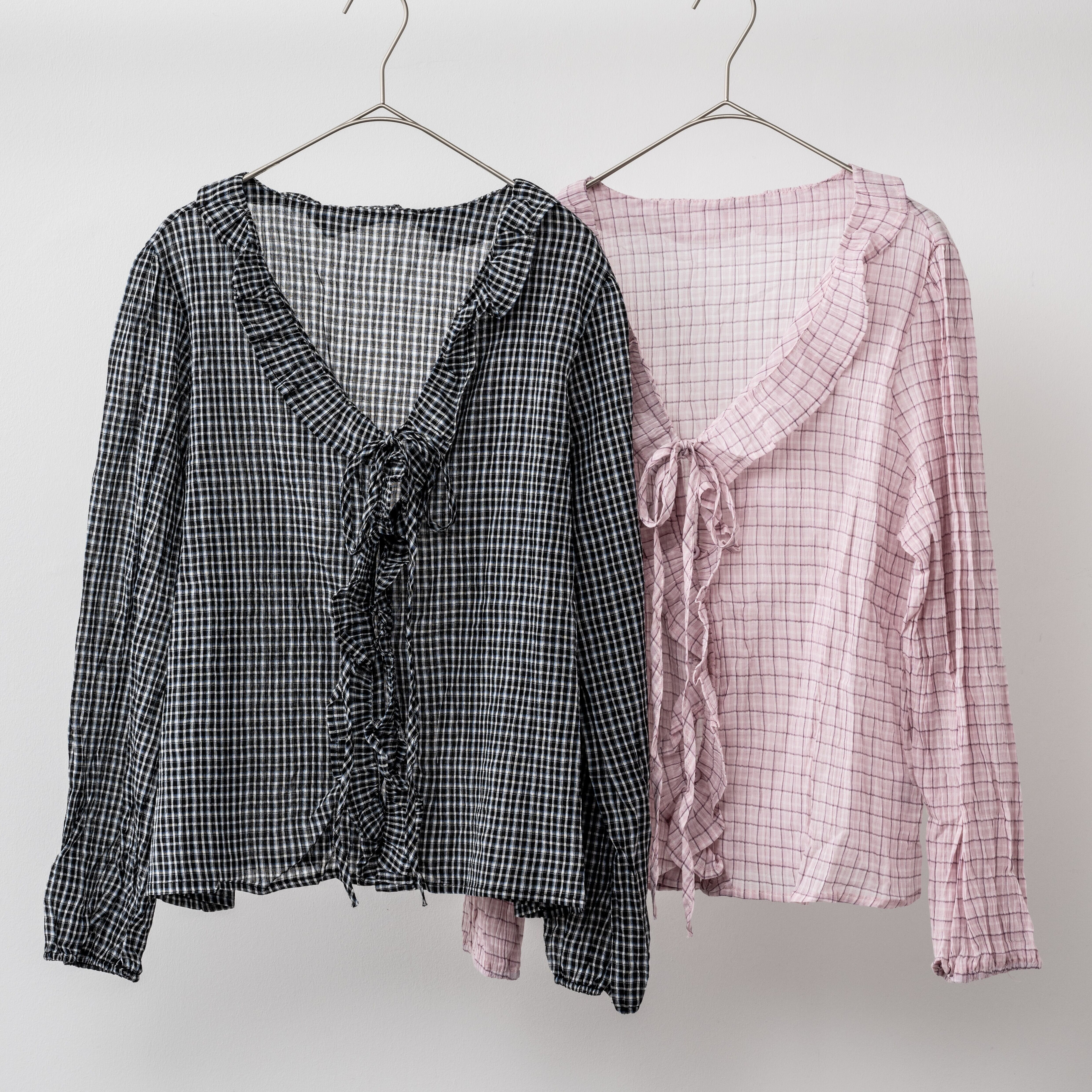 軽やかなチェック柄が魅力のフリルブラウス。