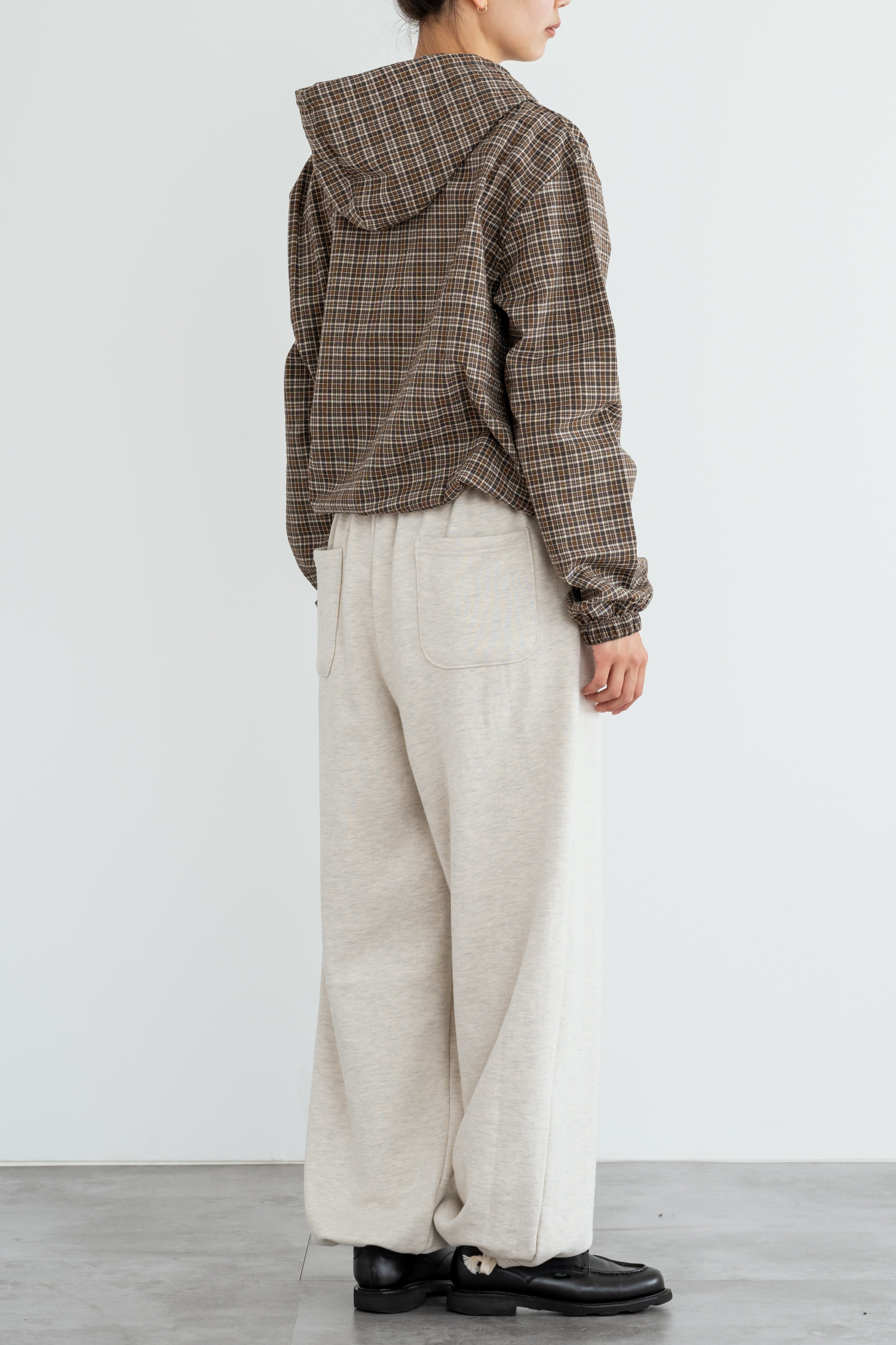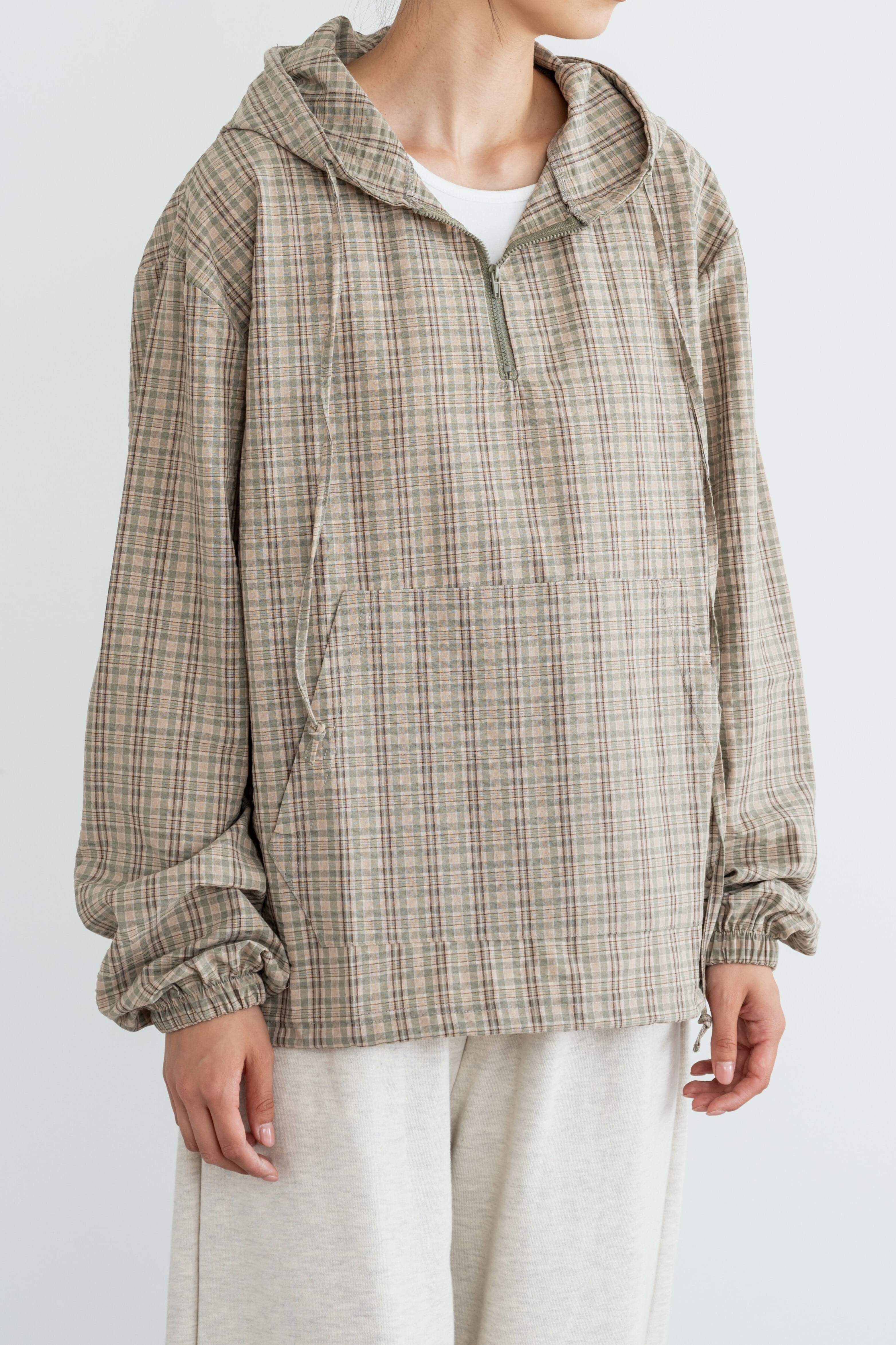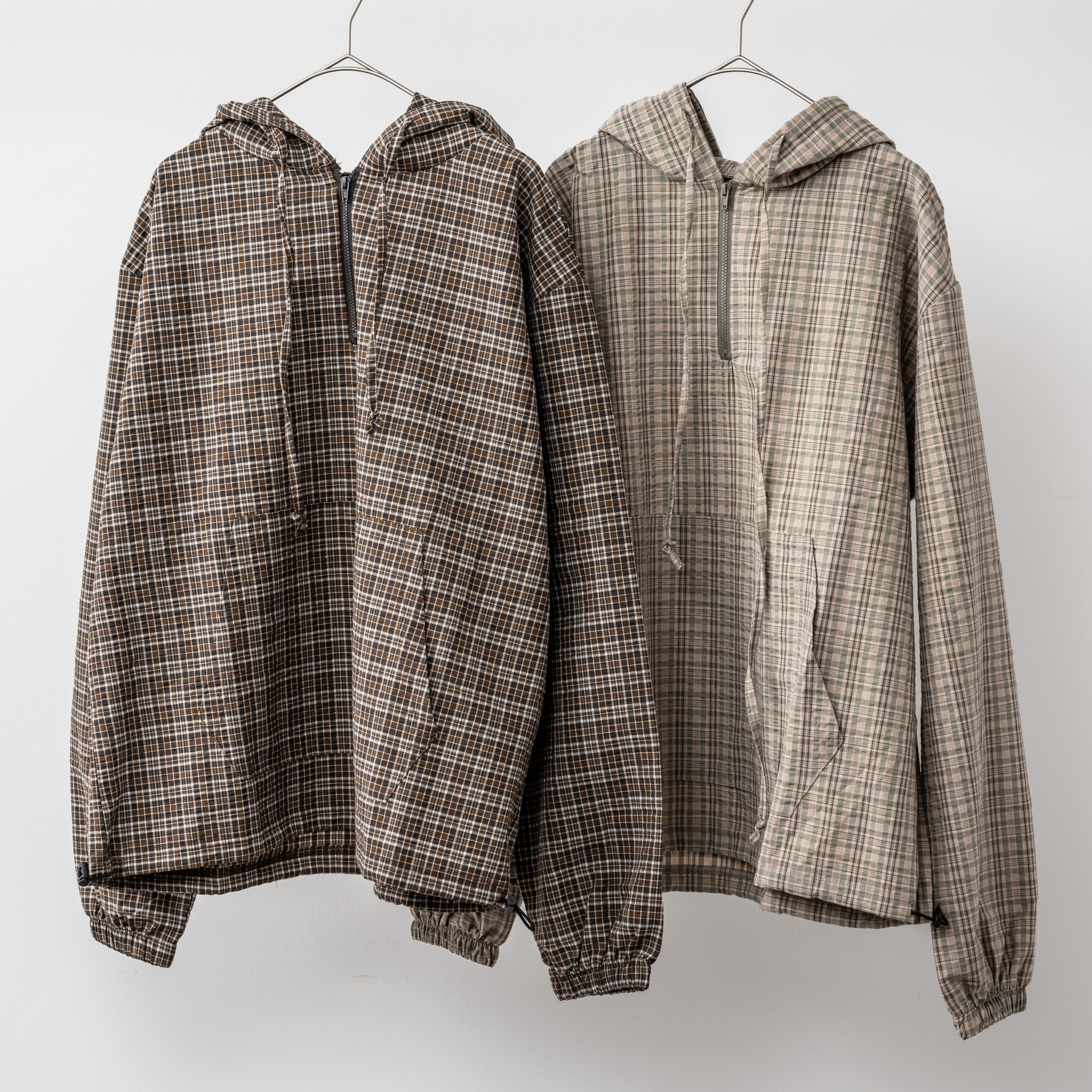 落ち着いたチェック柄が印象的なフード付きアノラック。