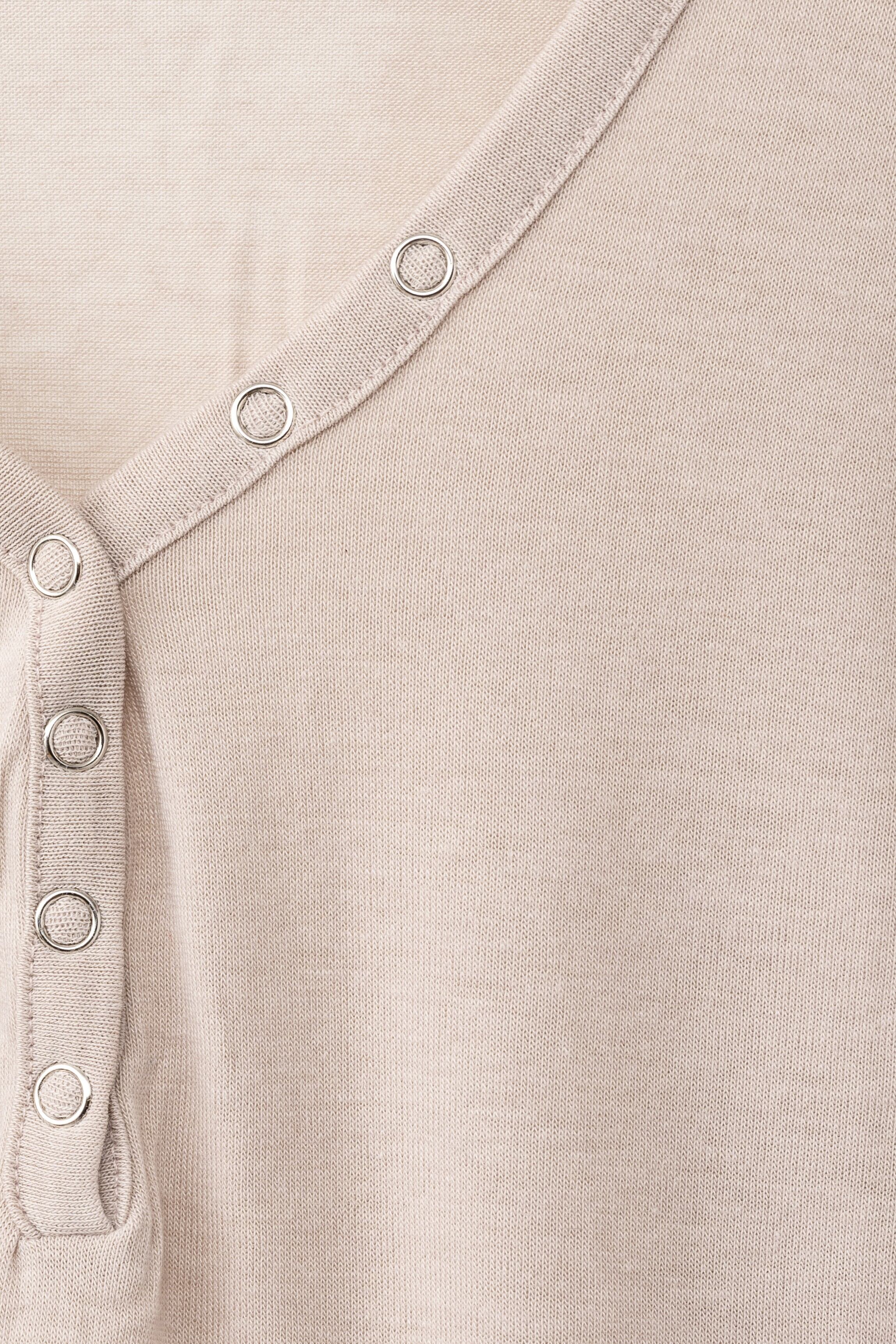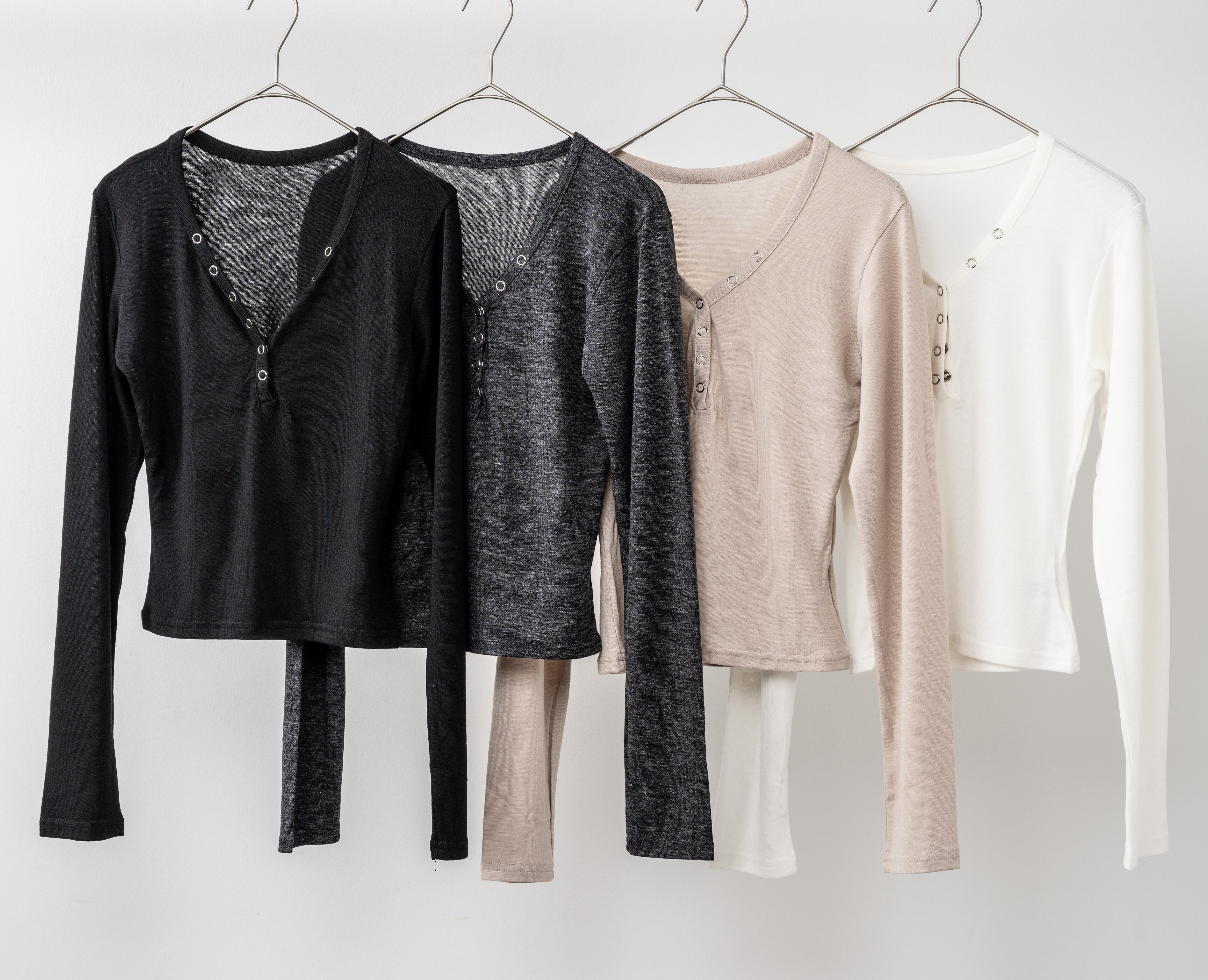 シアー感のある軽やかな素材で仕立てたTシャツ、、深めのVネックラインとコンパクトな丈感が、女性らしい抜け感を演出します。フロントには小ぶりなスナップボタンをあしらい、シンプルながらも洗練された印象に。一枚で着映えするデザインなのでデニムやスラックス、ジャケットのインナーとしても活躍する一枚です。