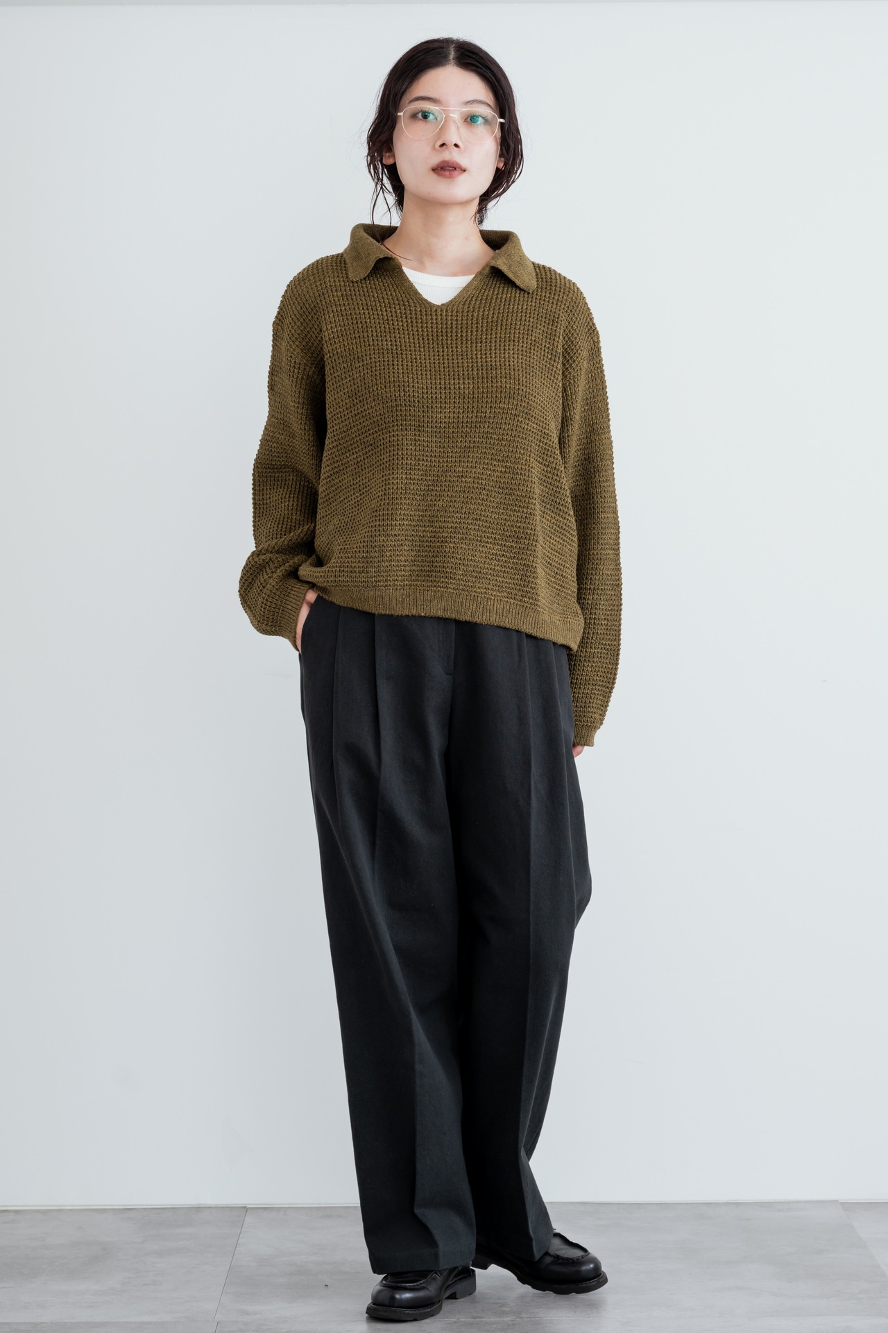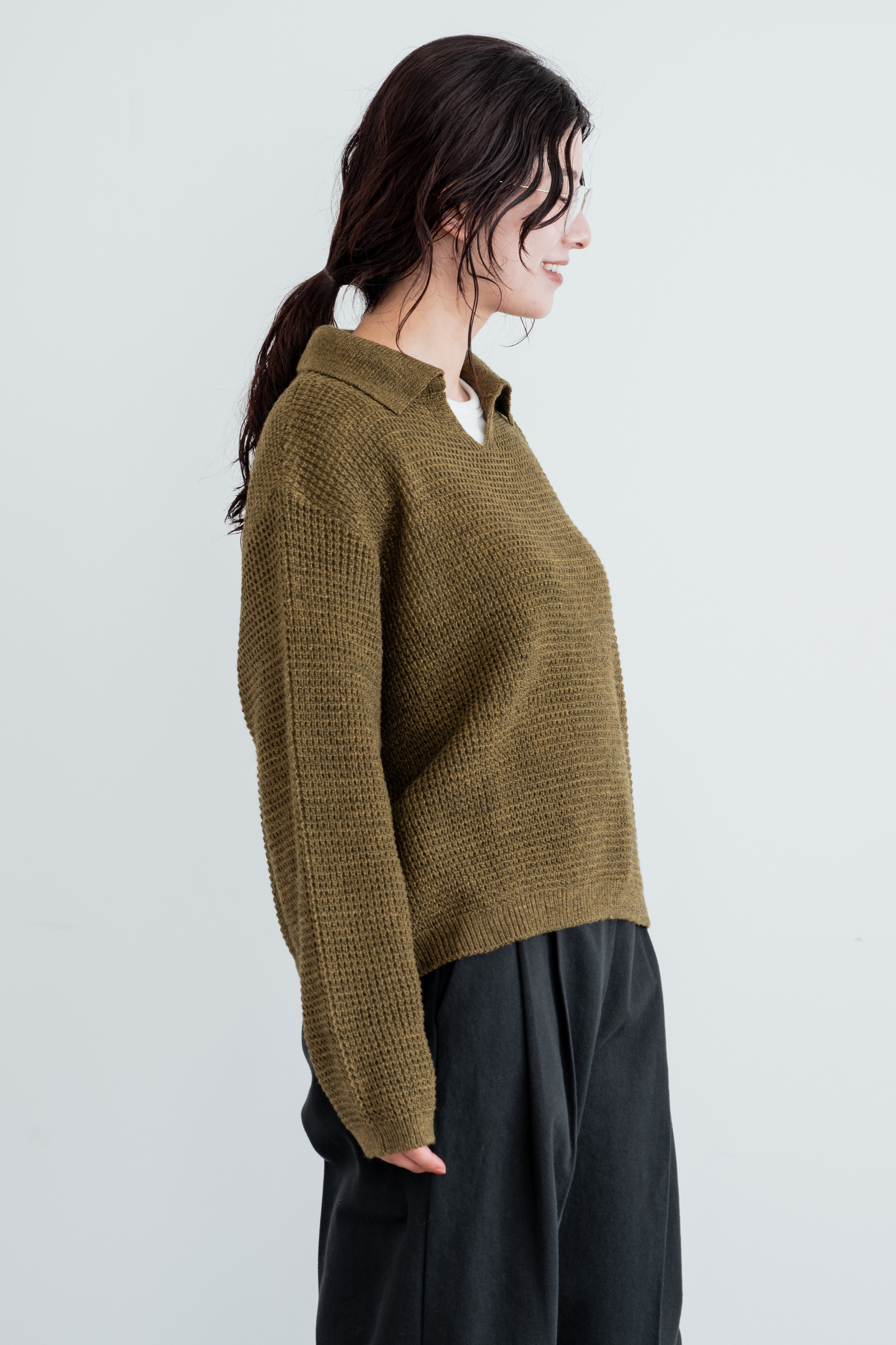 open collar waffle knit pullover