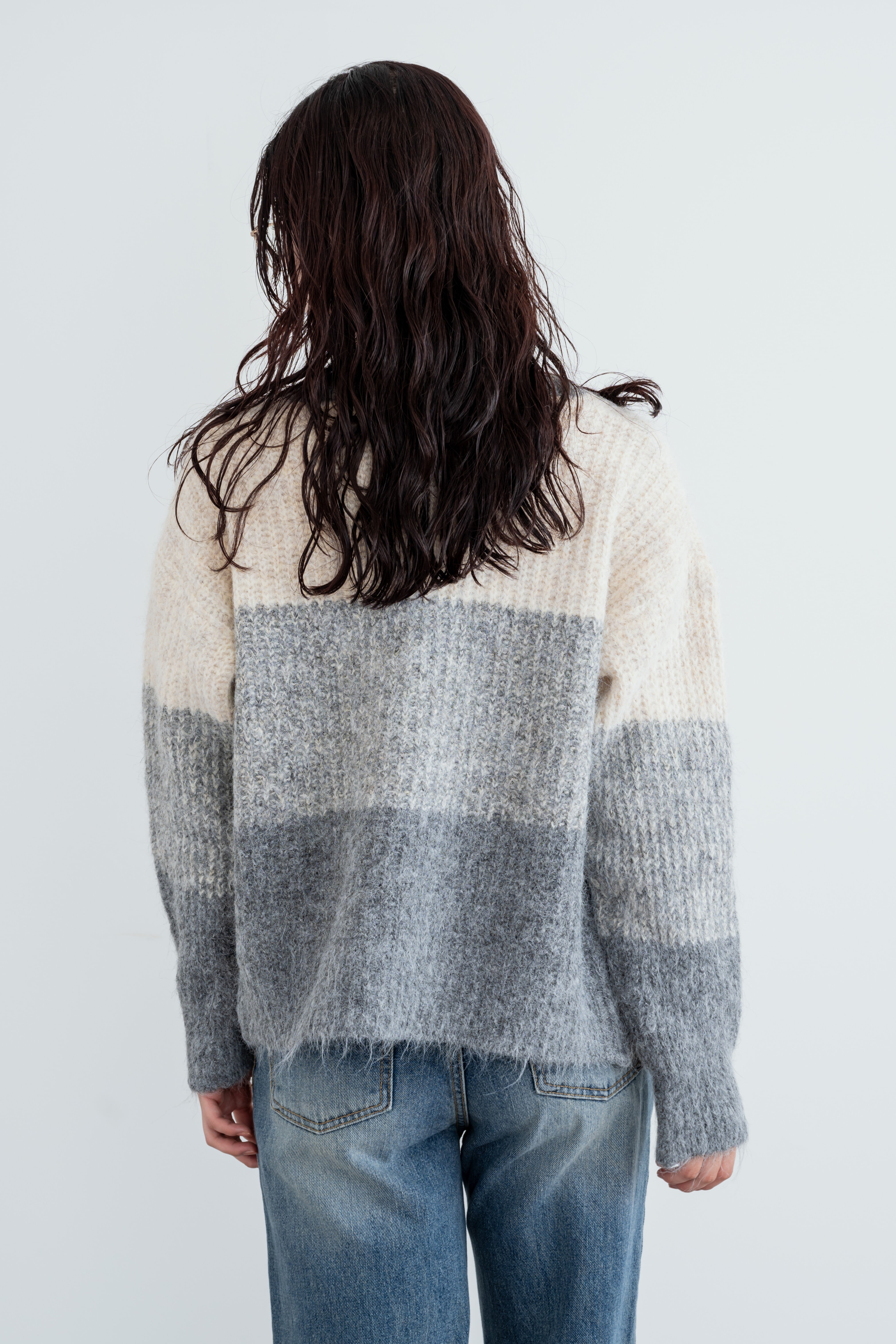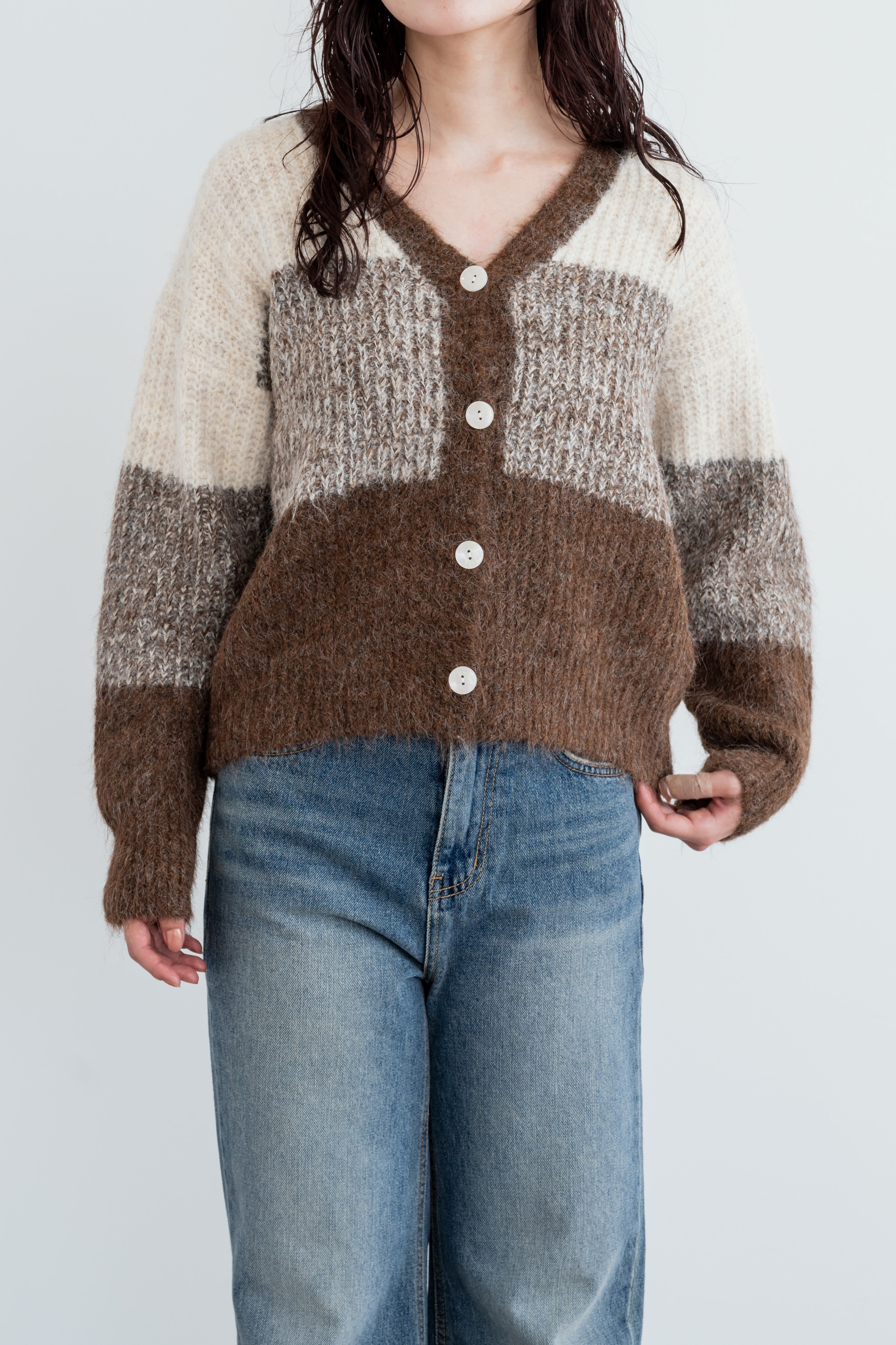 グラデーションのボーダーニットカーディガン。Tシャツの上に羽織るだけで、コーディネートのポイントに。