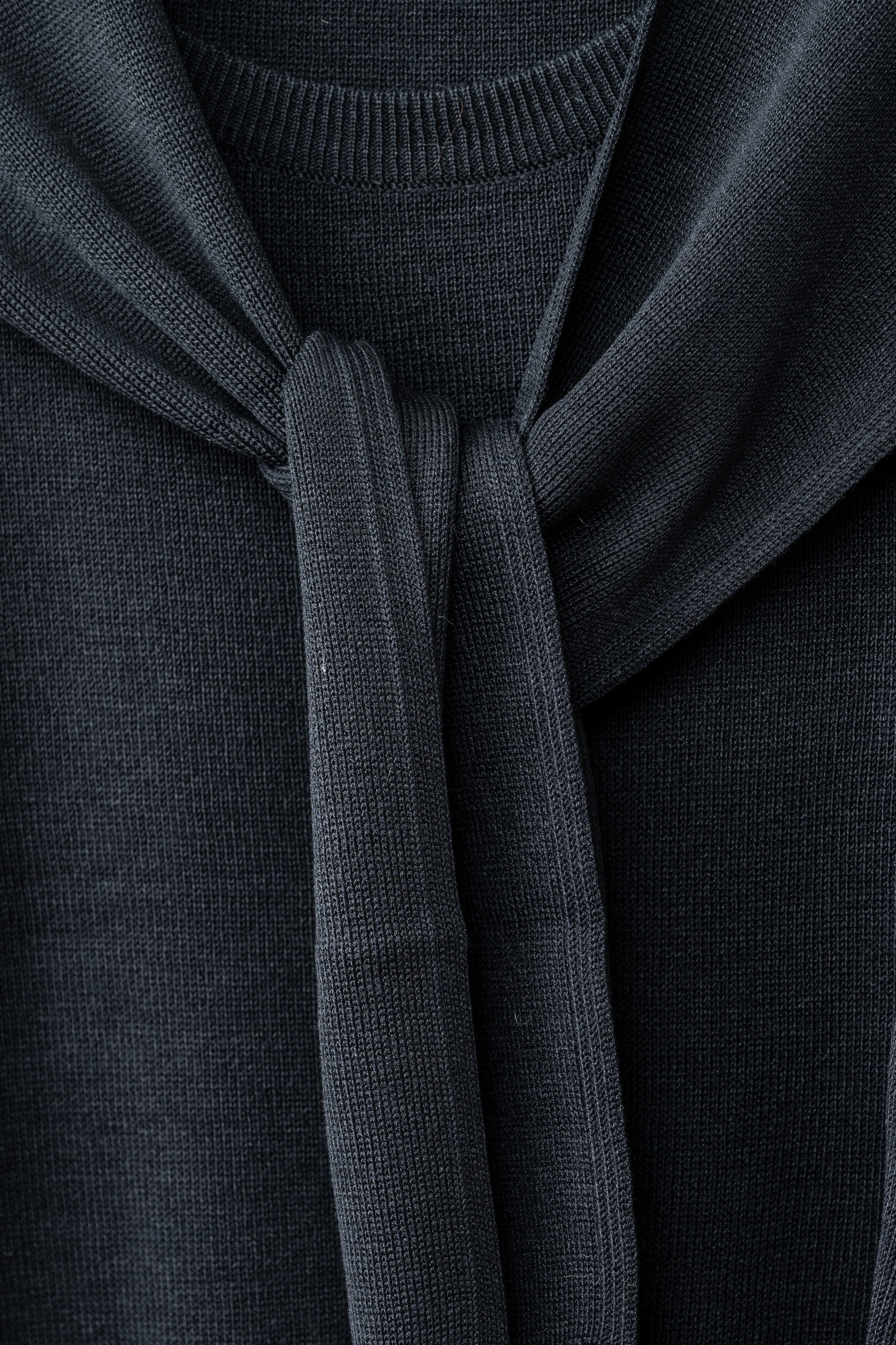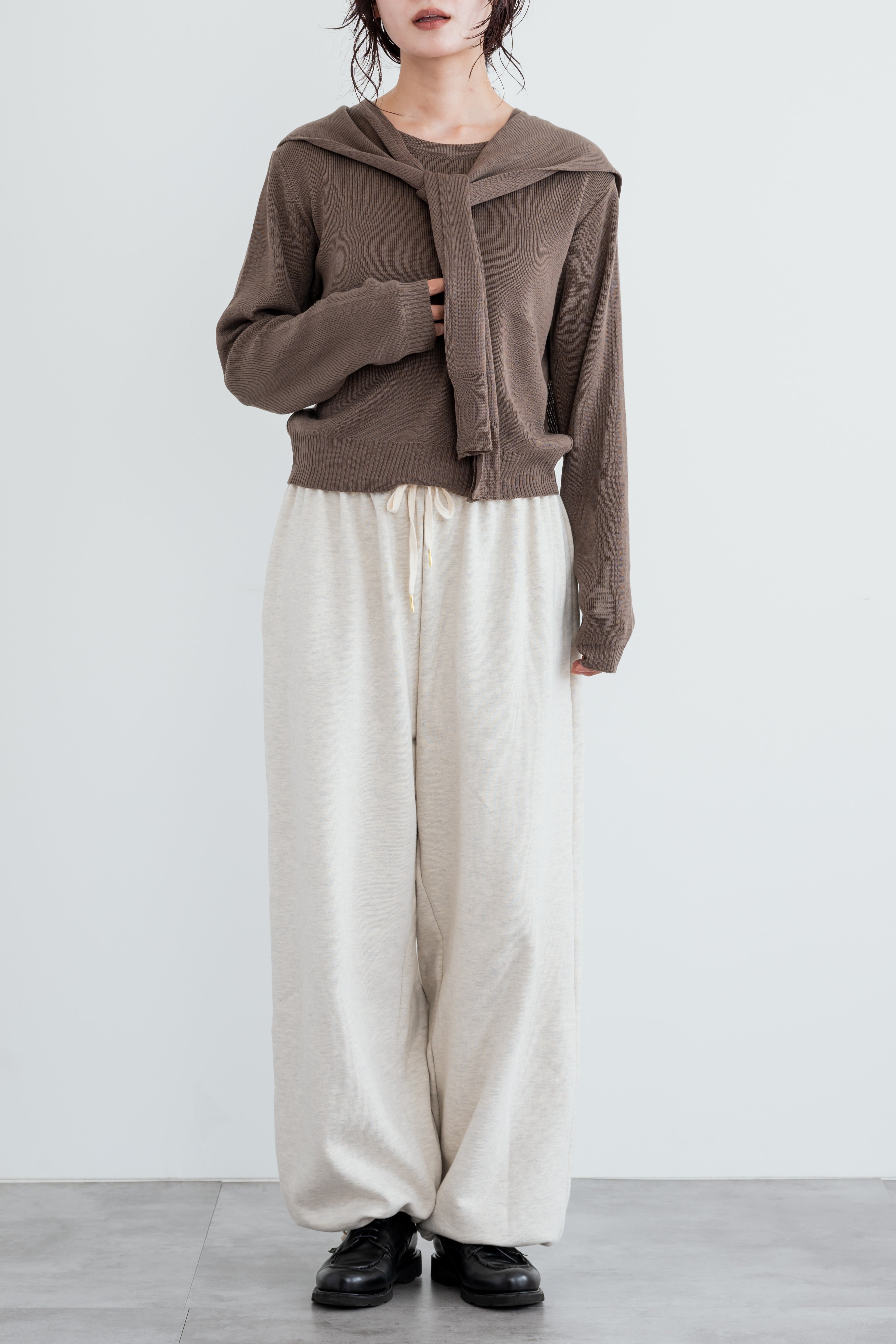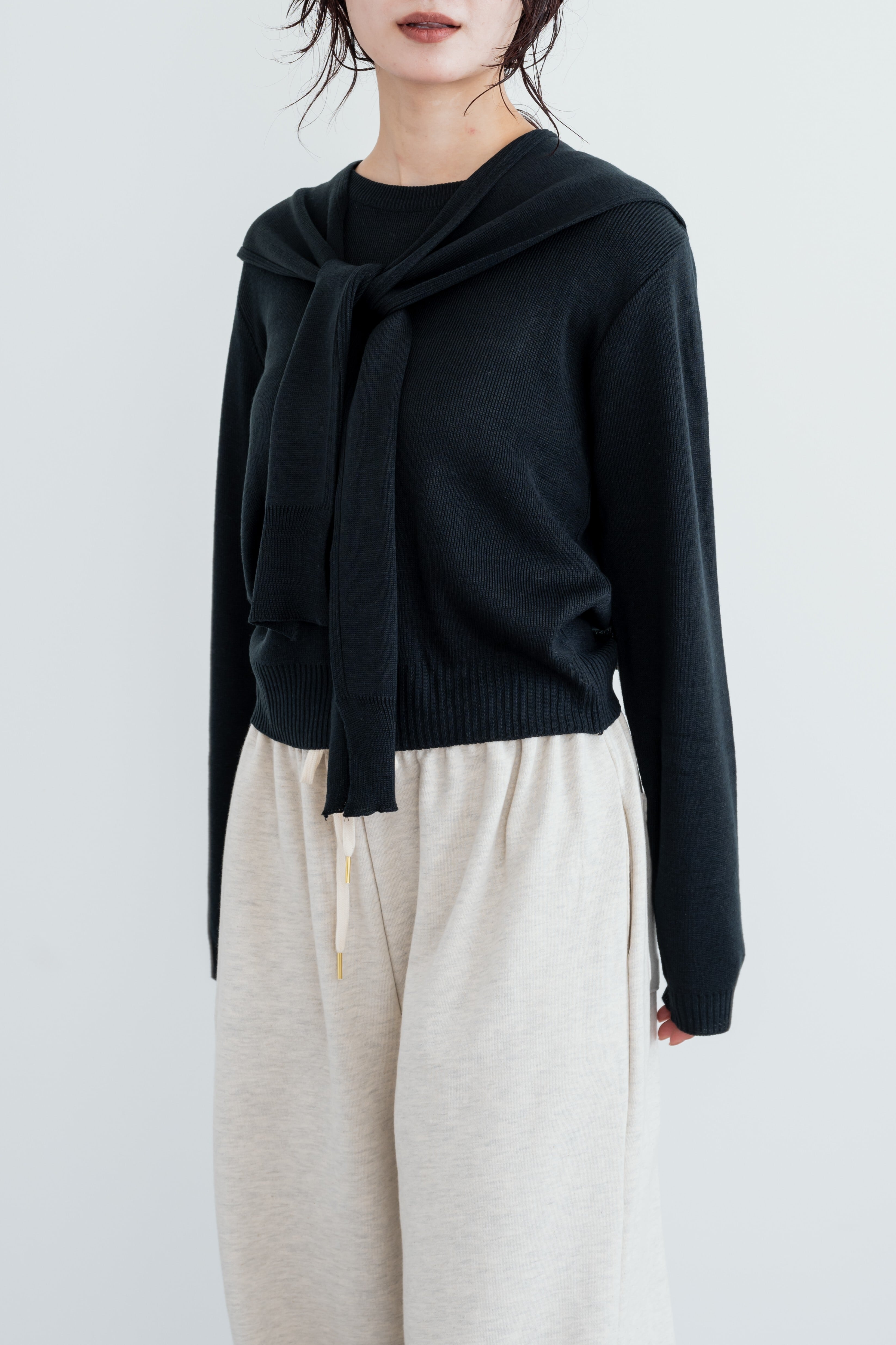 クルーネックニットと、肩掛けニットのセットアイテム。手軽にこなれ感のあるコーディネートが完成します。