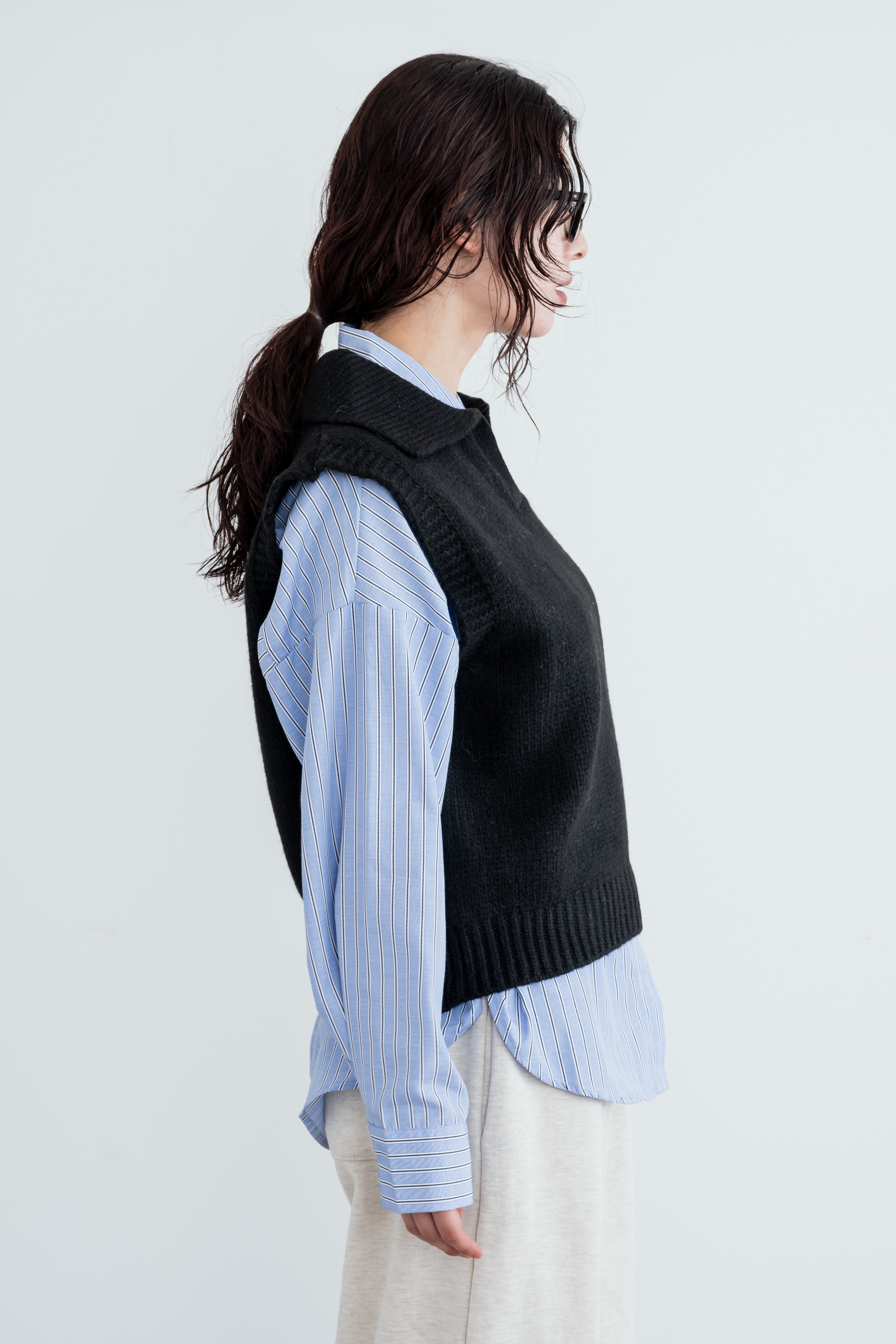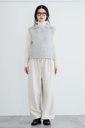 程よいシルエットのベストなのでインナーにブラウスやTシャツを仕込めて、アウターを着ても嵩張らない1枚です。