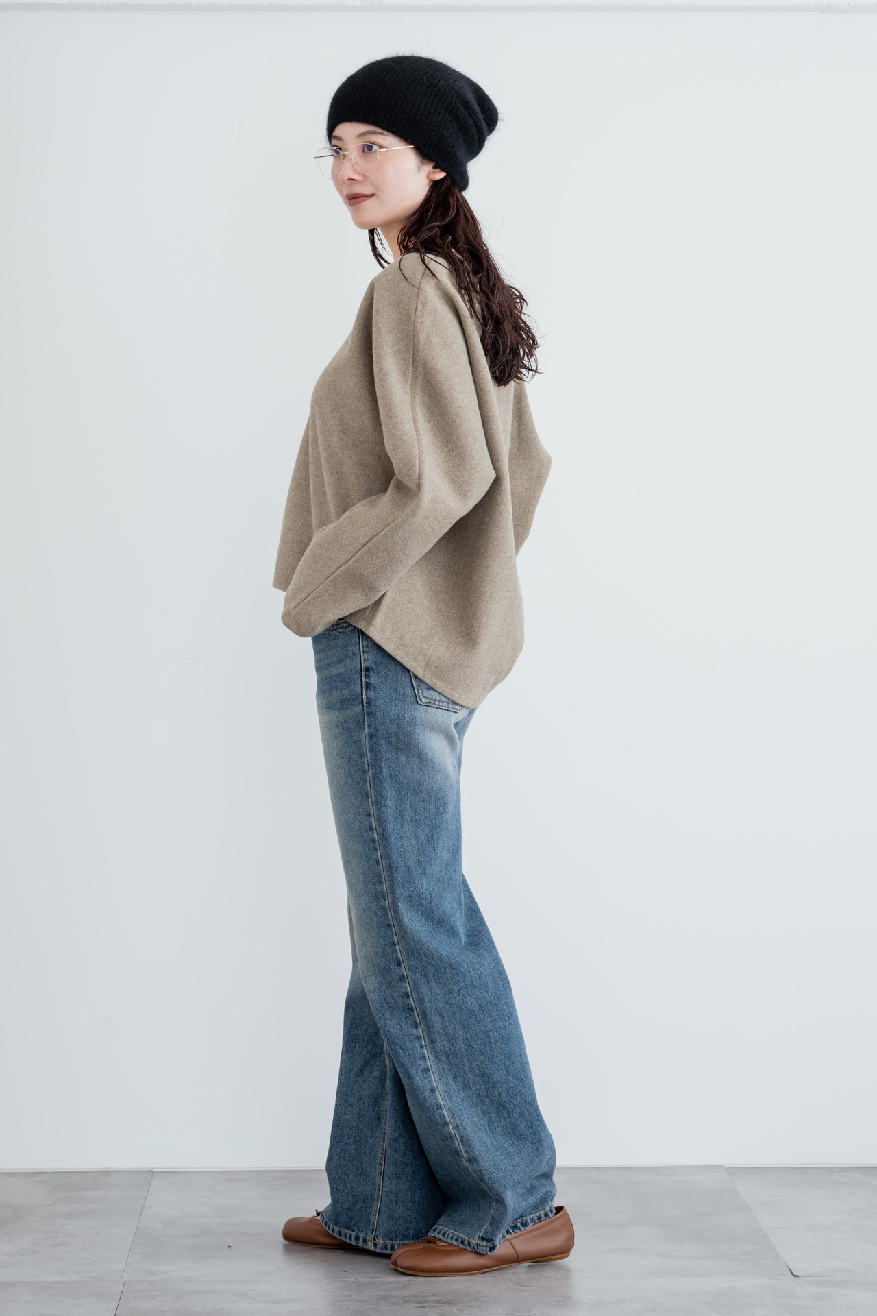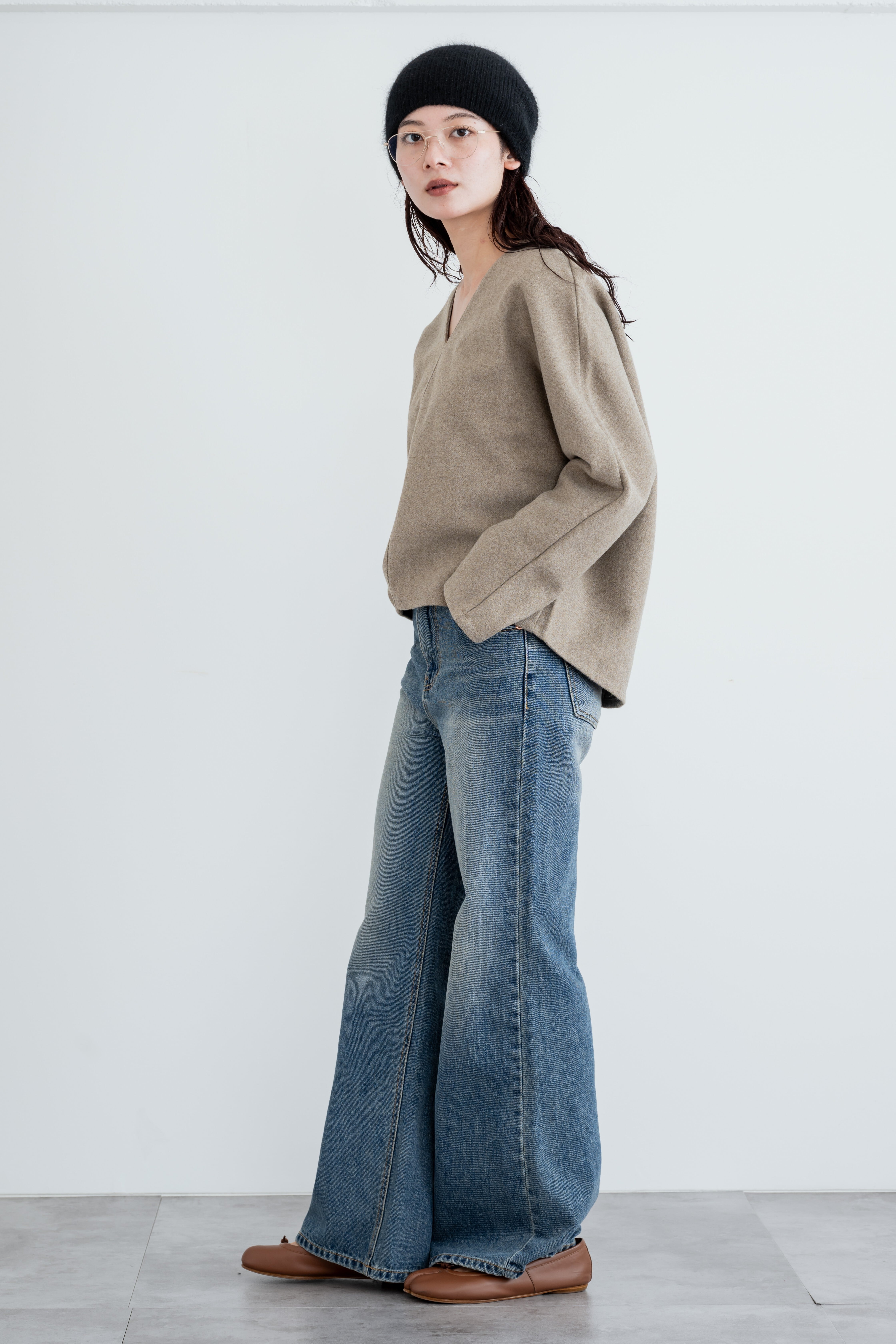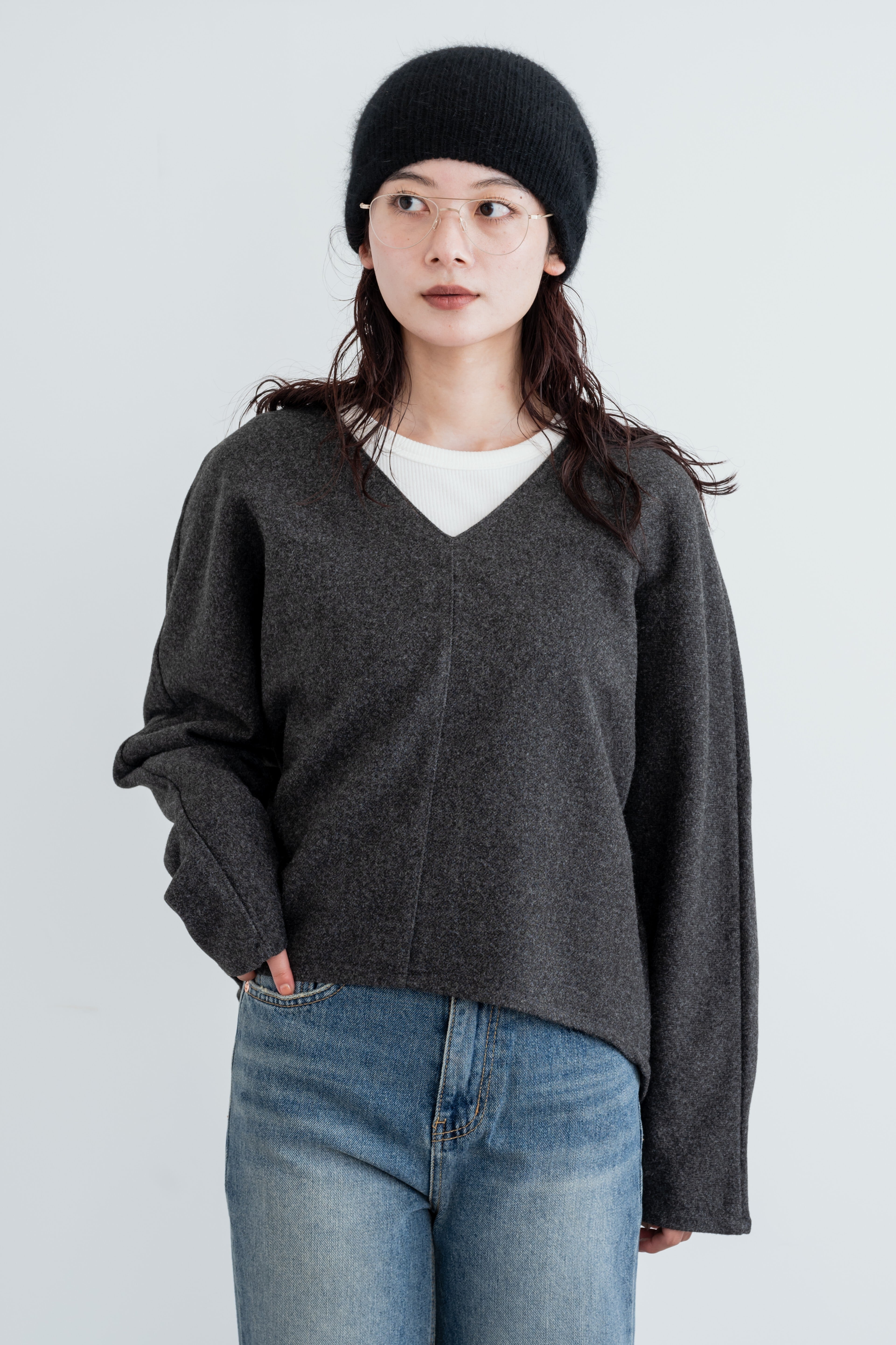 着丈は前が短めで、後ろはお尻が隠れる程の長め丈。Vネックで、デコルテがすっきりと綺麗な印象に。スラックスやデニム、スカートとも相性抜群です。
