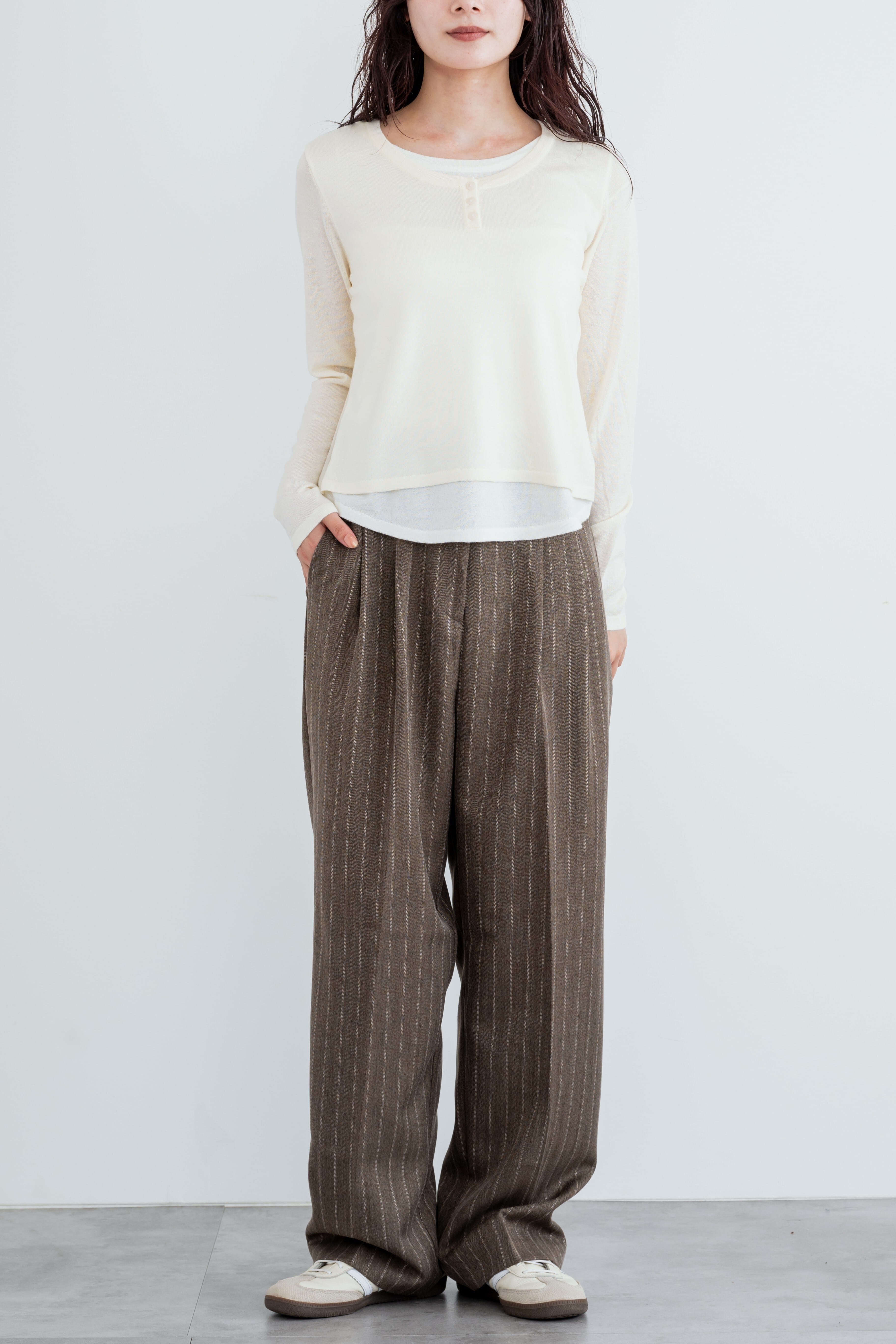 ツータックで綺麗なシルエット。シワになりにくい素材でお洗濯も楽々。ウエスト後ろ部分がゴムになっているのでストレスフリーな着心地。