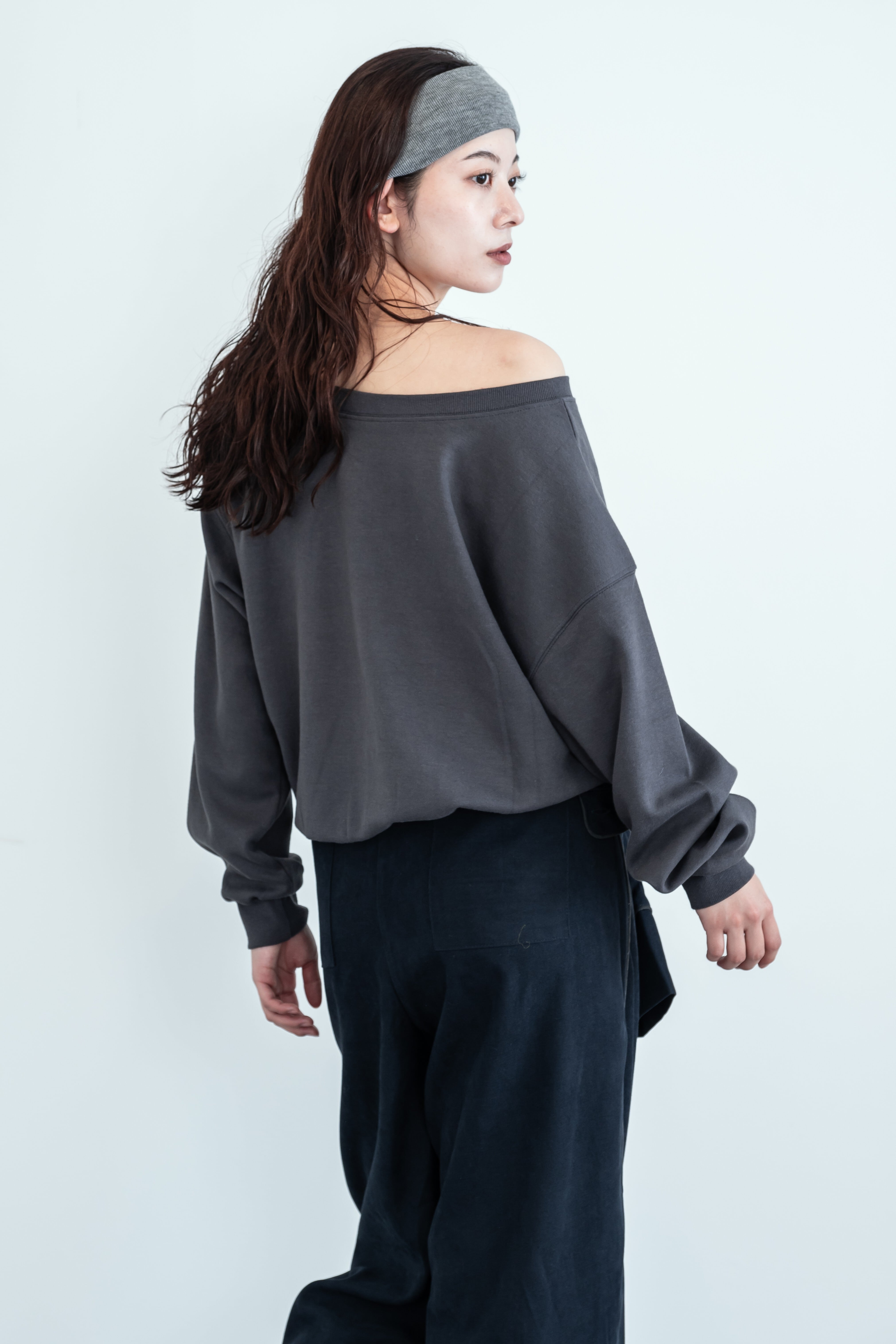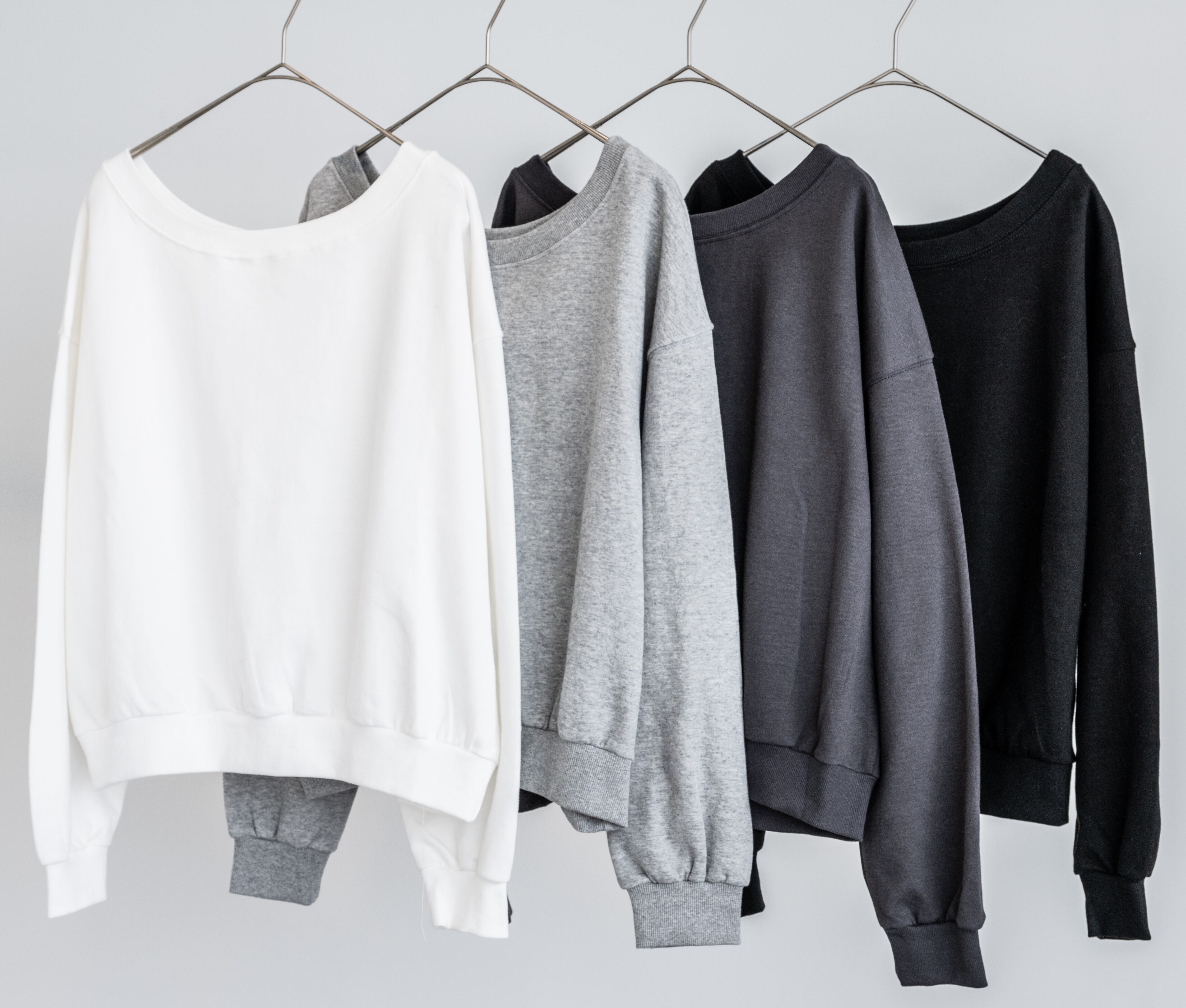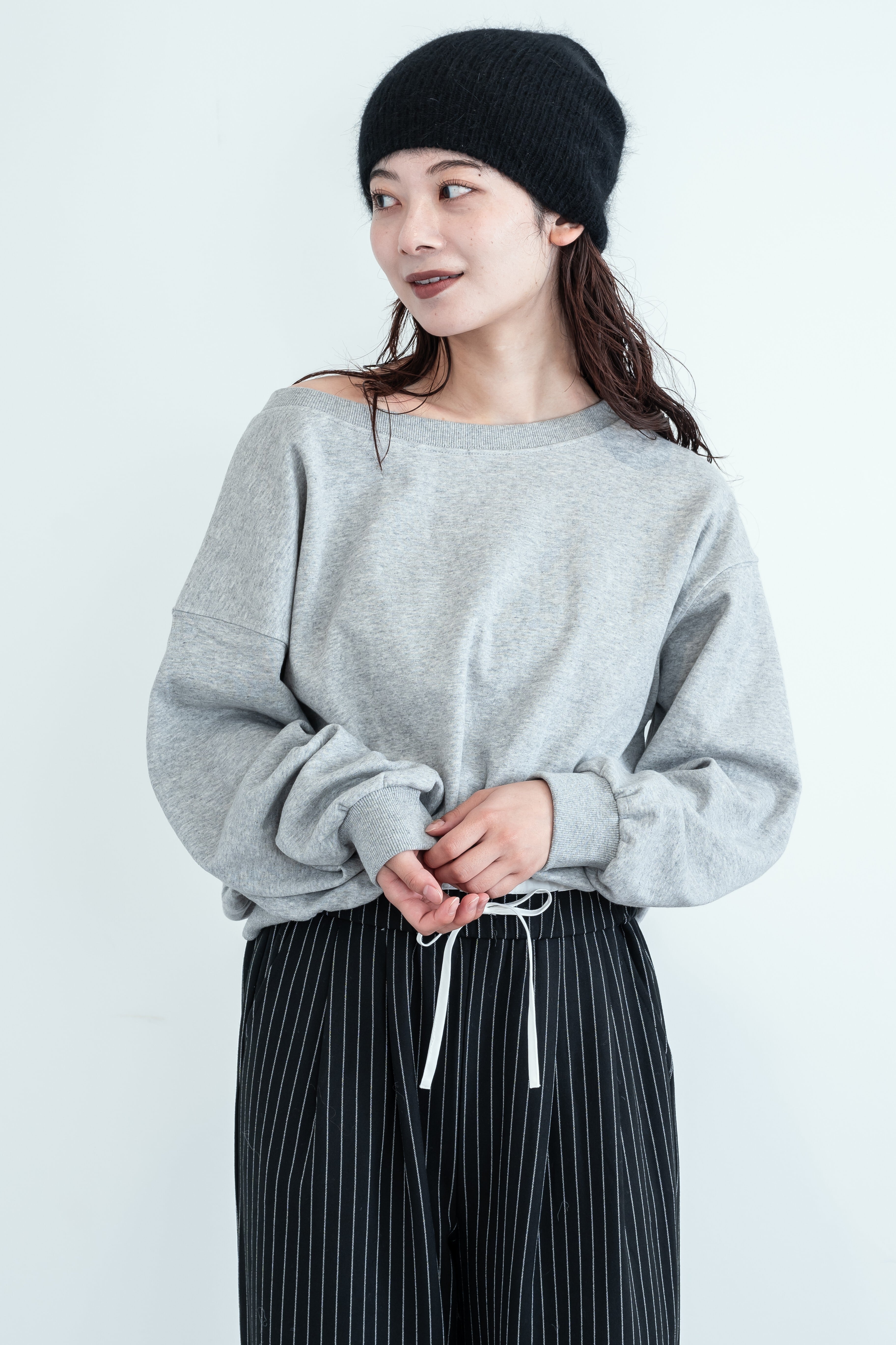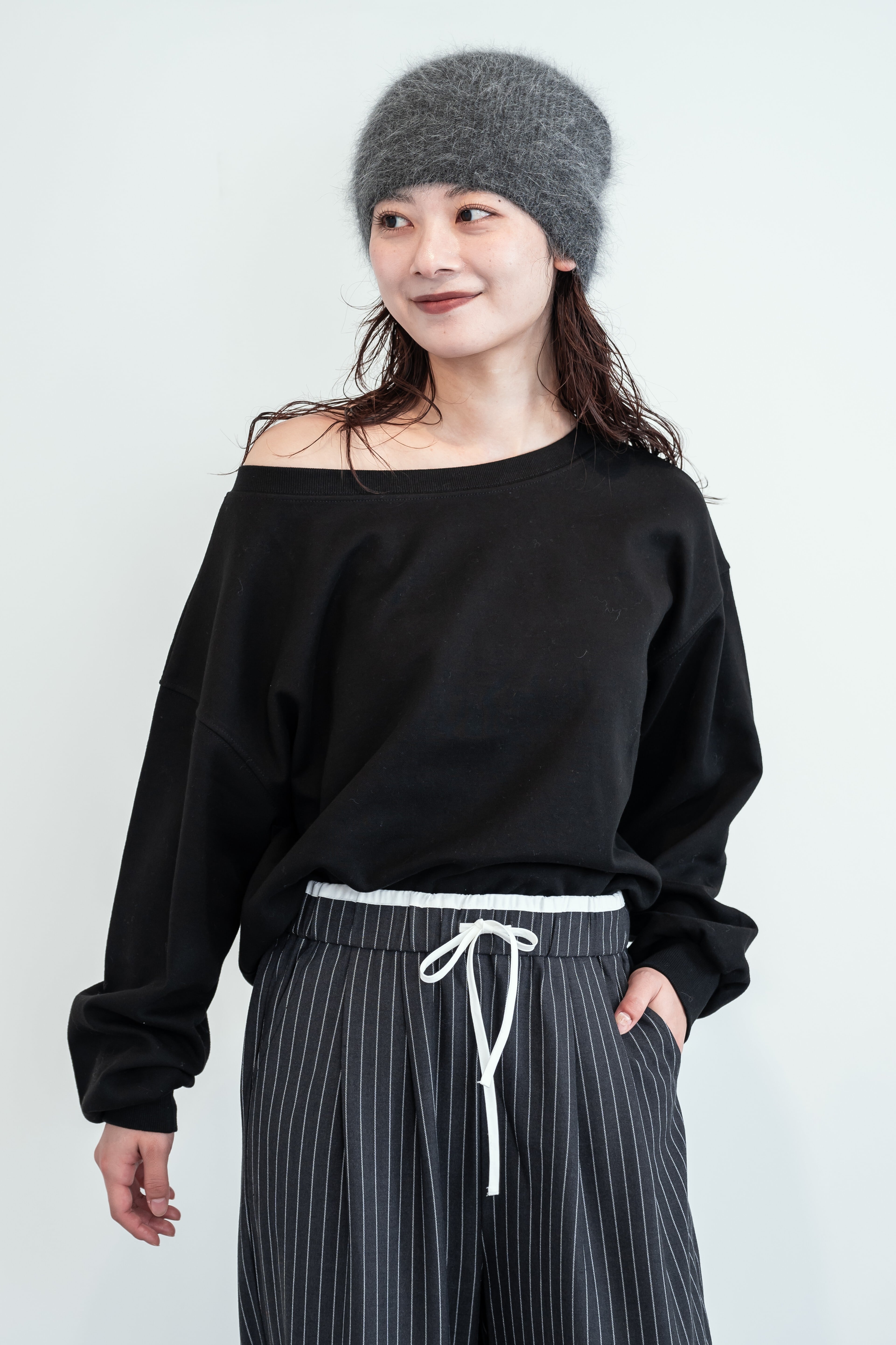 ワンショルダー・オフショルダーでも着られるマルチウェイのスウェットプルオーバー。デコルテがすっきり綺麗に見えます。