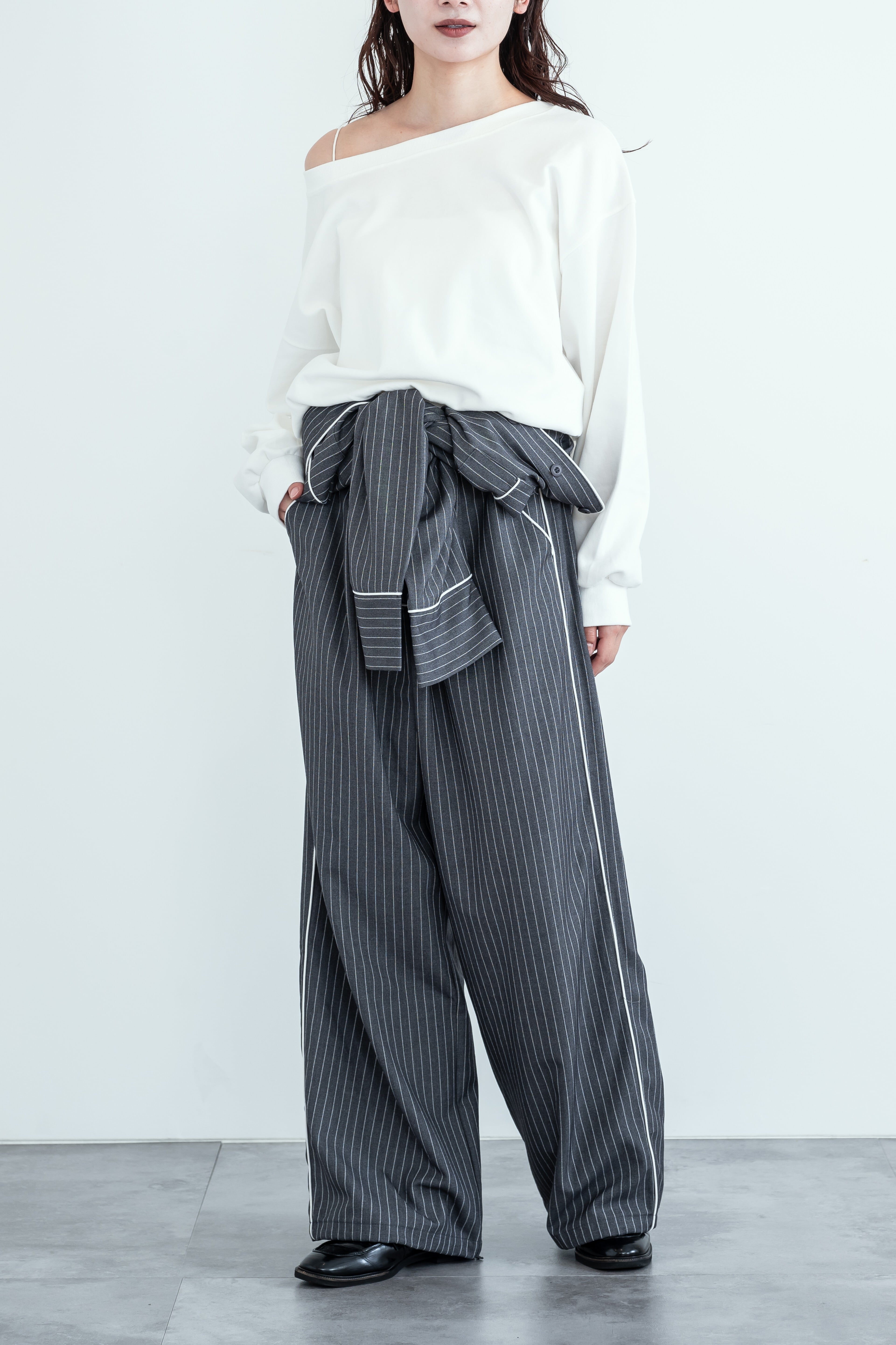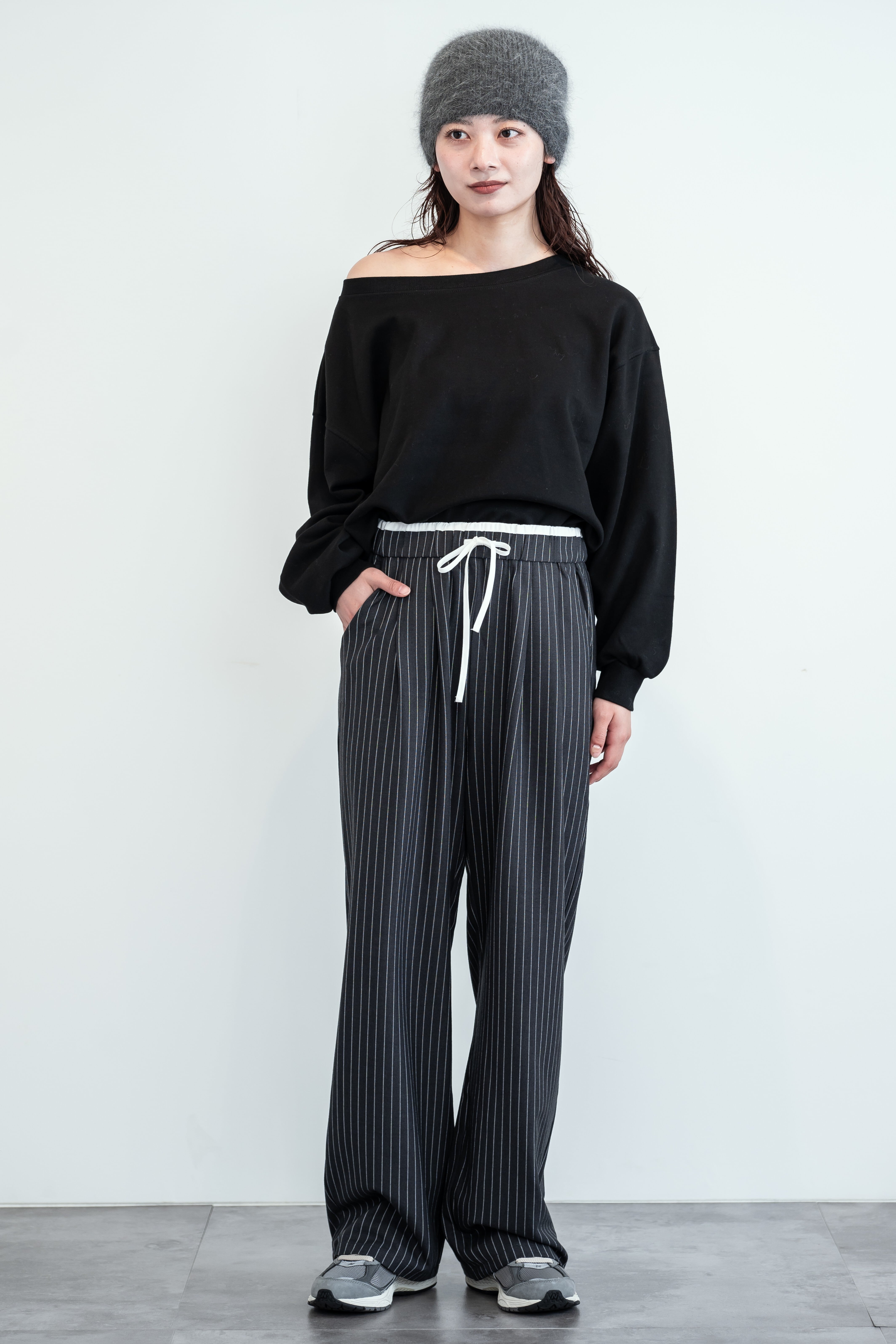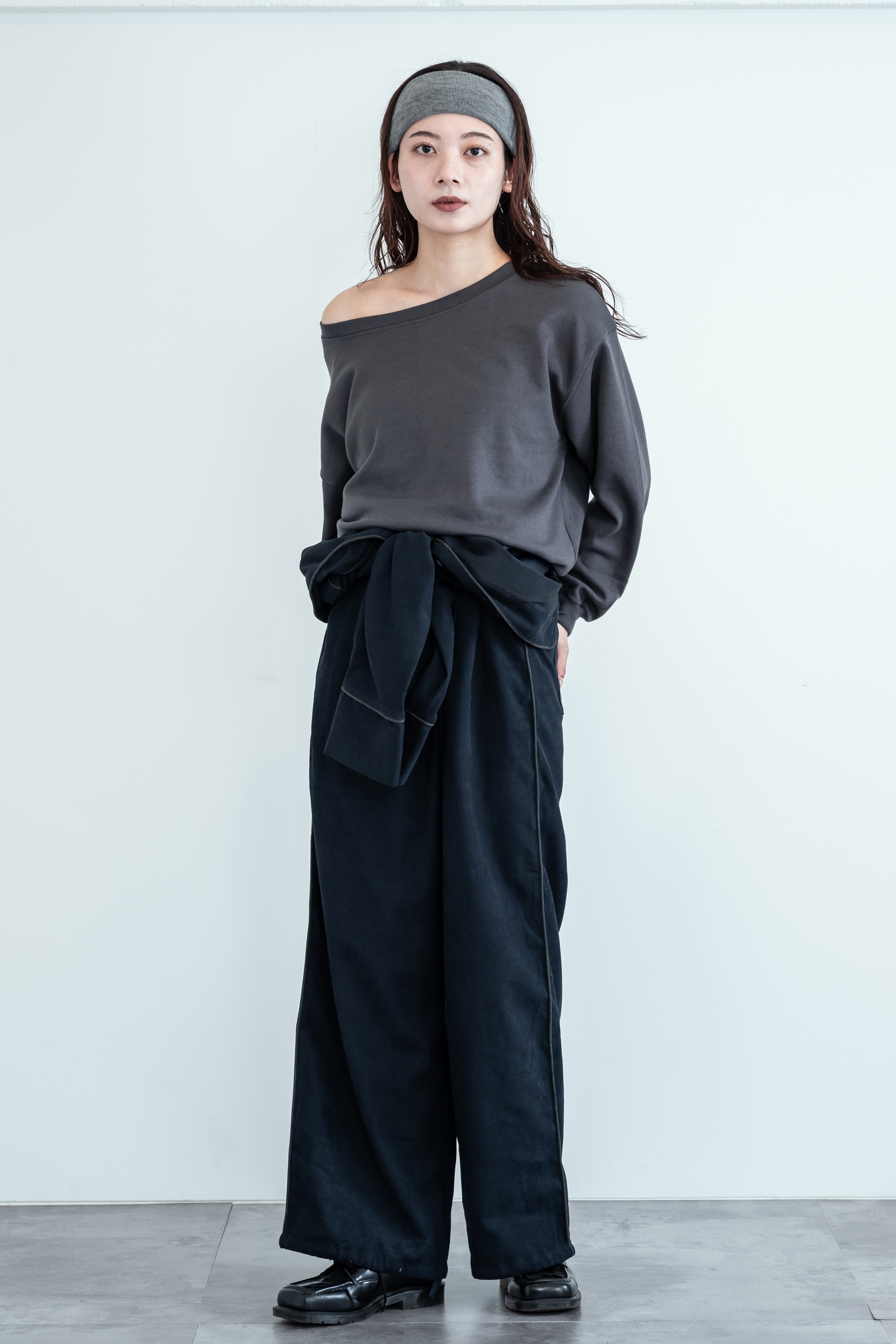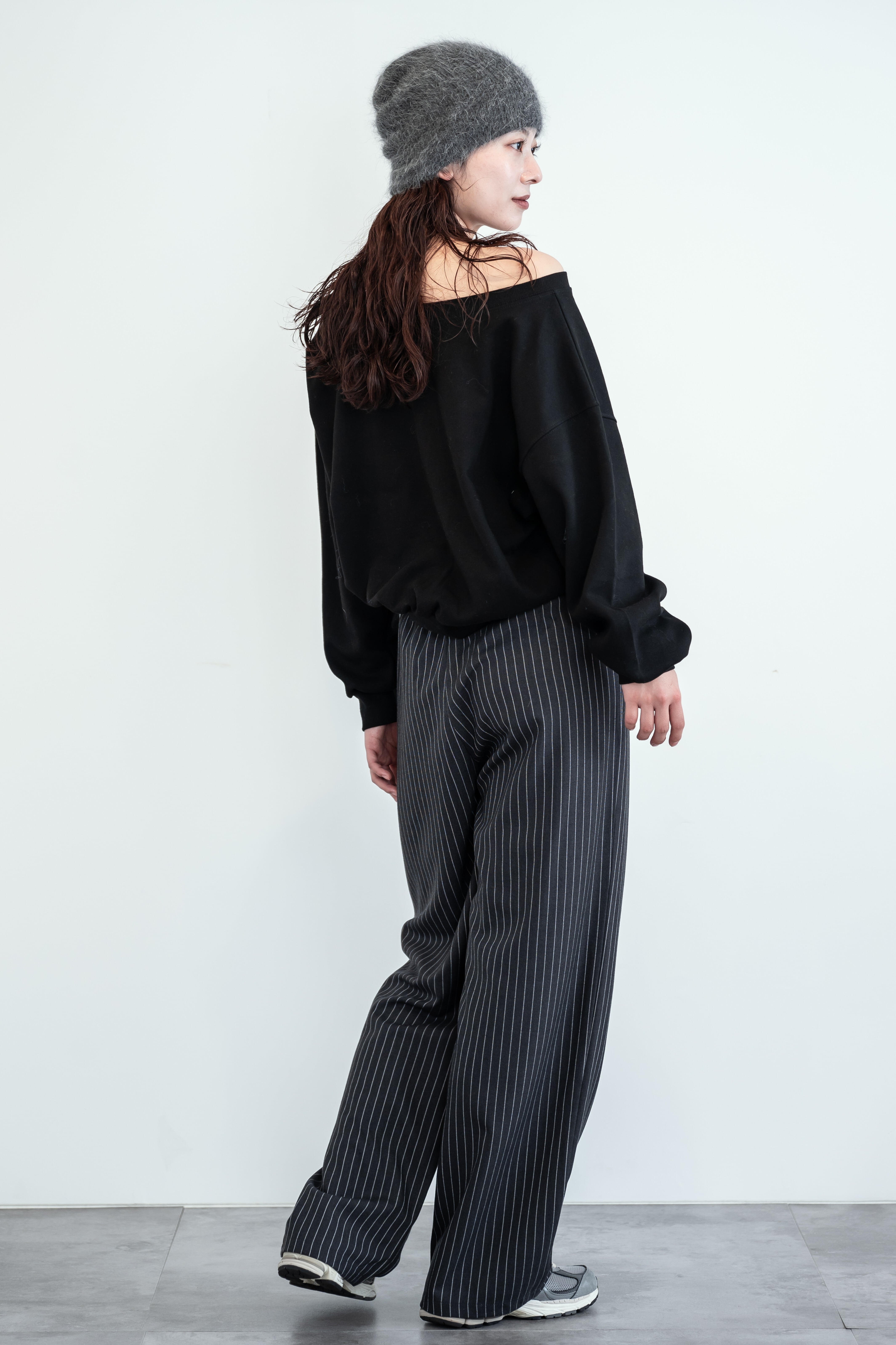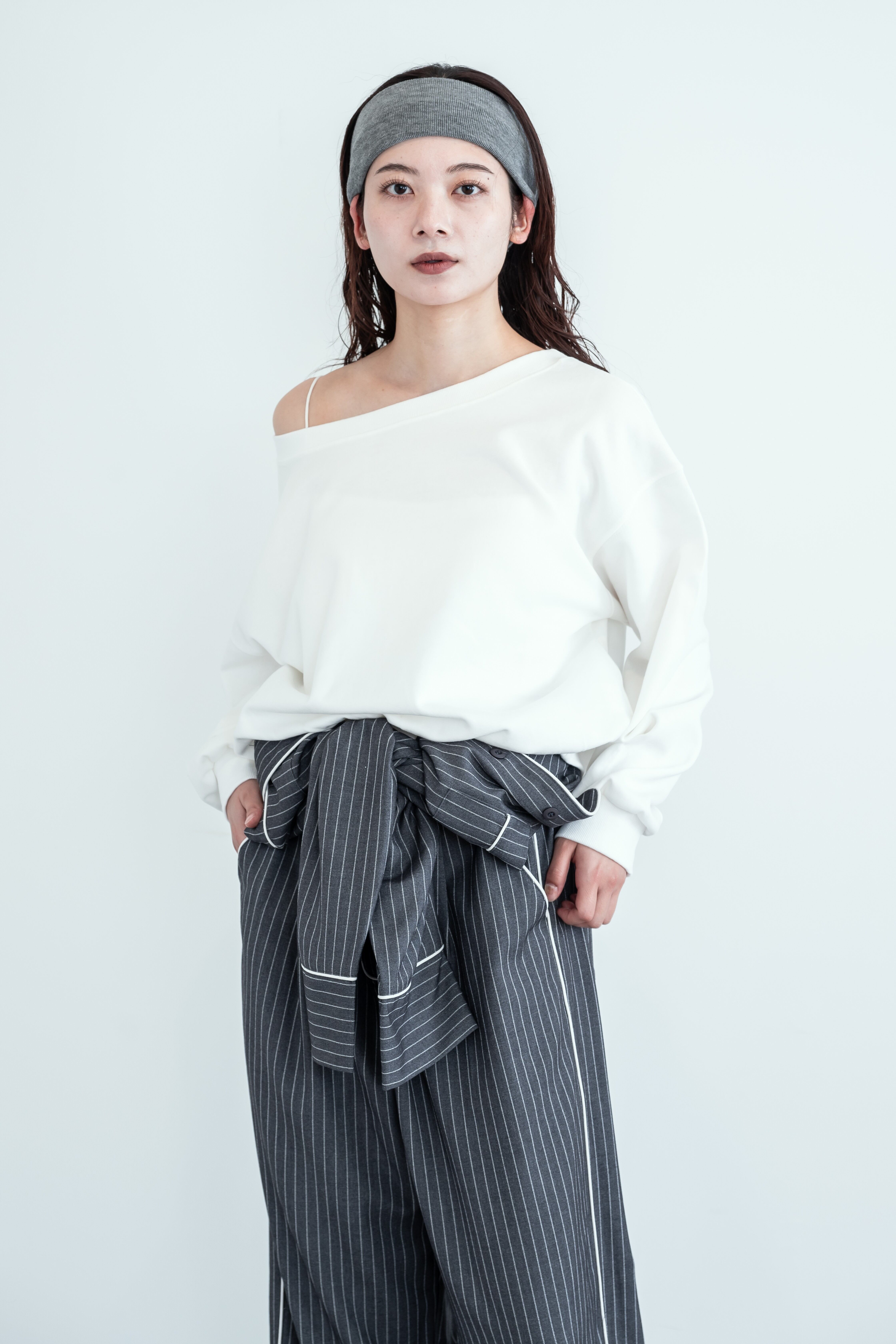 ワンショルダー・オフショルダーでも着られるマルチウェイのスウェットプルオーバー。デコルテがすっきり綺麗に見えます。