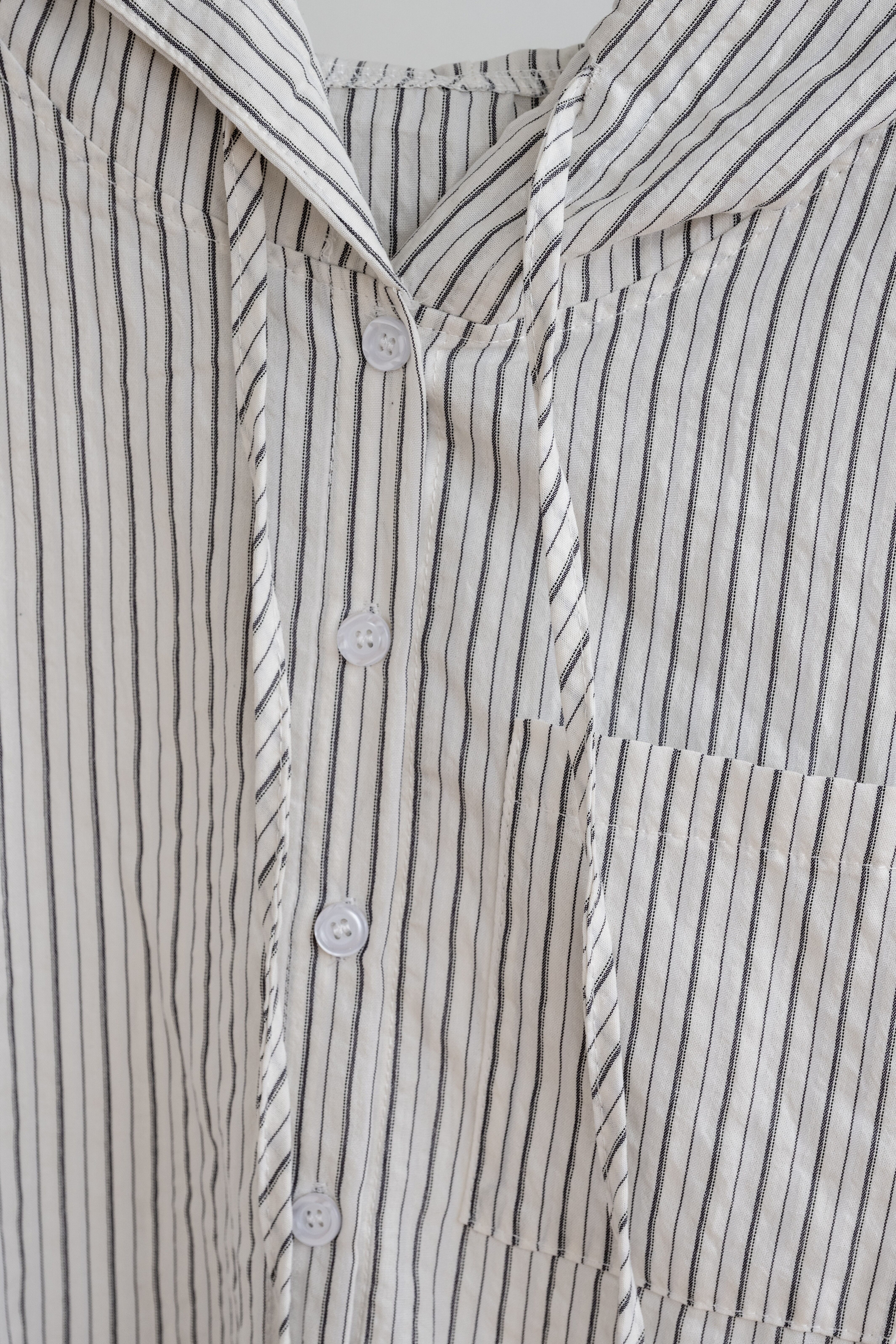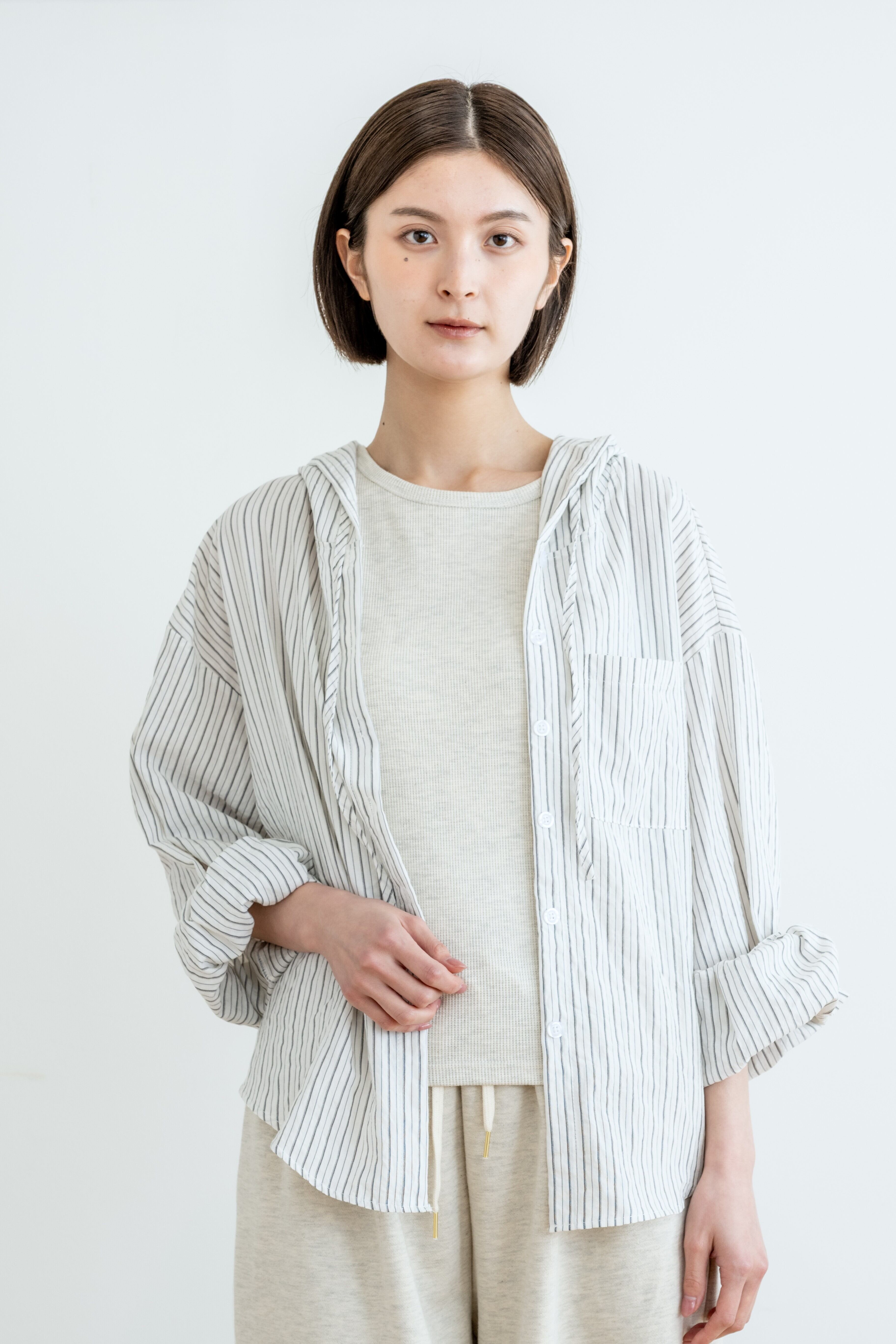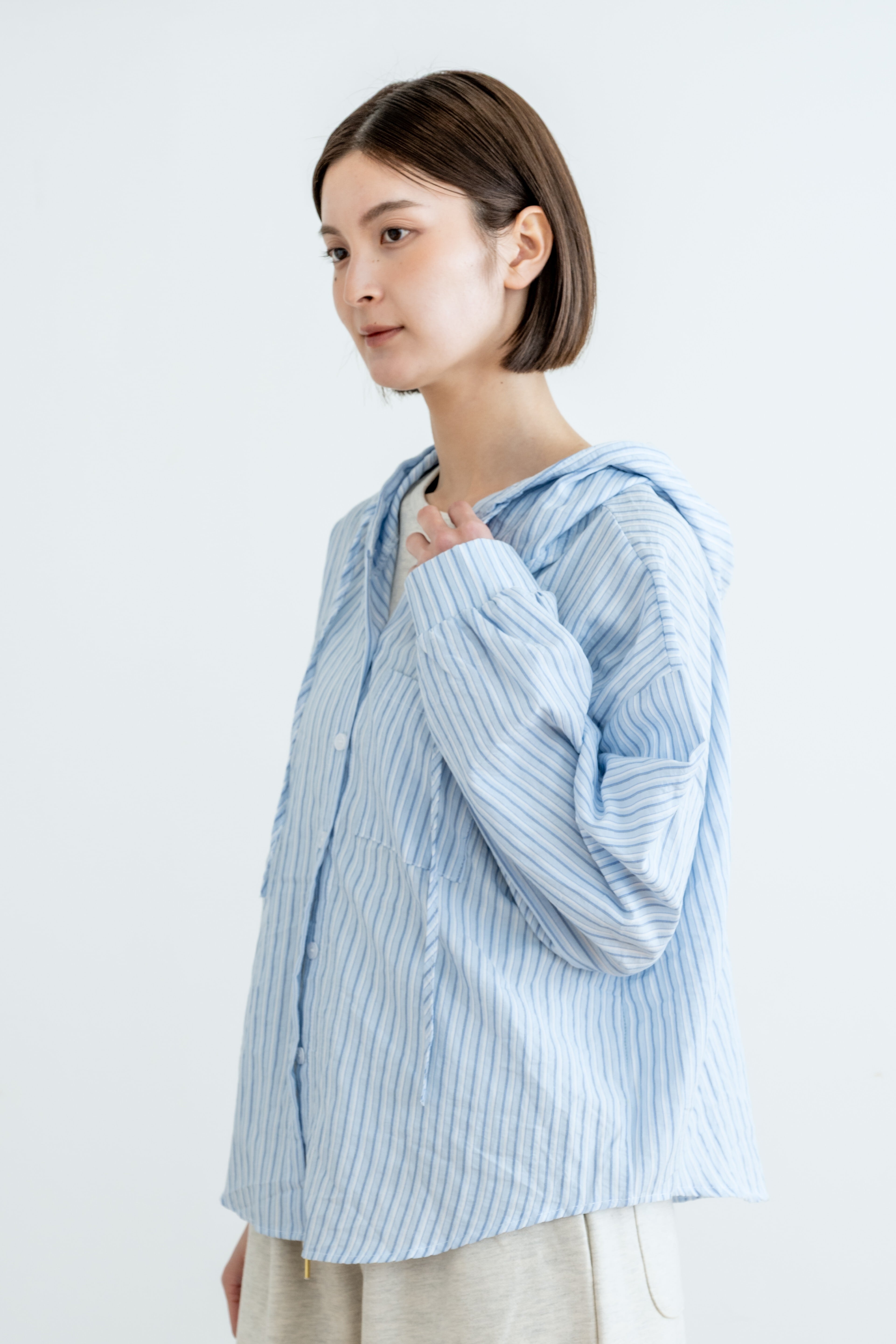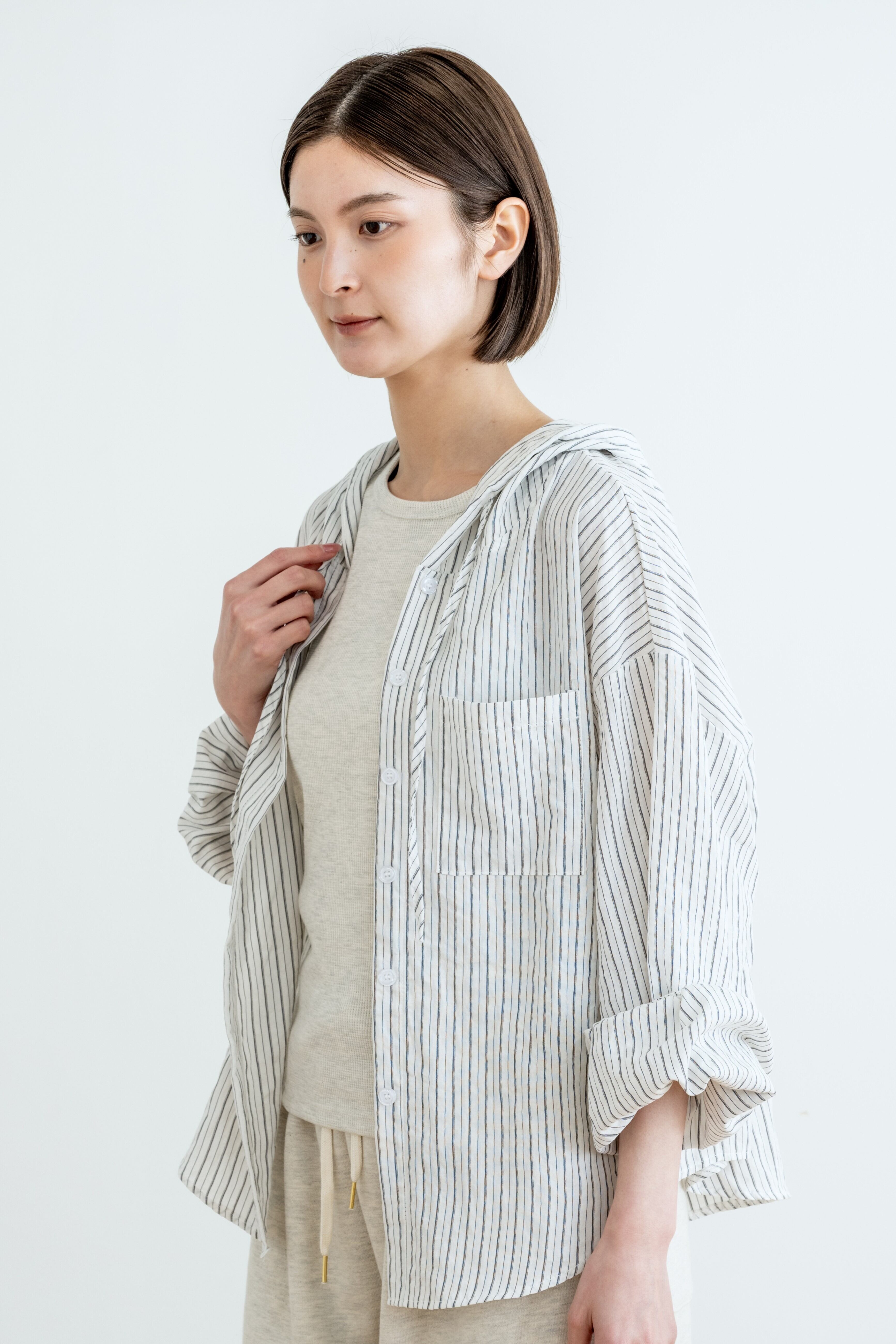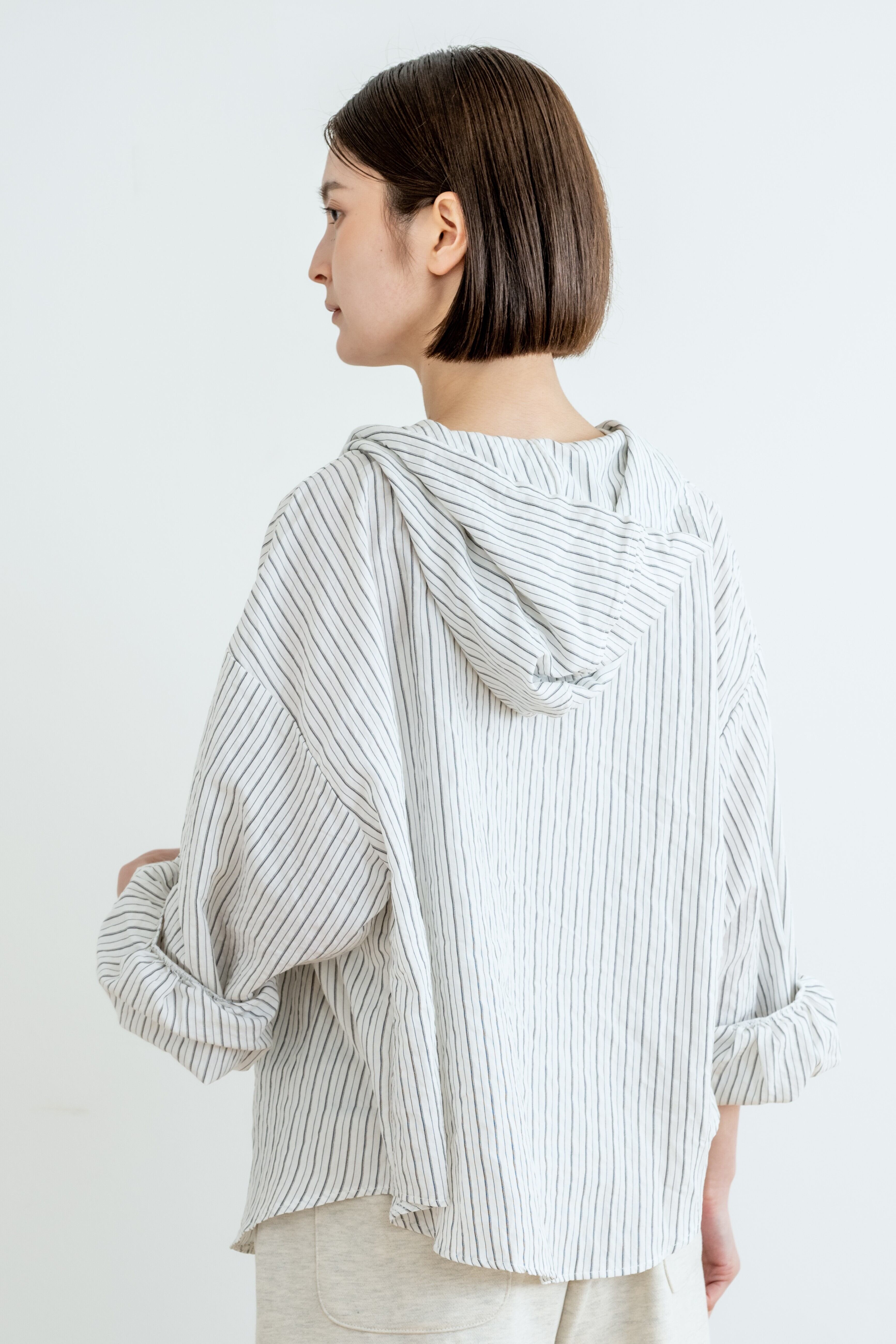 定番のストライプシャツに、フードをプラスしてカジュアルにアップデート。