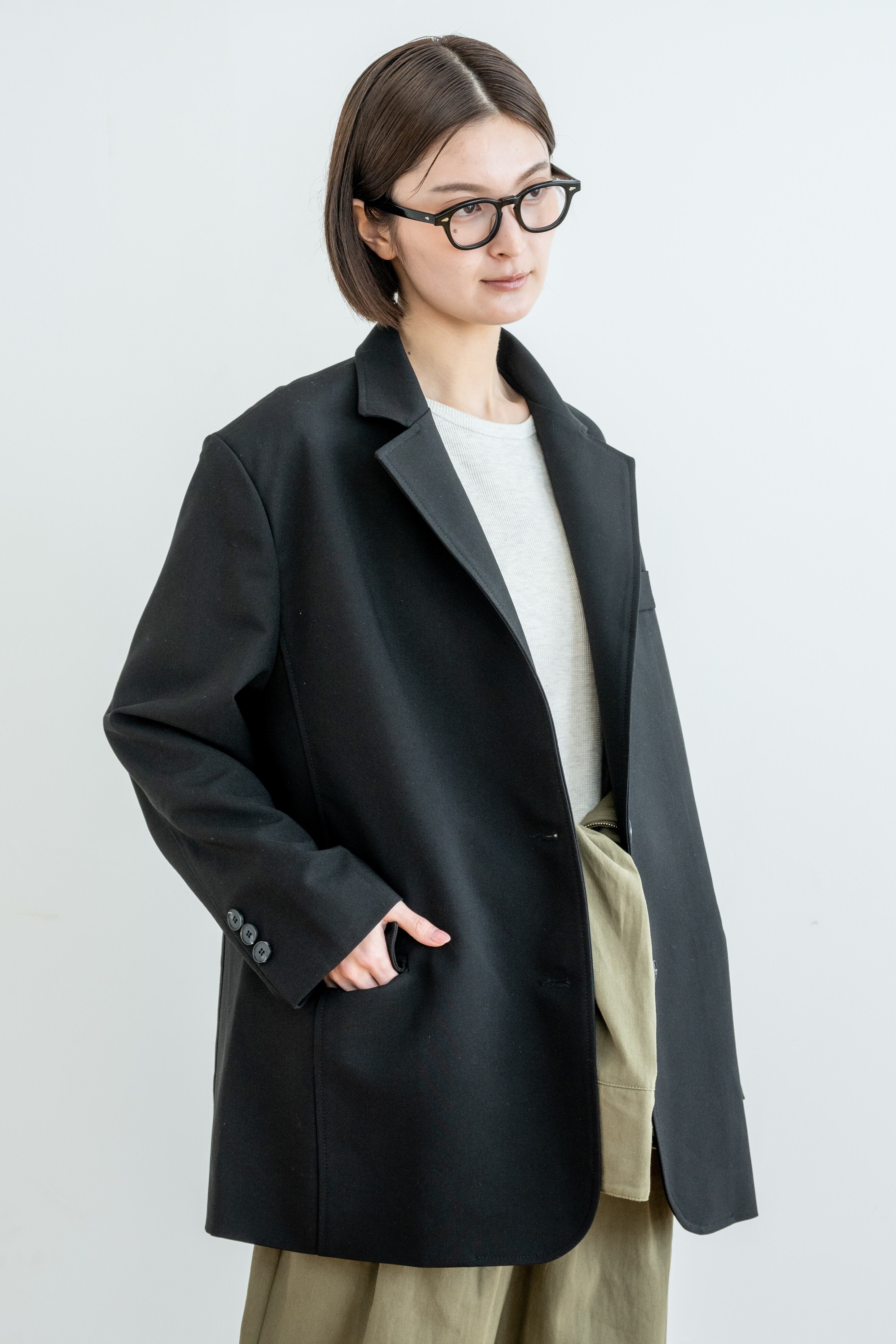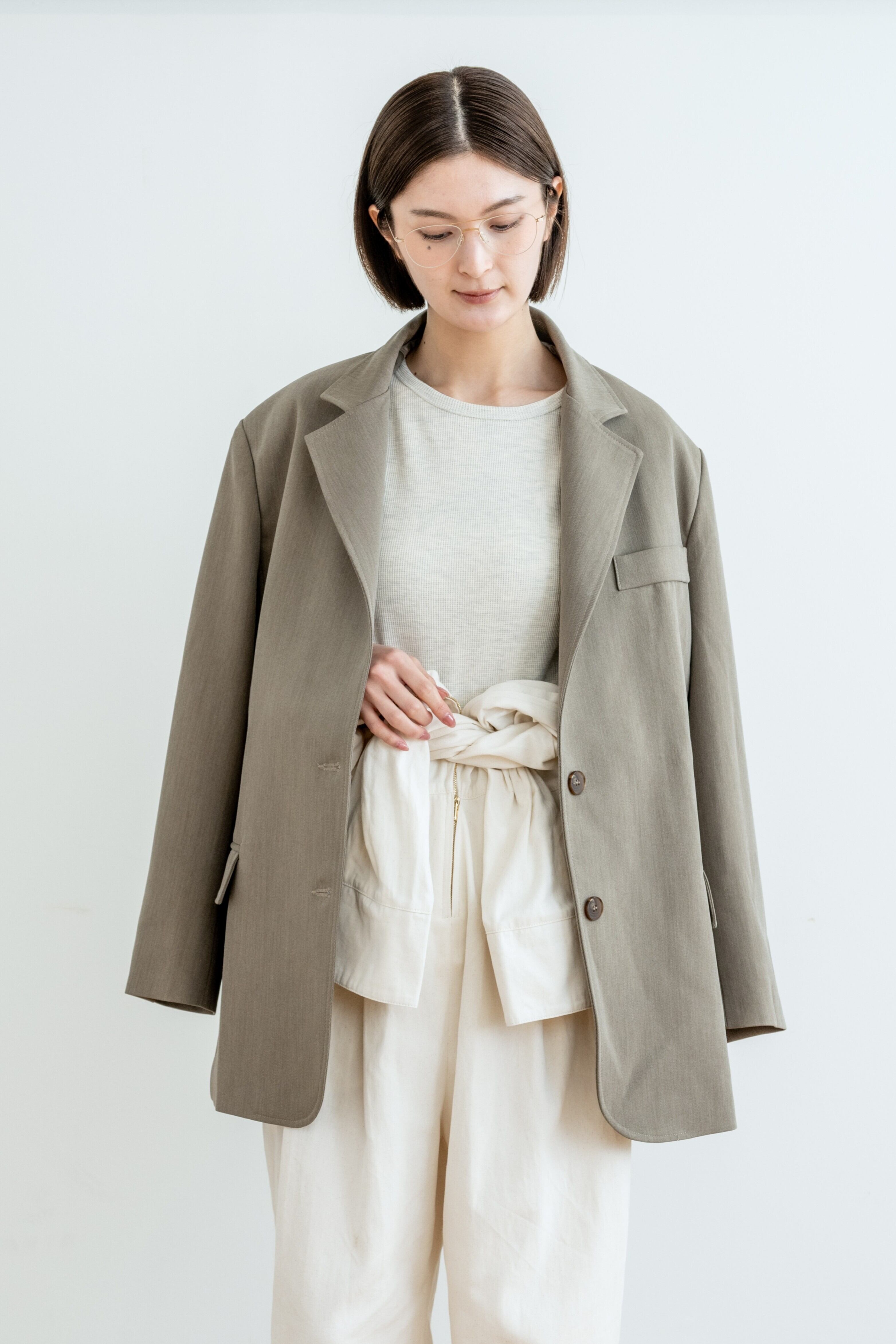 肩の力が抜けたドロップショルダーと、広めの身幅で、カーディガン感覚でさらりと羽織れます。