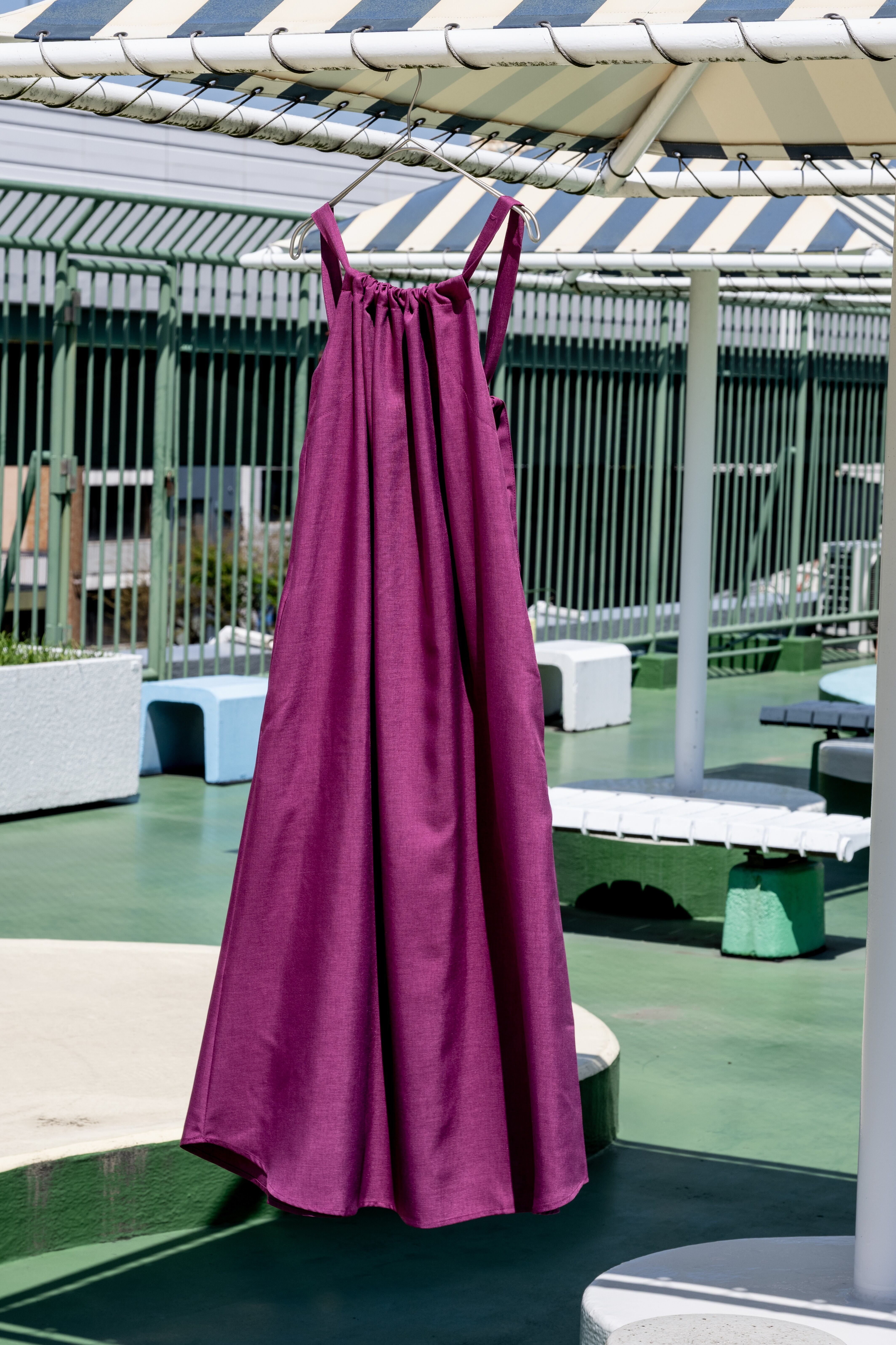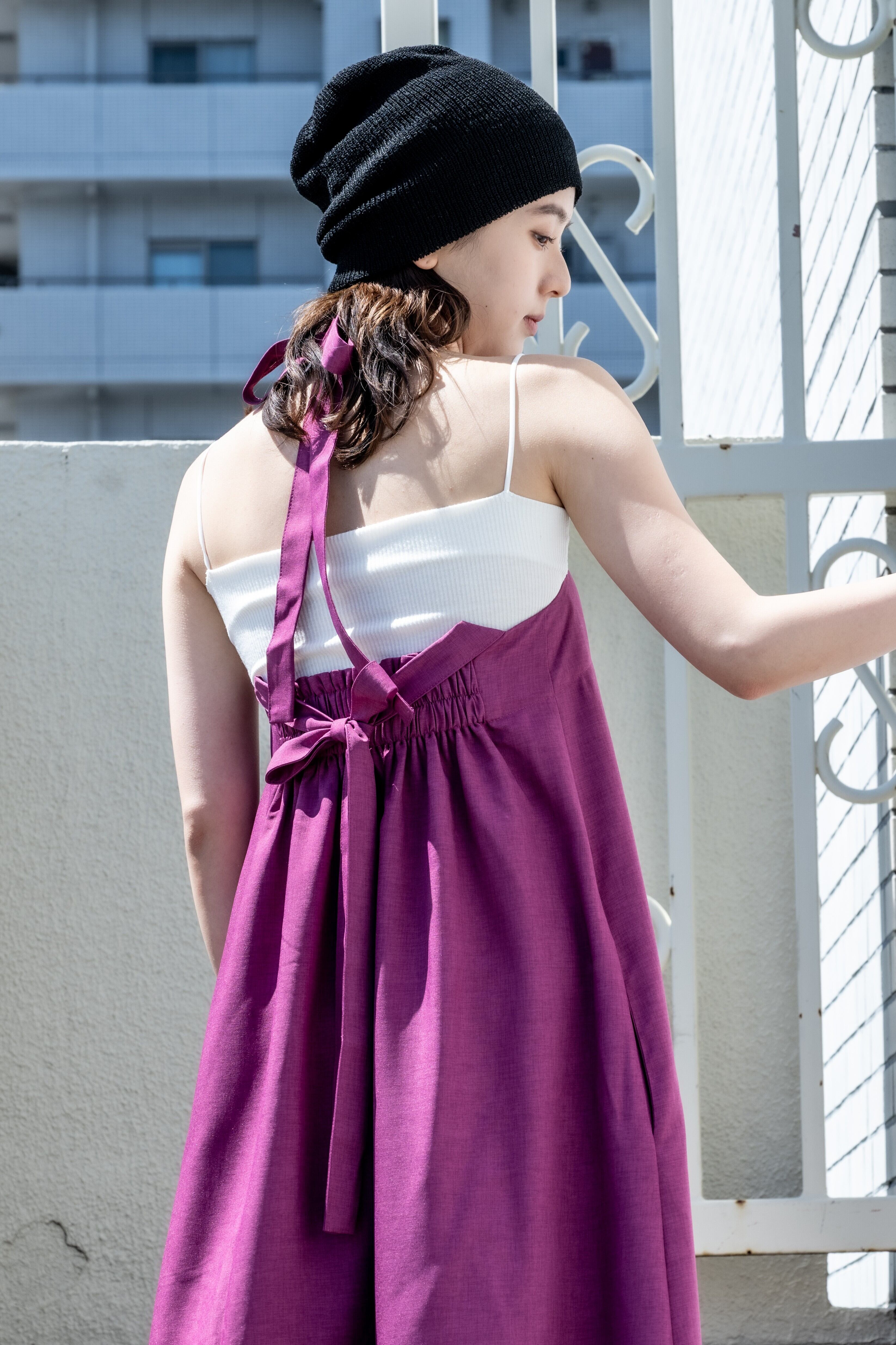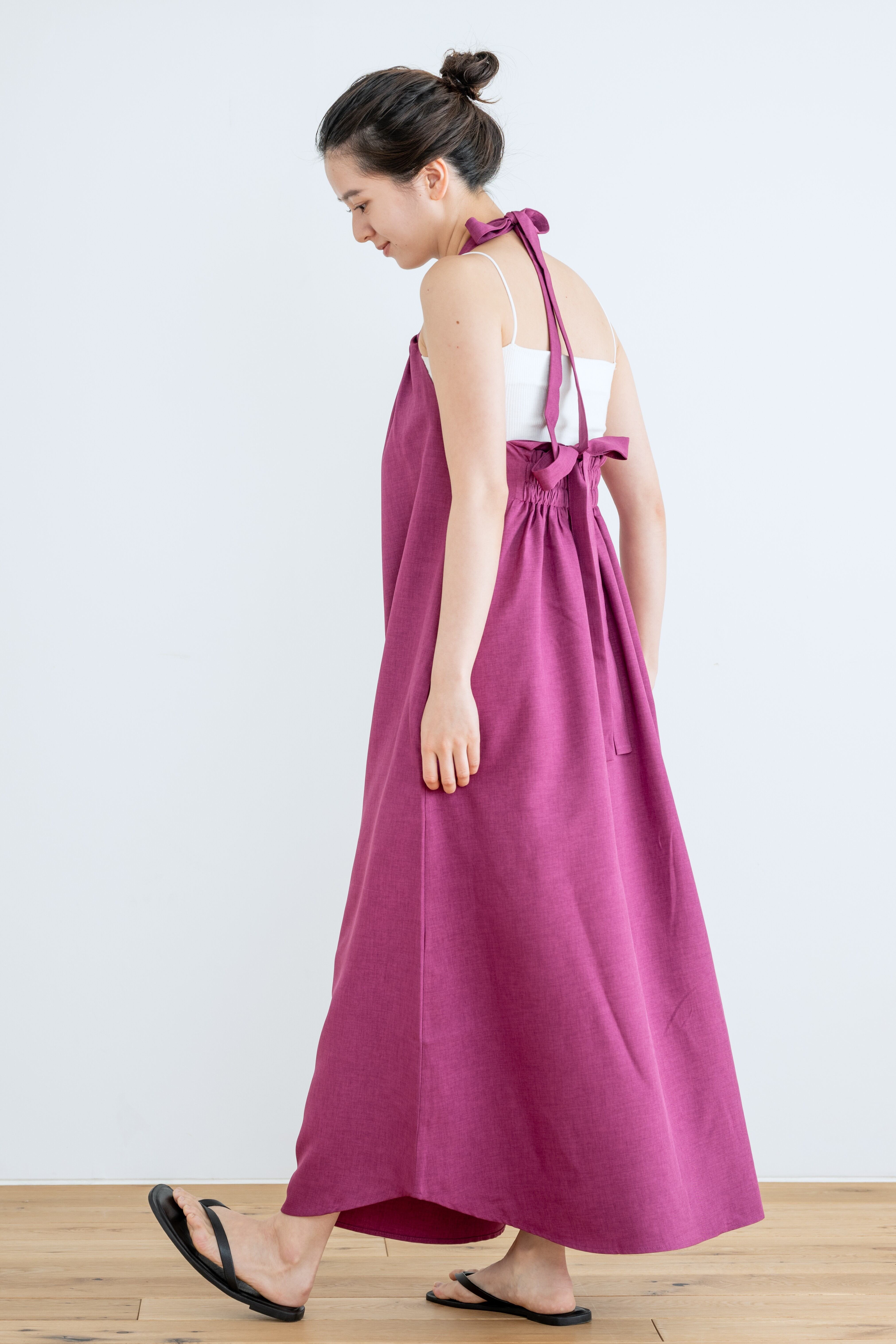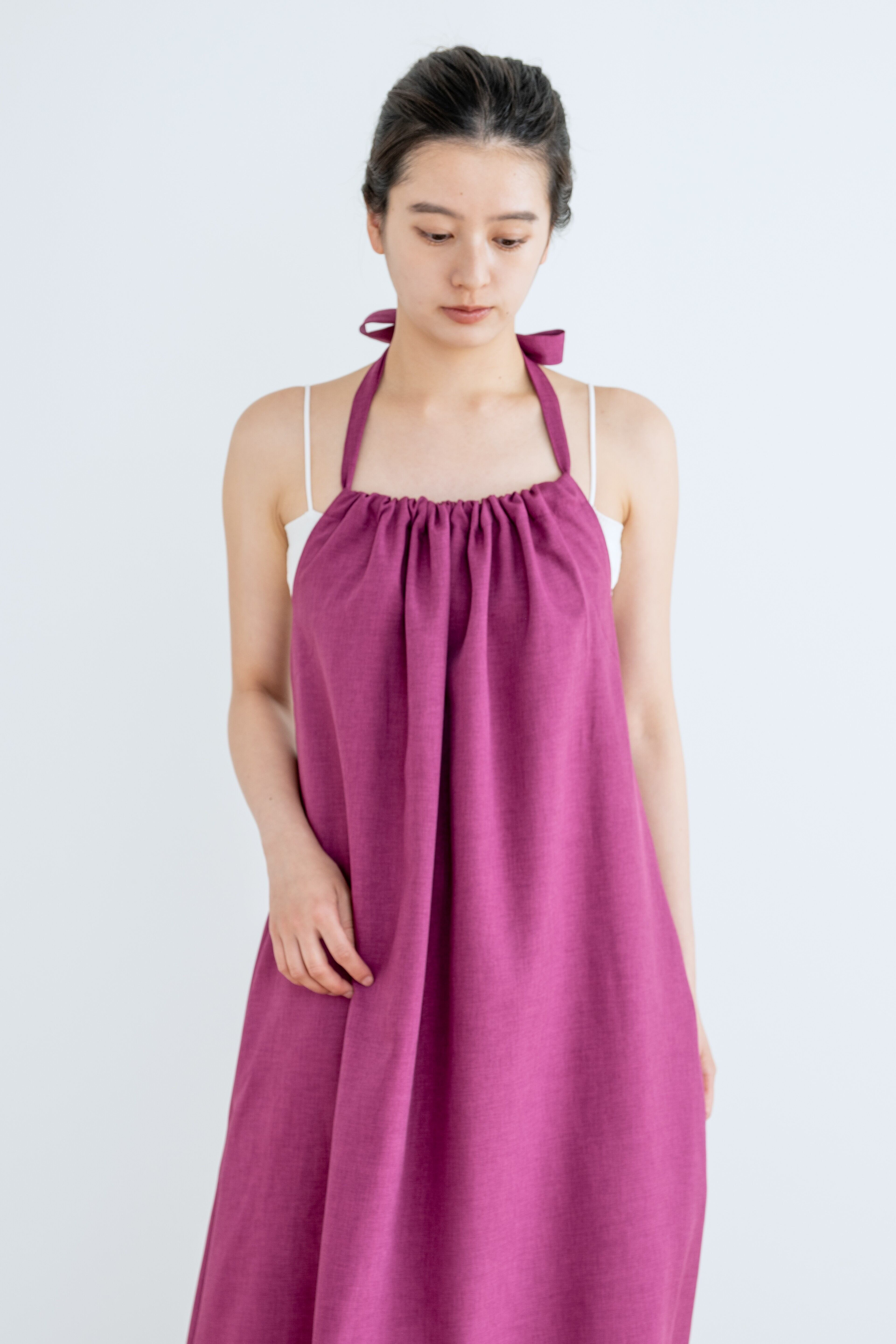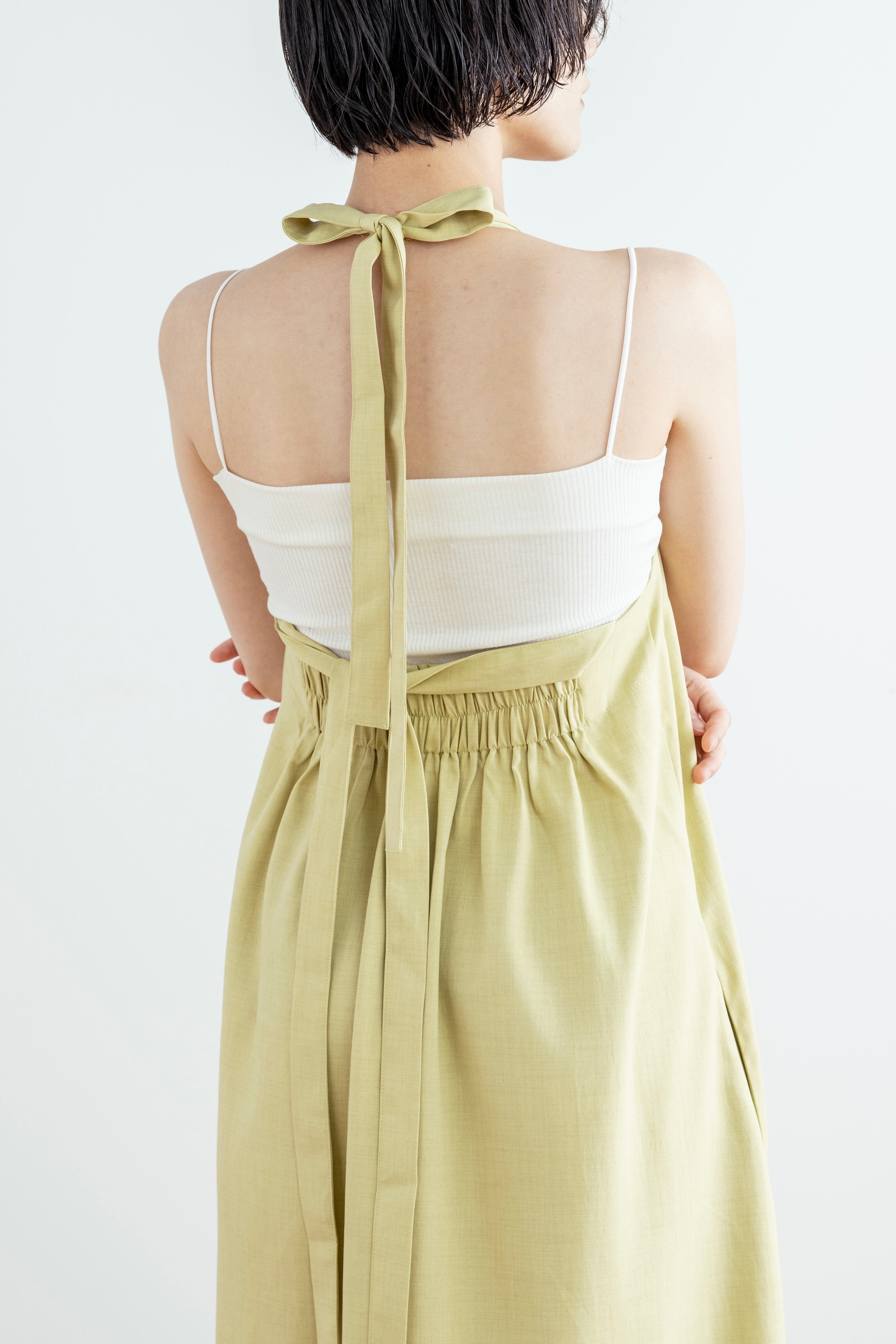 前後着用で、肩紐の結び方でアレンジや、丈調節が可能。