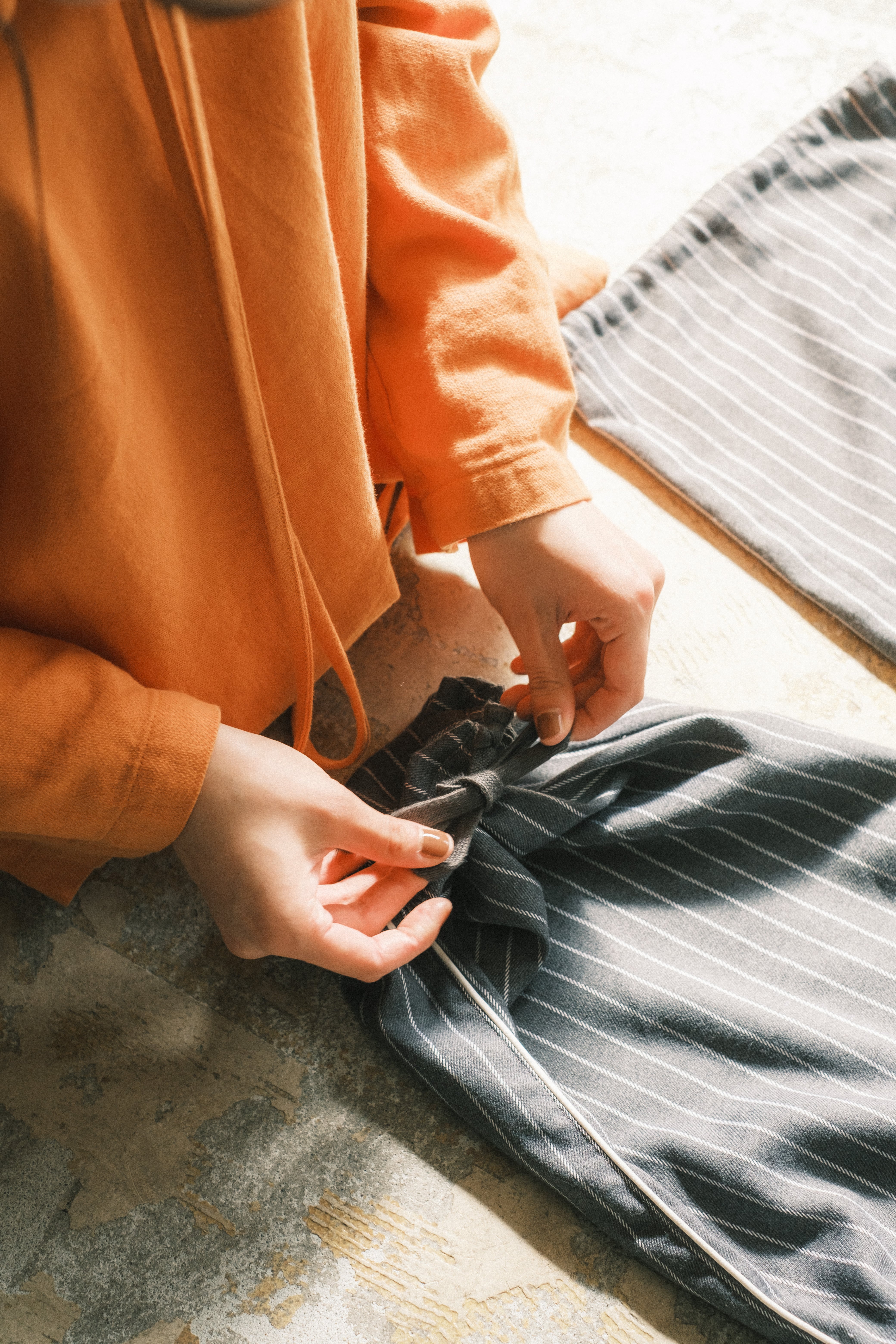 そのまま着るもよし。ウエストを絞るもよし。裾を絞るもよし。袖をまくるもよし。胸元を開くもよし。腰で縛りパンツスタイルで着るもよし。生活シーンや個性に合わせて様々な着方を楽しめます。