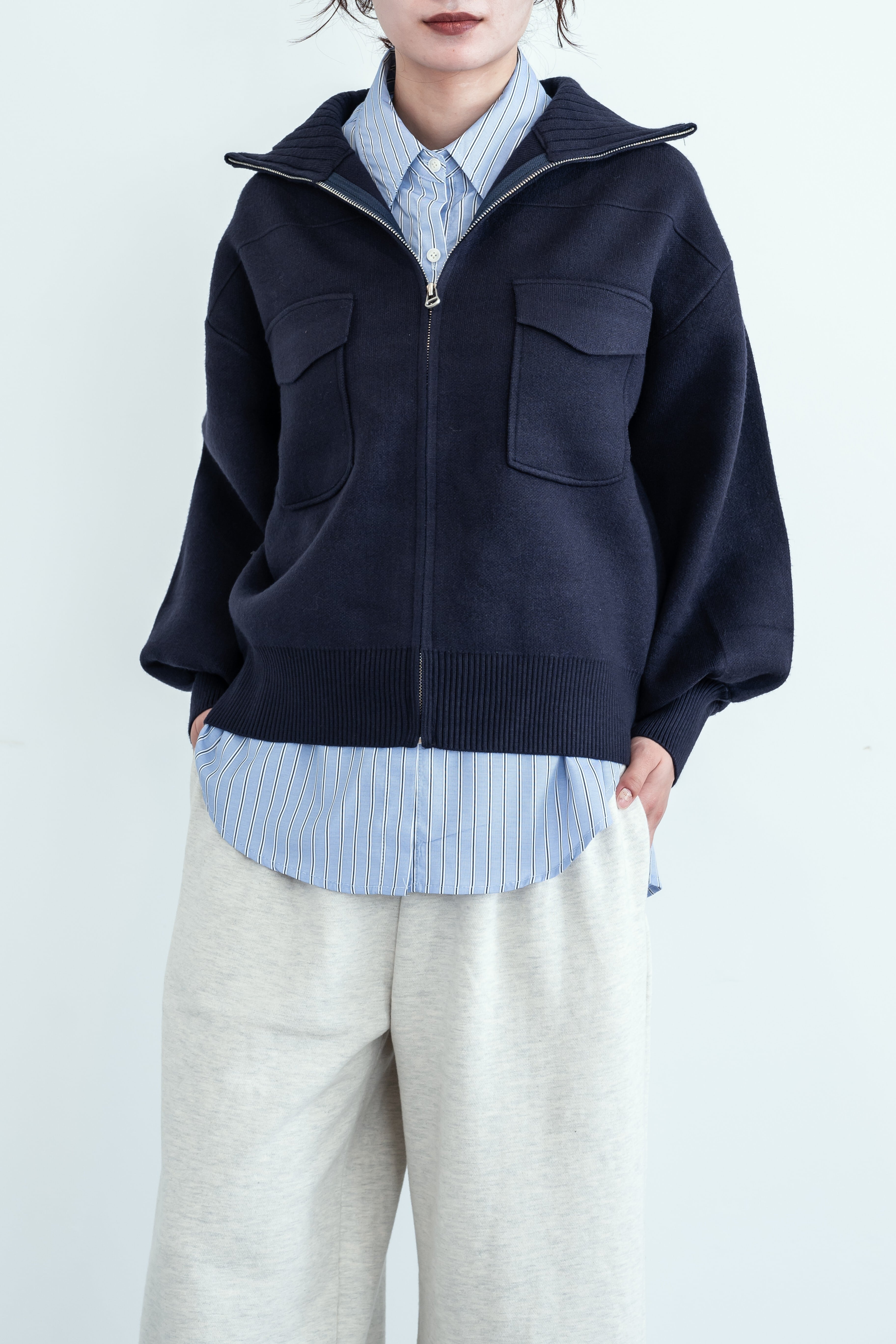 モチモチとした肌触りで素肌に着ても心地のいいニット。ジップを上げる位置によって、印象が変化。