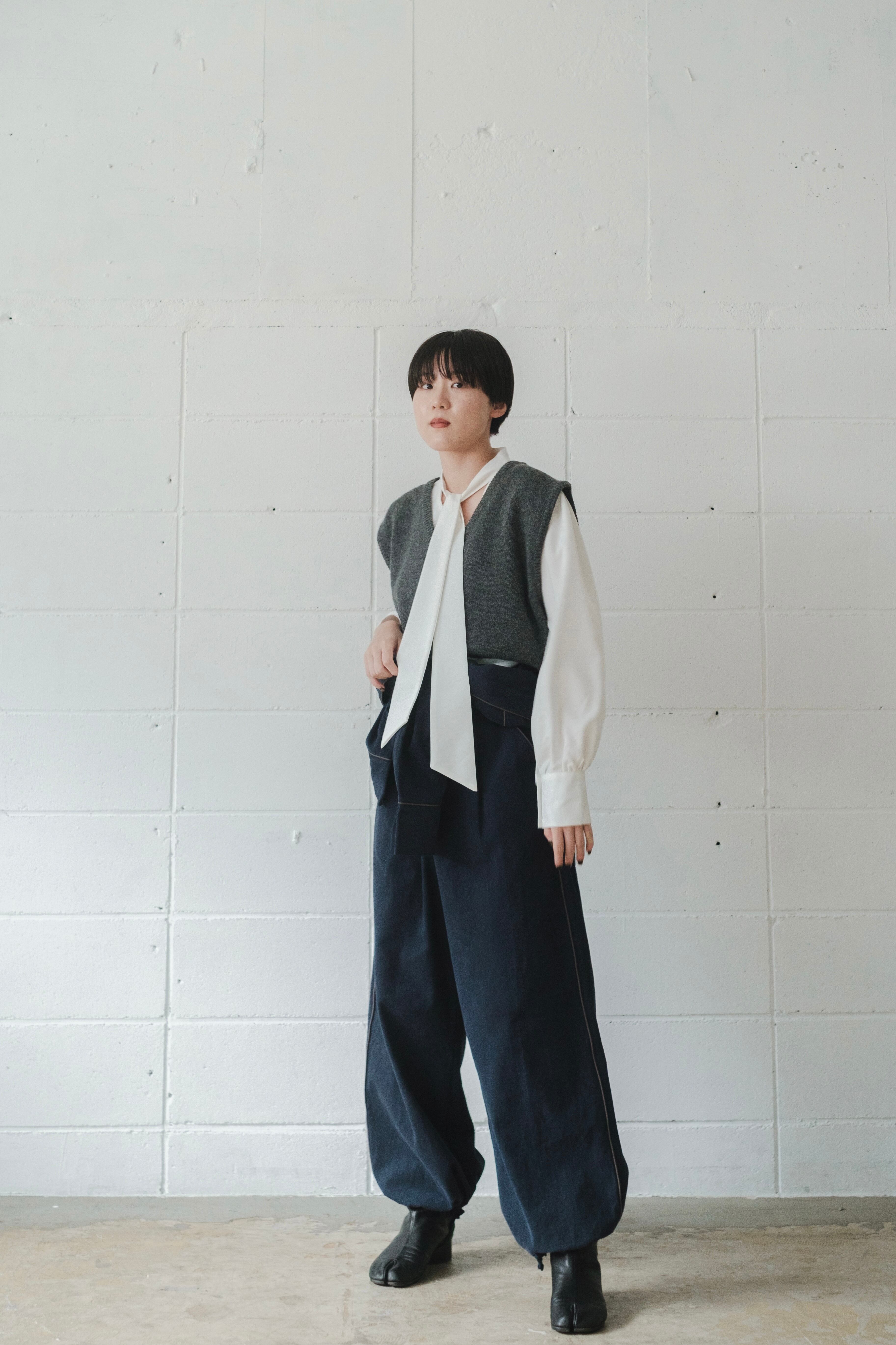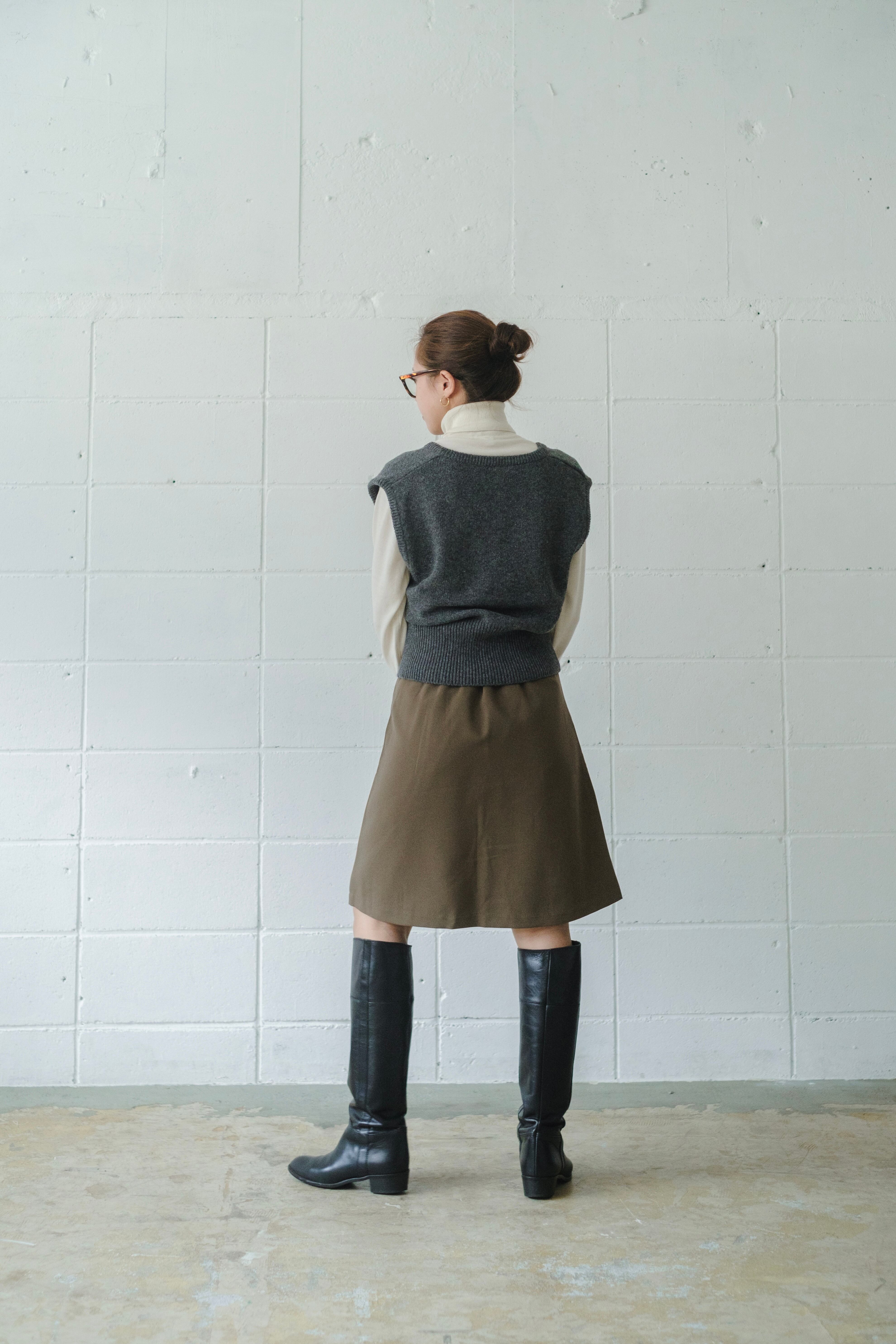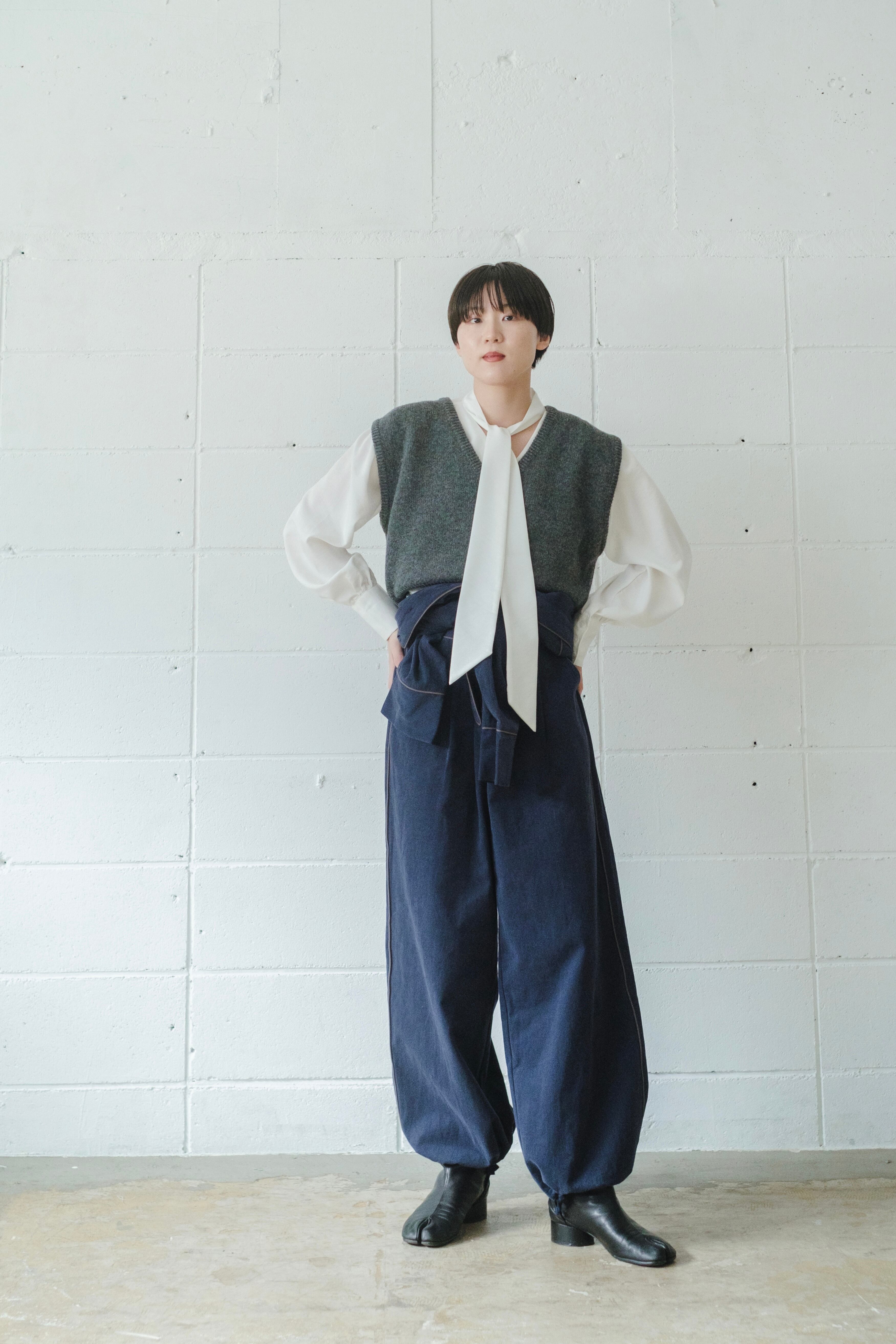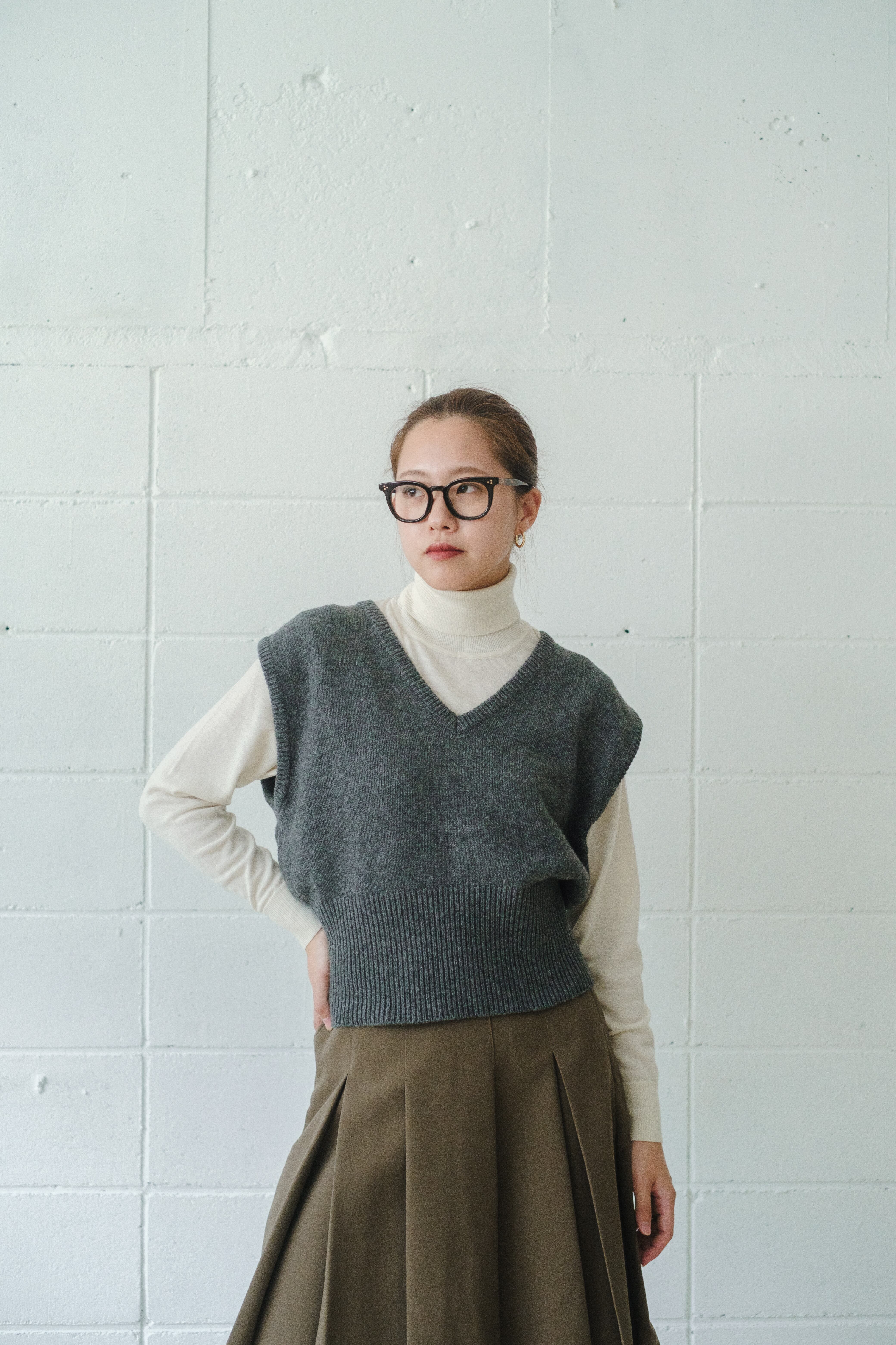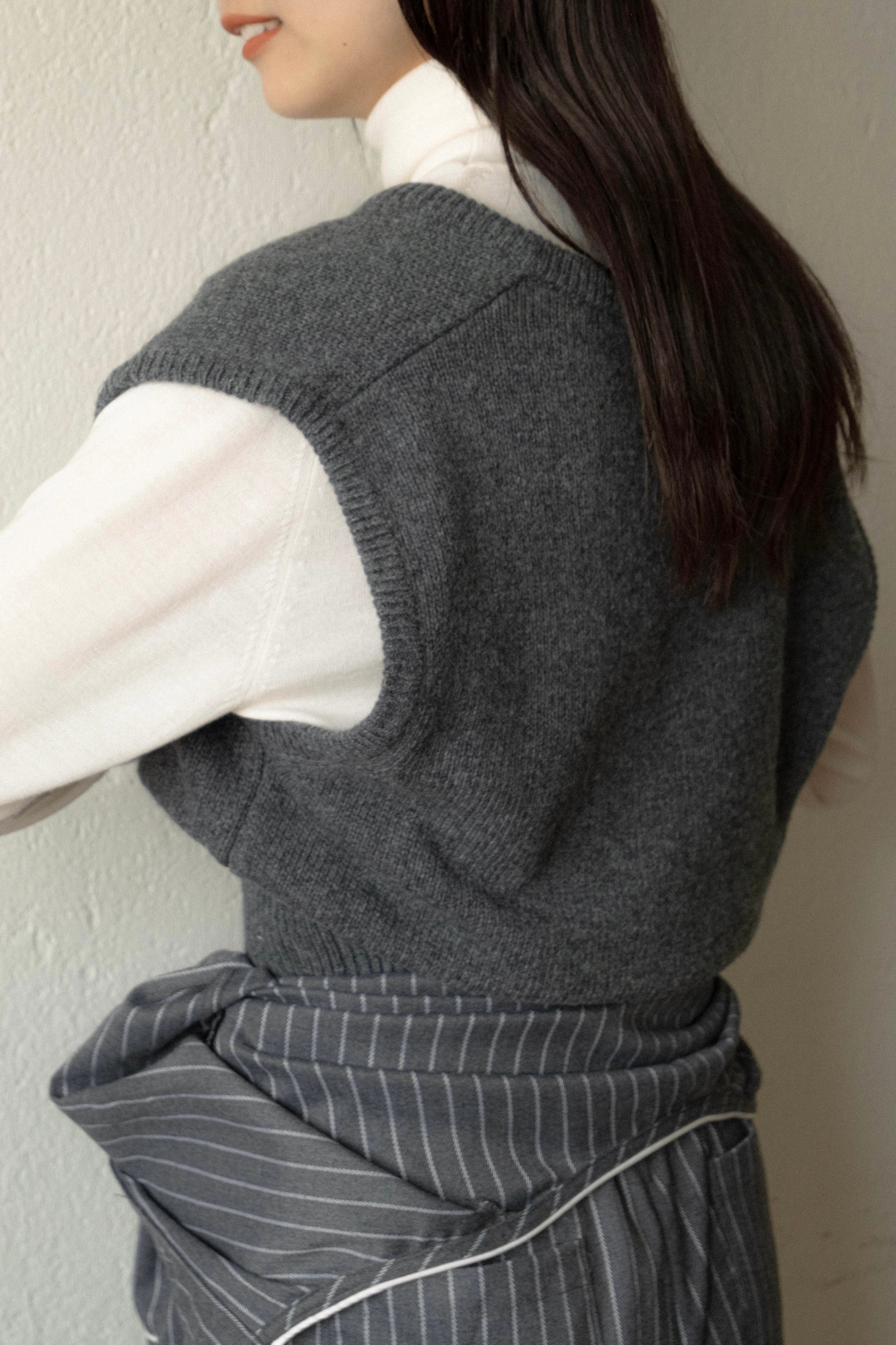 シンプルのようで、着るとシルエットが面白いニットベストです。