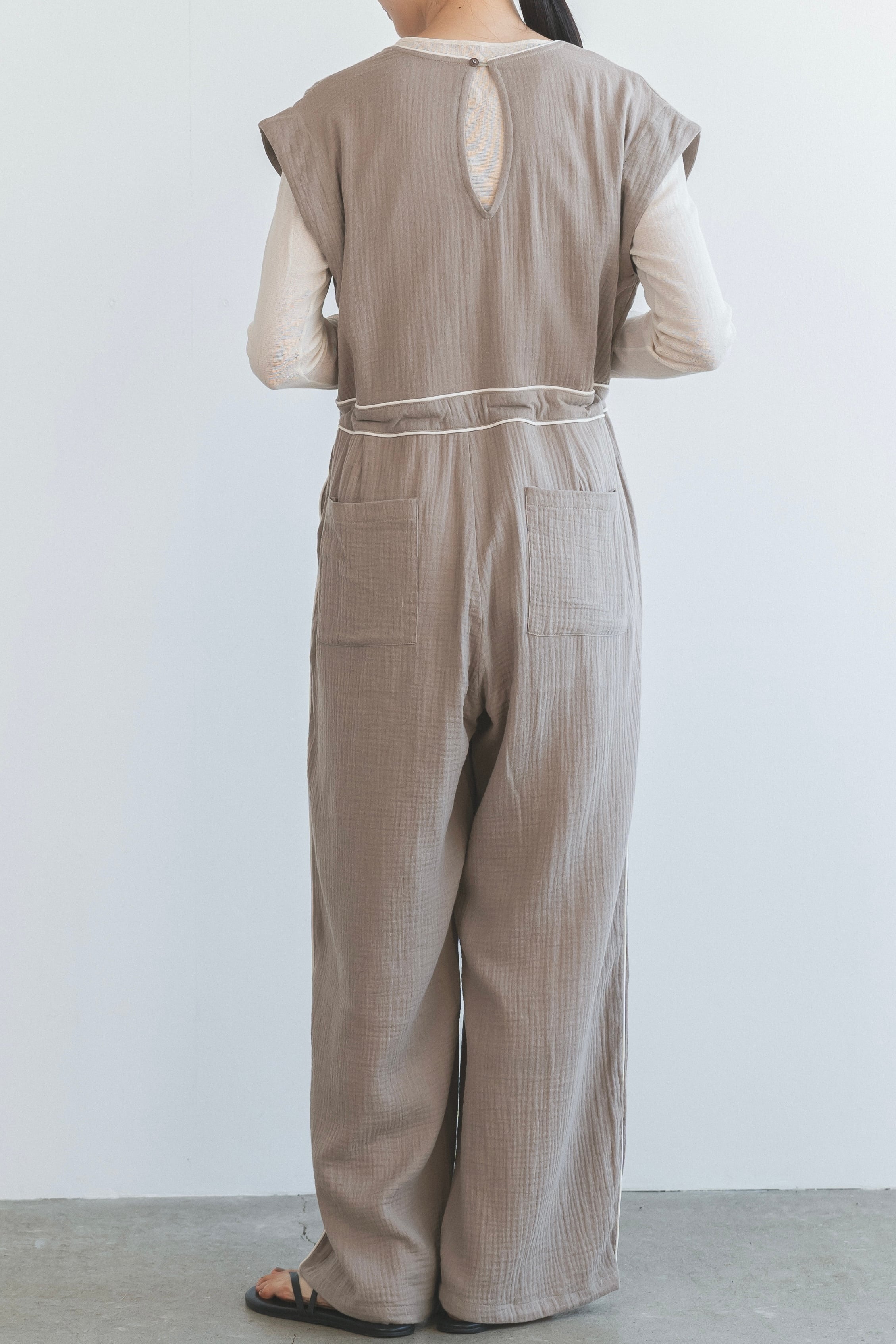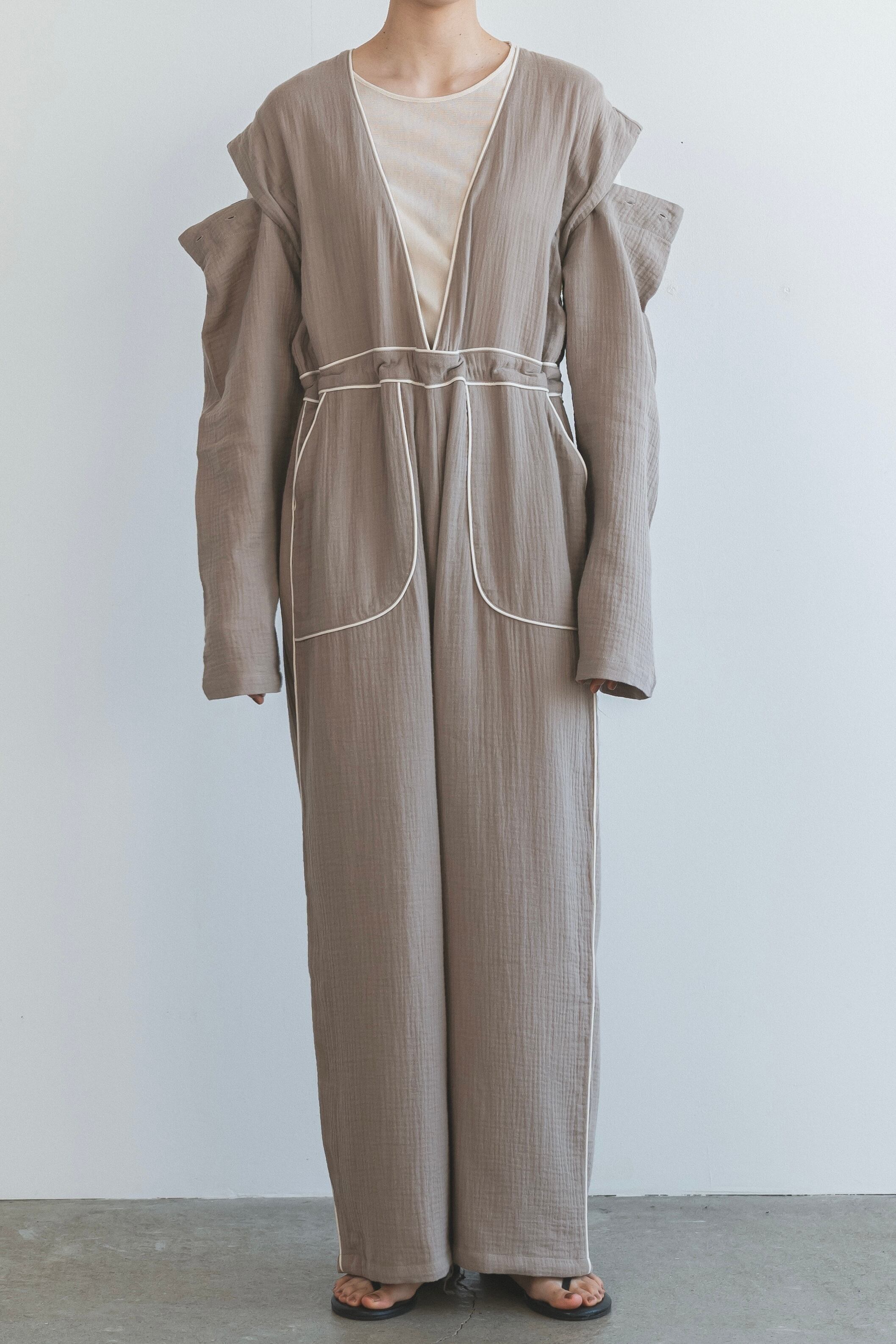 お馴染みのパイピングパジャマのデザインを、オールインワンに落とし込みました。