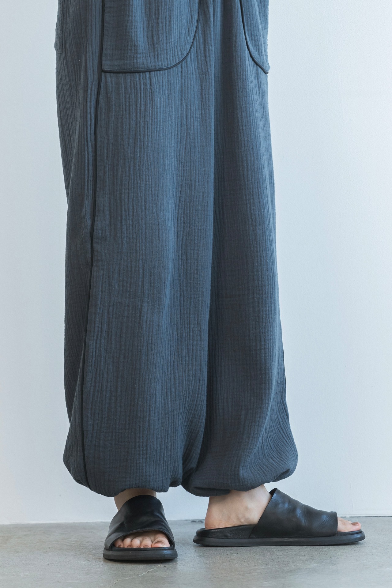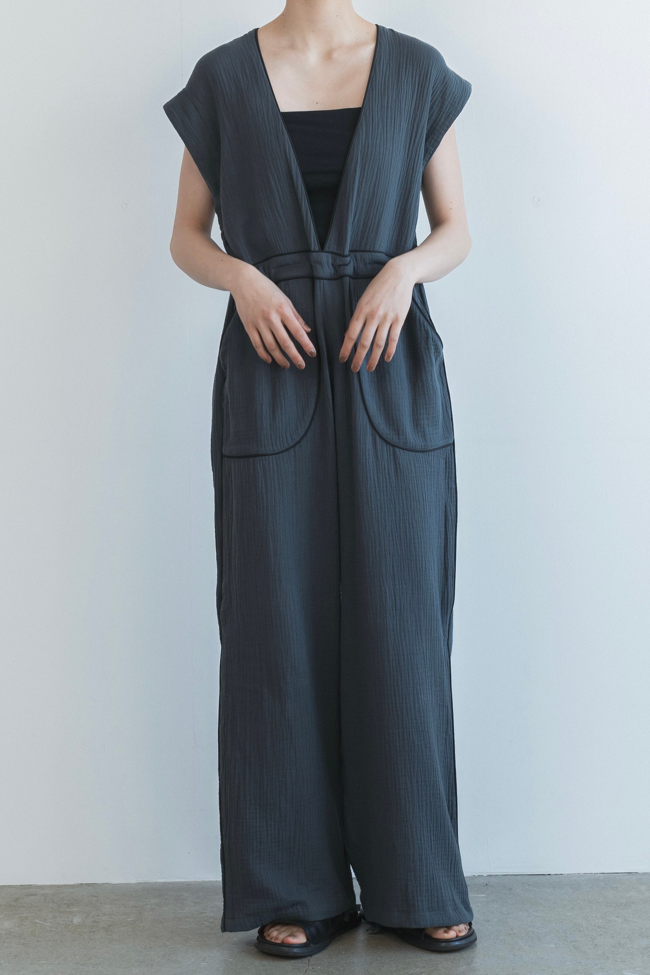 お馴染みのパイピングパジャマのデザインを、オールインワンに落とし込みました。
