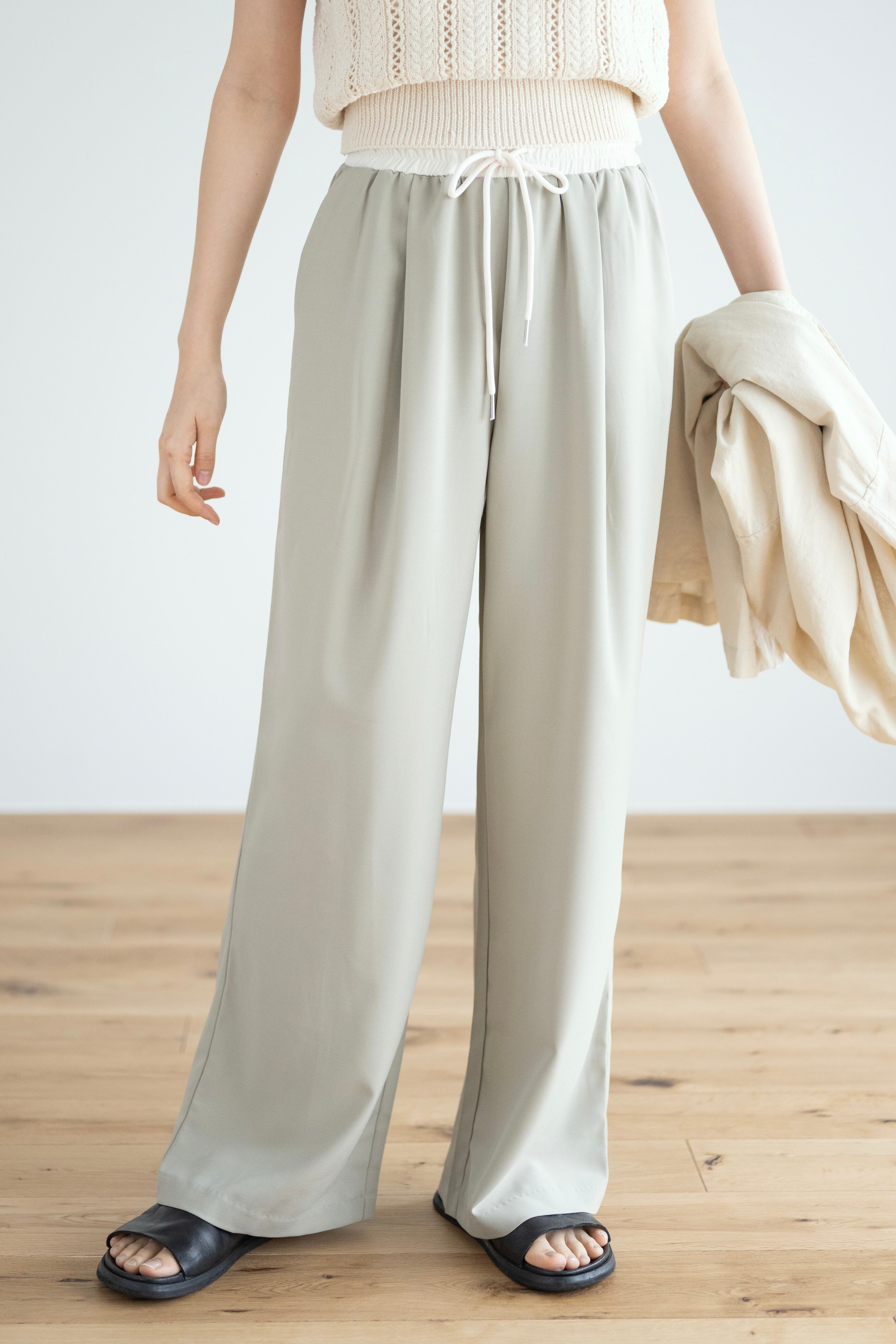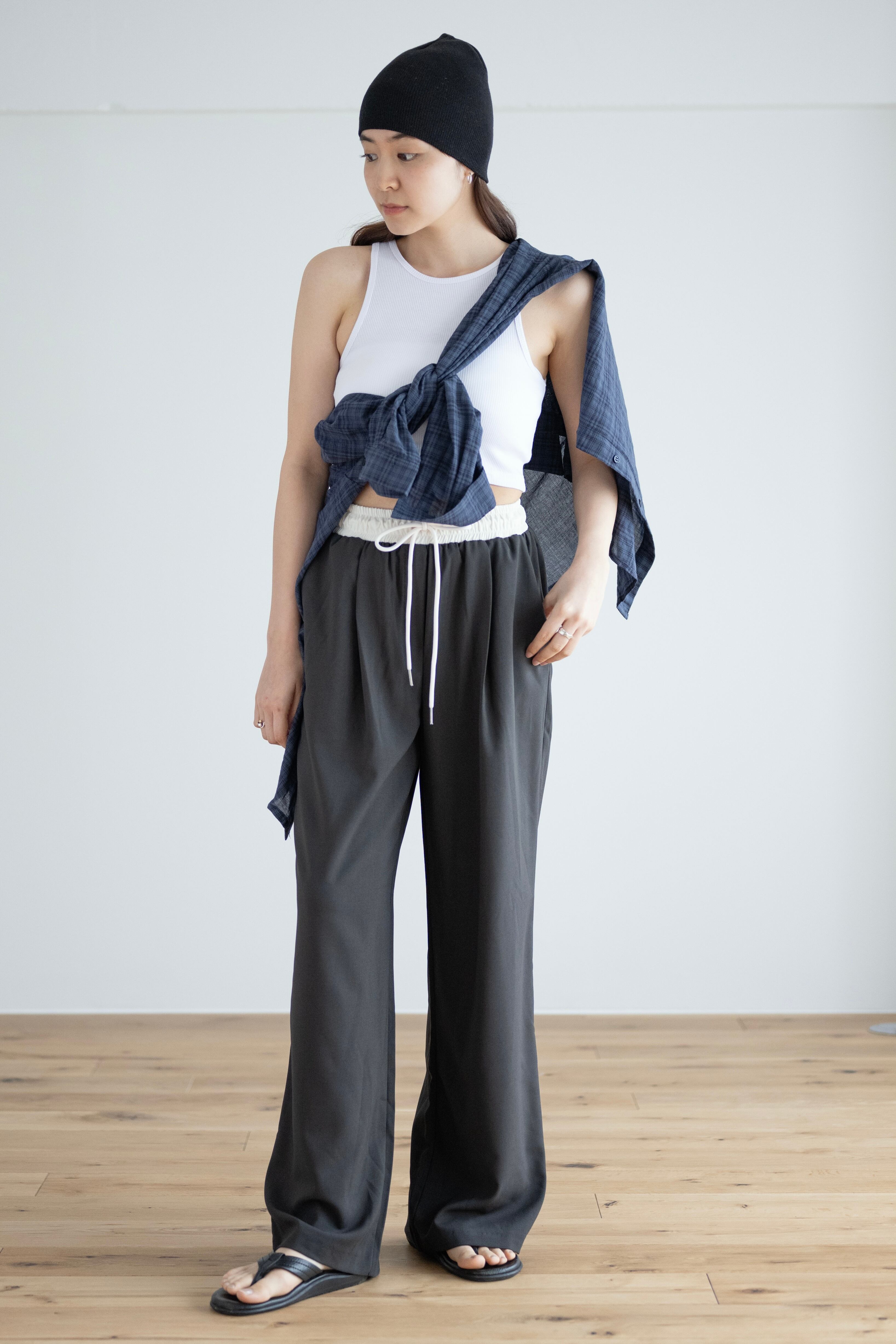 ウエストはゴムで楽ちんですが、落ち感のある綺麗なシルエット。リラックスして履けるけれど、綺麗見えするパンツです。