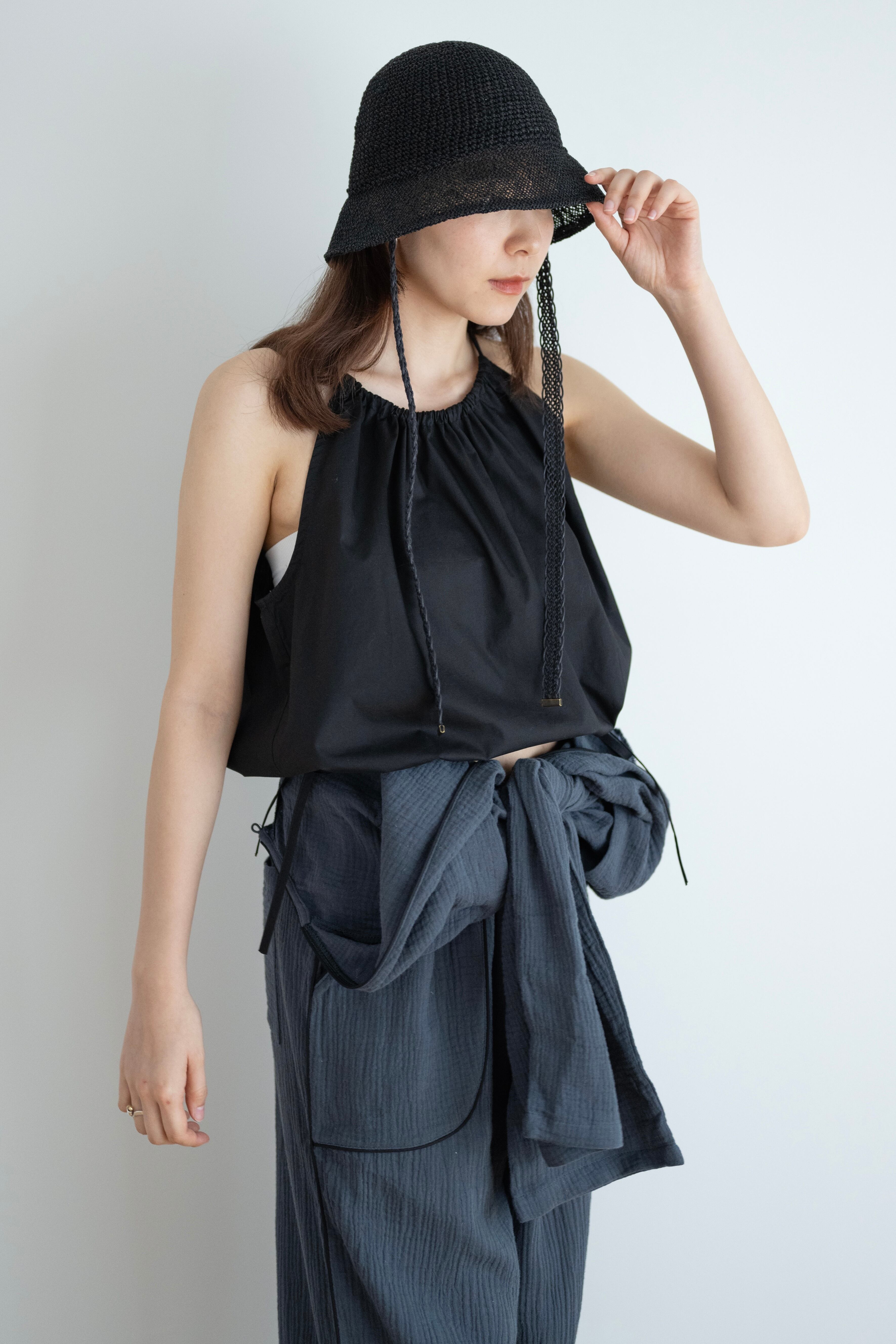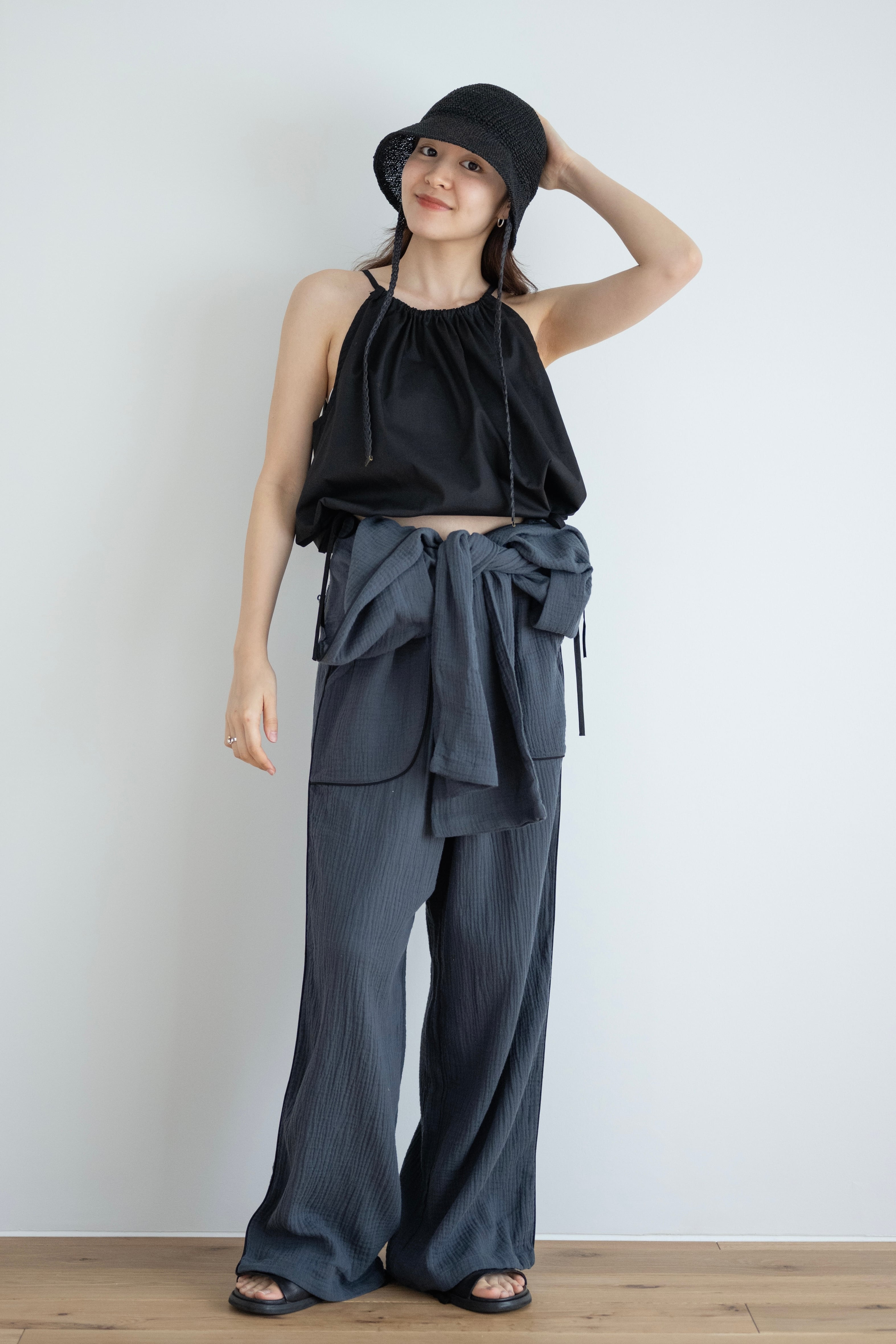 裾(すそ)の絞りで、好みのシルエットに変化させて切られるブラウス。バルーンシルエットが可愛いです。Tシャツの上に、重ね着するのも◎