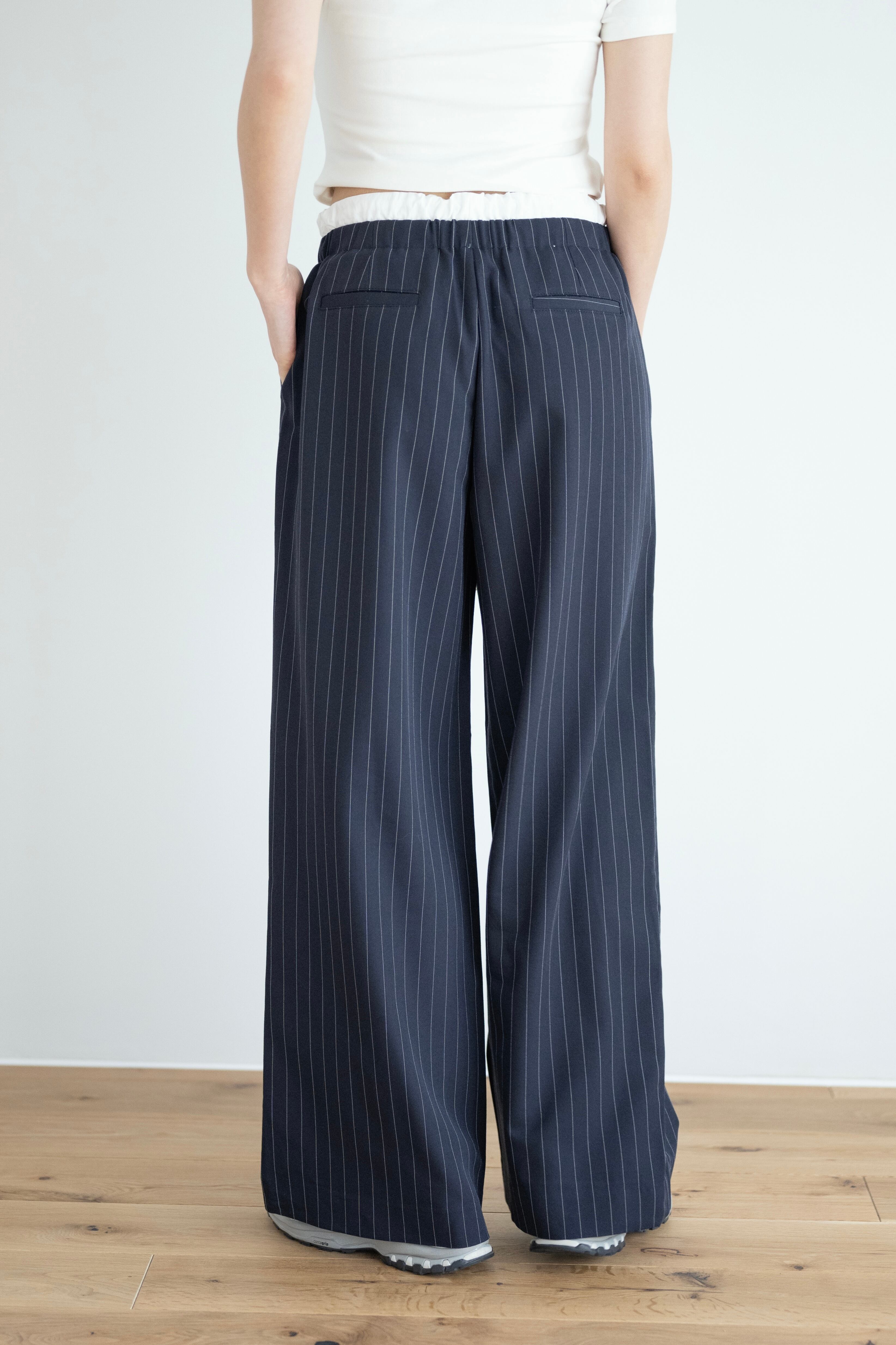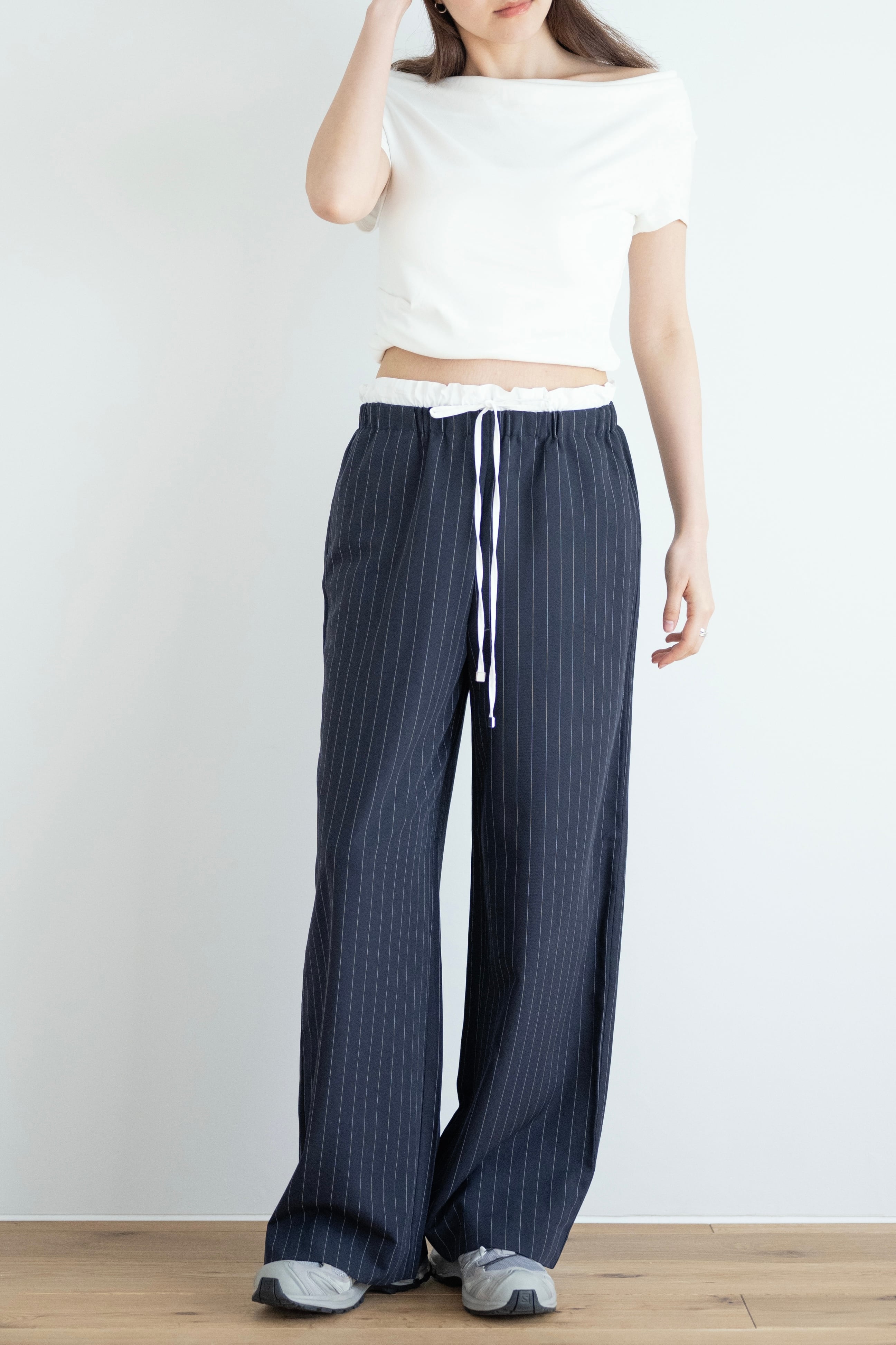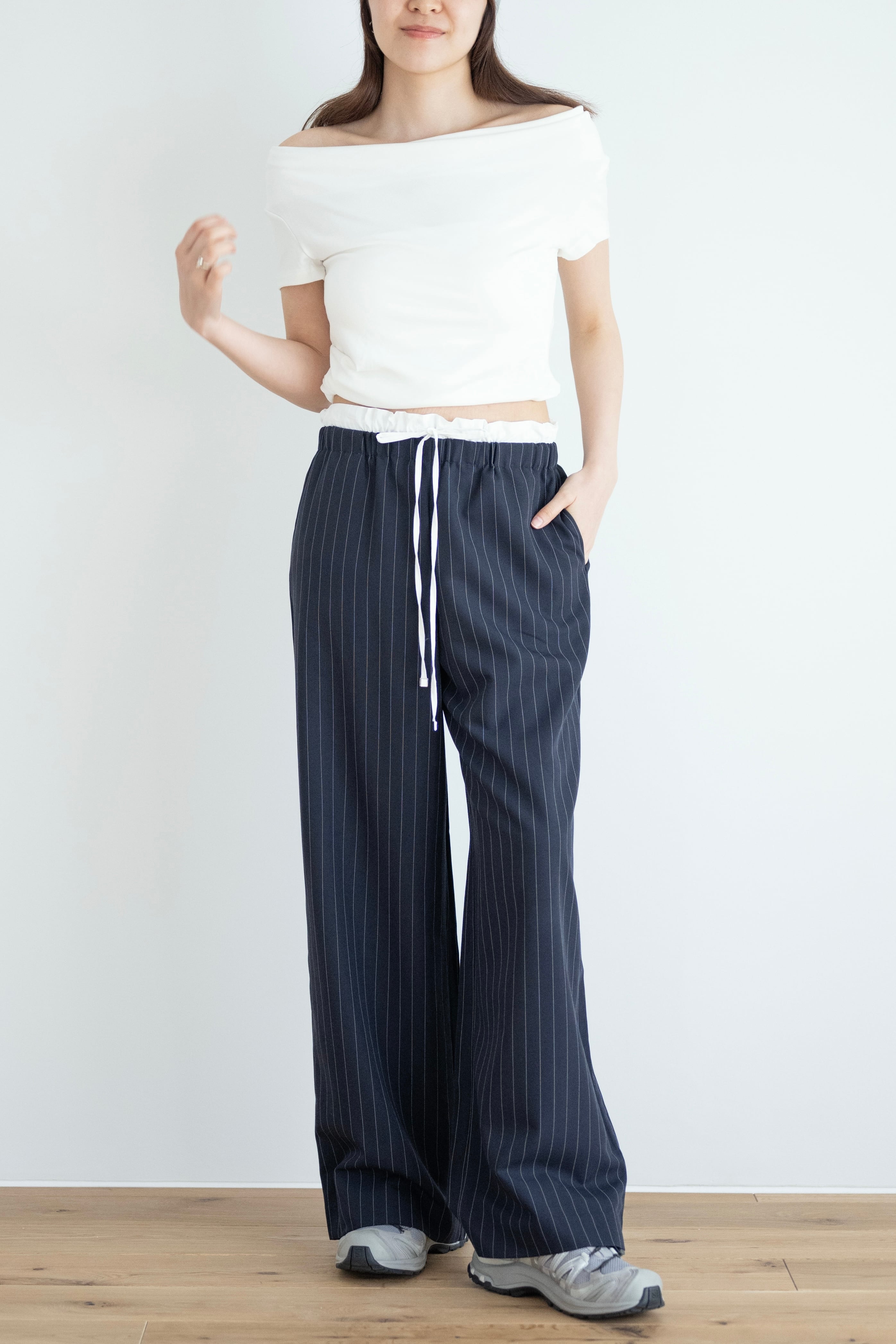 ウエストがレイヤード前するデザインのイージーパンツ。ウエストはゴムで楽々仕様ですが、落ち感があり綺麗見えするシルエット。