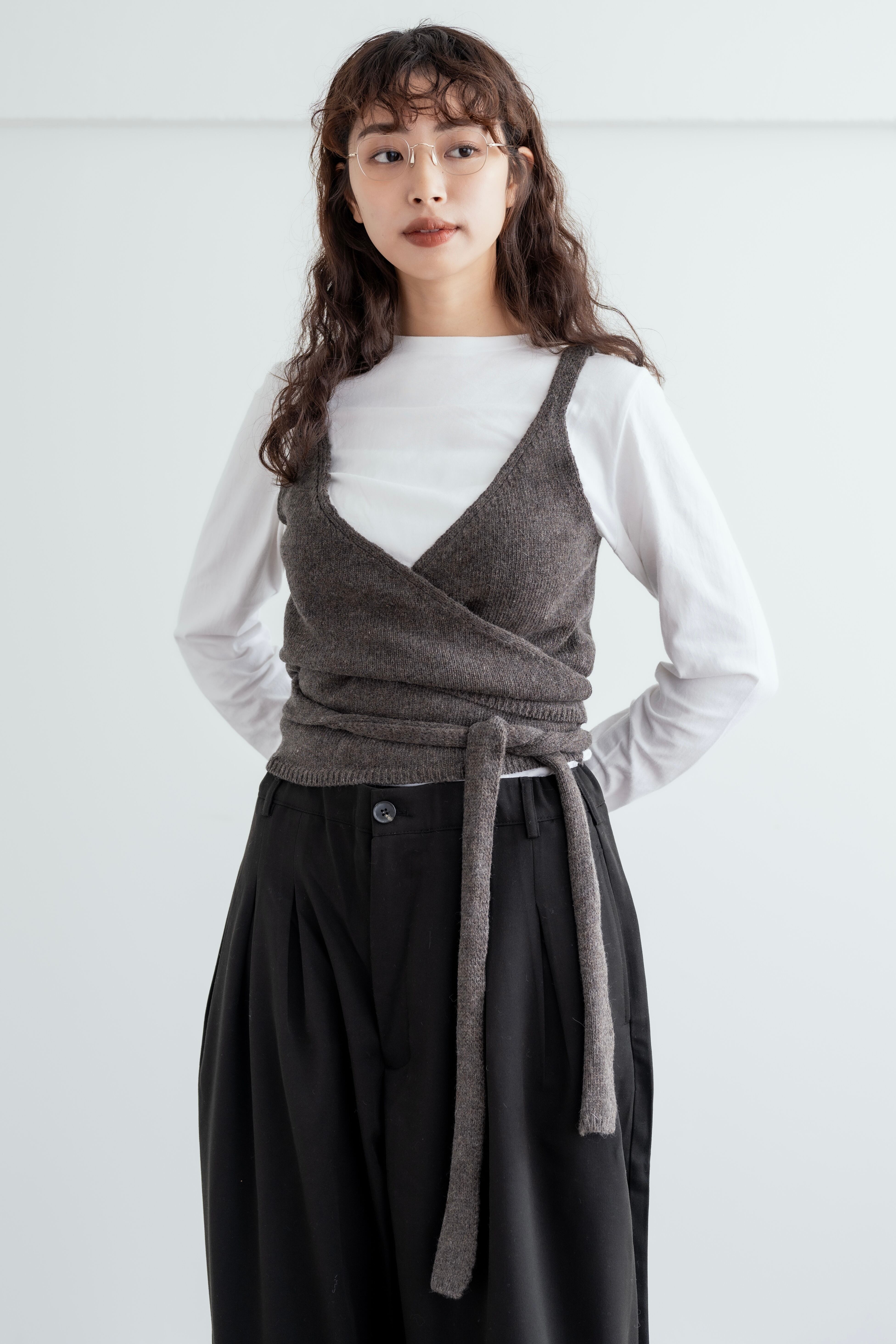 紐は、正面や斜め前、バックで結ぶことができて、コーディネートに合わせて着方を変えることができます。Tシャツ、シャツ、タートルなどと相性◎です。